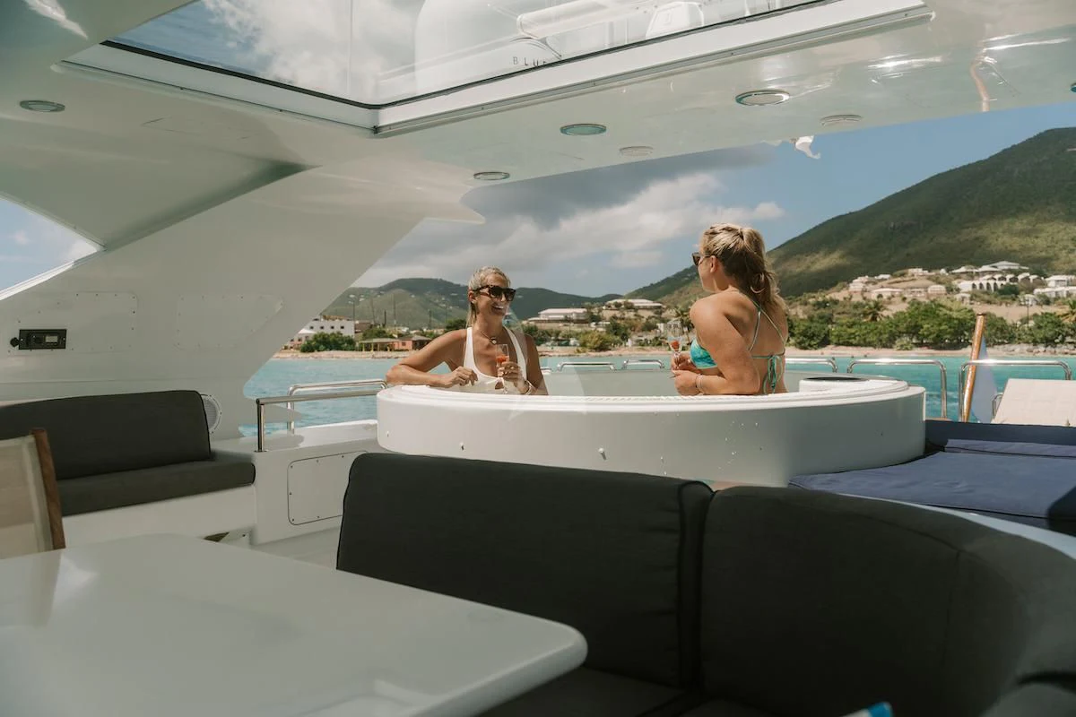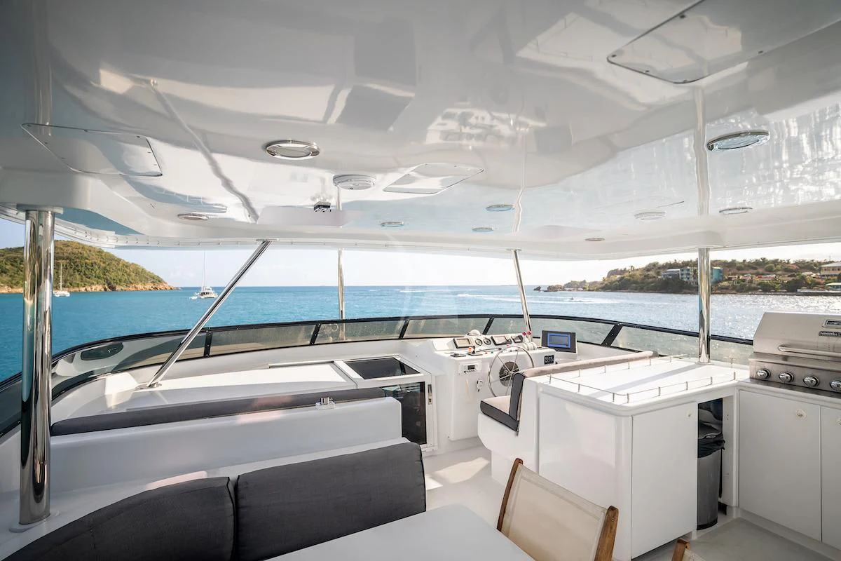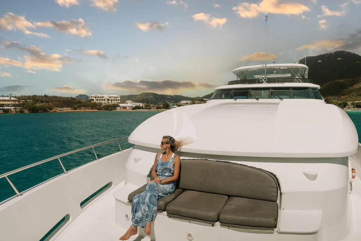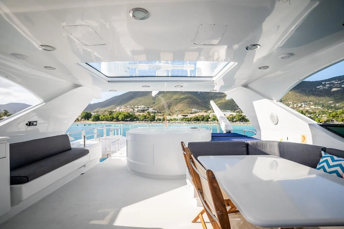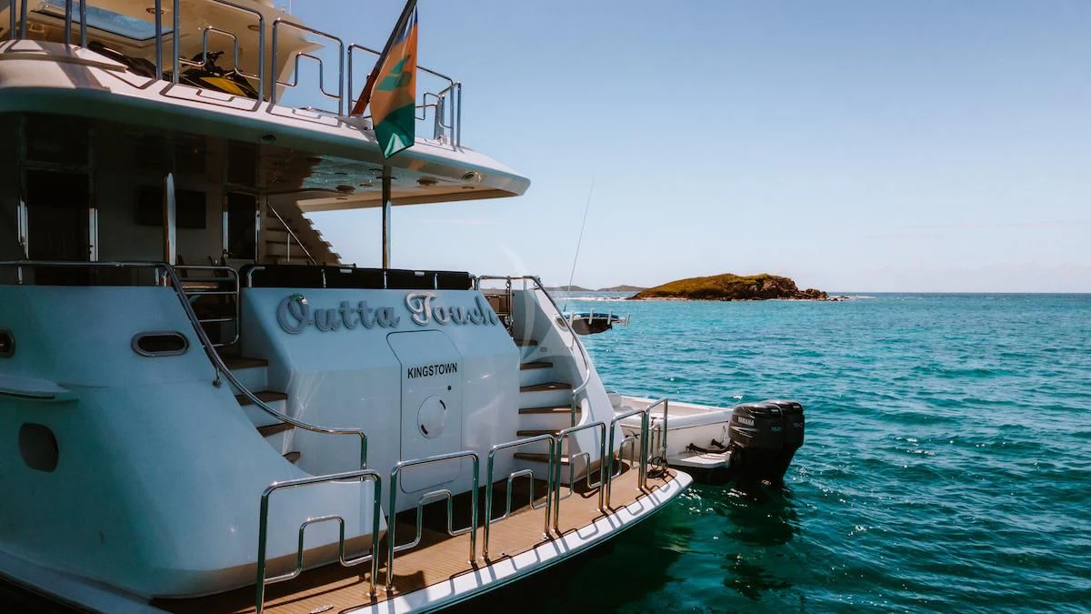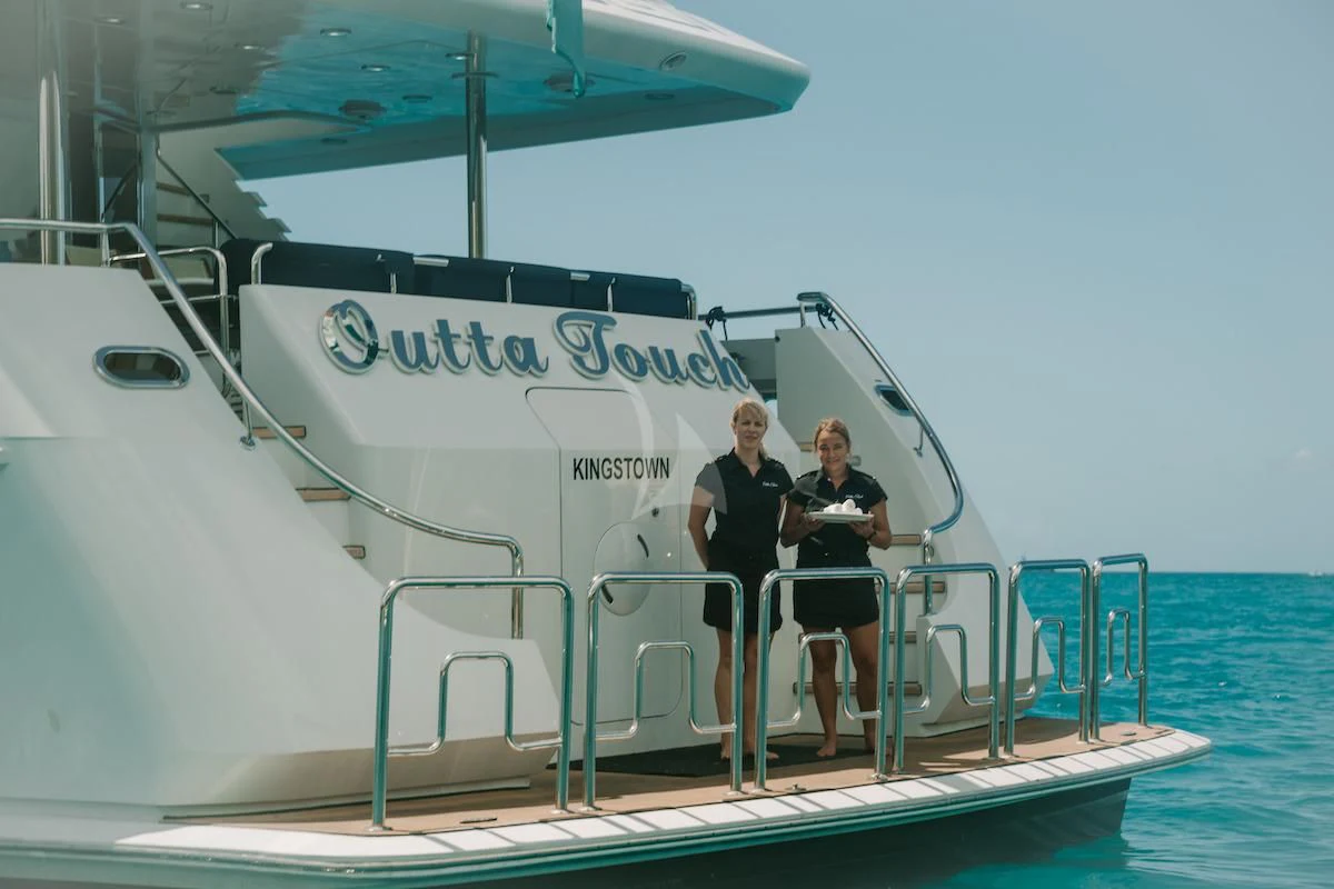 The exterior design of OUTTA TOUCH exudes grandeur, with its sleek lines and expansive decks providing ample space for relaxation and entertainment. Among her notable features are underwater lights that illuminate the surrounding waters during nighttime voyages, creating an enchanting atmosphere on board. A Jacuzzi on deck offers guests a chance to unwind while taking in breathtaking ocean views, while stabilizers ensure smooth sailing even under rough conditions.
