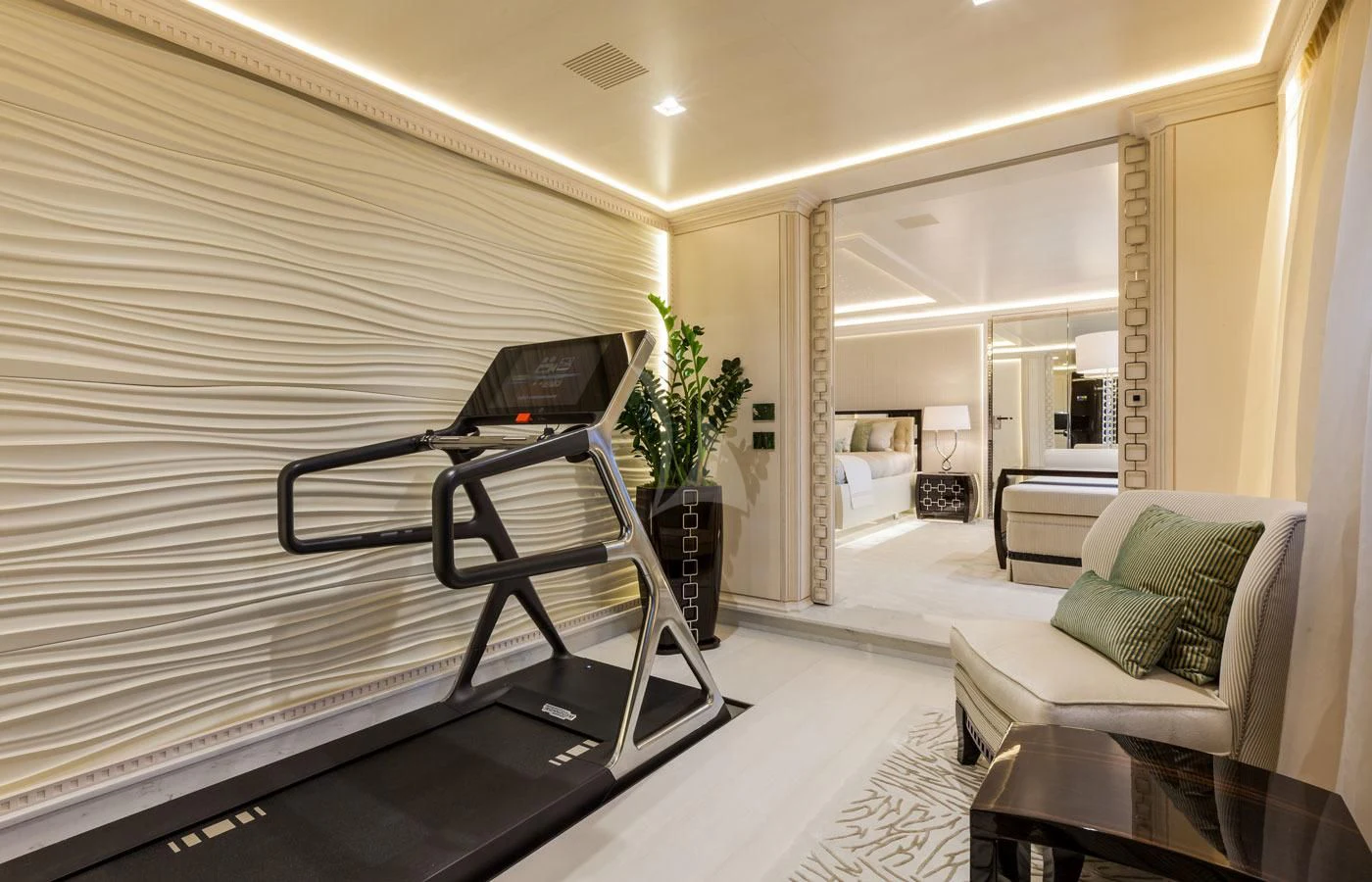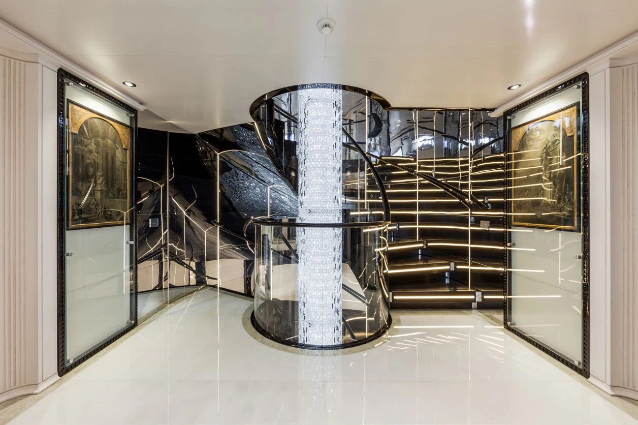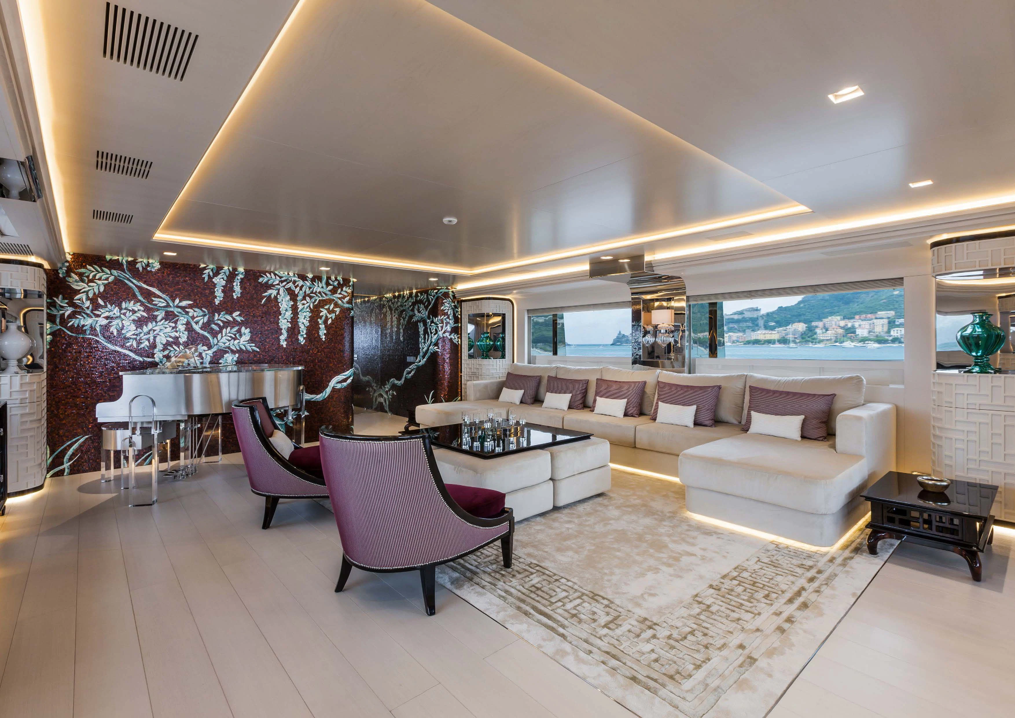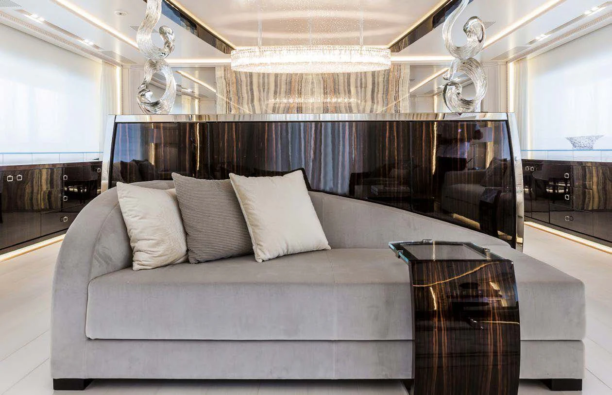Stepping inside PARILLION unveils an interior that exudes sophistication and tranquility. Five sumptuous cabins provide accommodation for up to ten guests, each haven tastefully adorned with luxurious furnishings and top-tier amenities such as Wi-Fi connectivity throughout. The master stateroom stands out as a lavish retreat complete with opulent decor elements that embody refined taste and style - truly fit for royalty aboard this princely vessel! Complementing these private spaces are communal areas like the main salon where guests can gather for cocktails or quiet conversation; a dedicated gym offering state-of-the-art equipment for those keen on keeping their fitness routines intact; even movie nights become unforgettable experiences within PARILLION's exclusive onboard cinema.