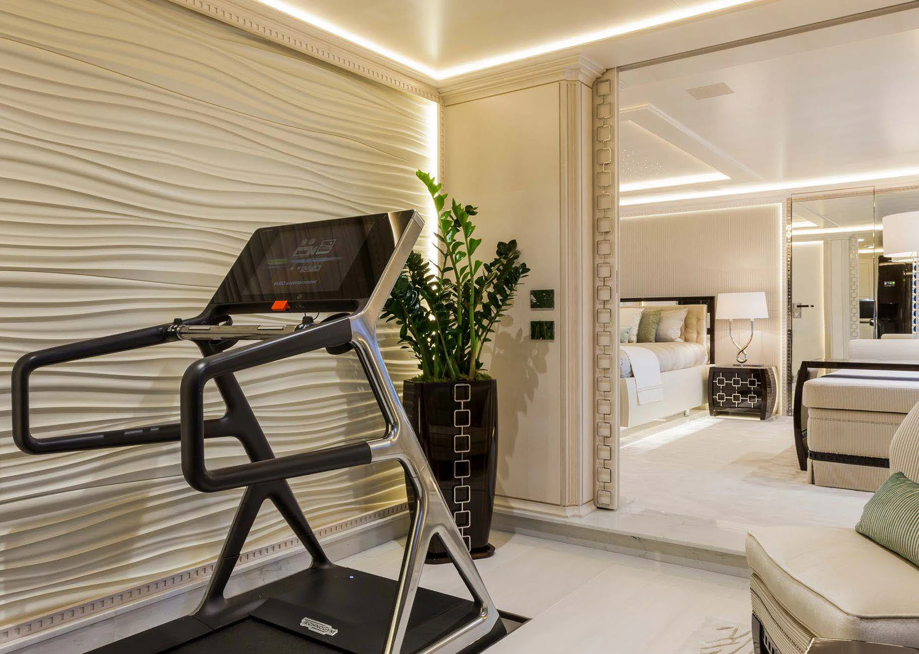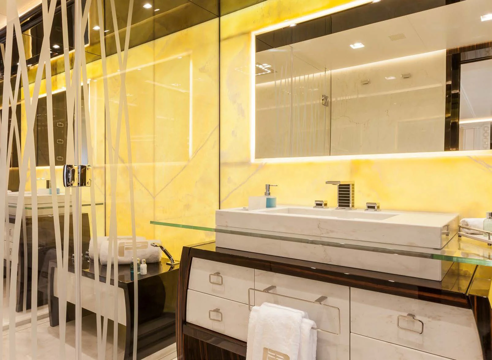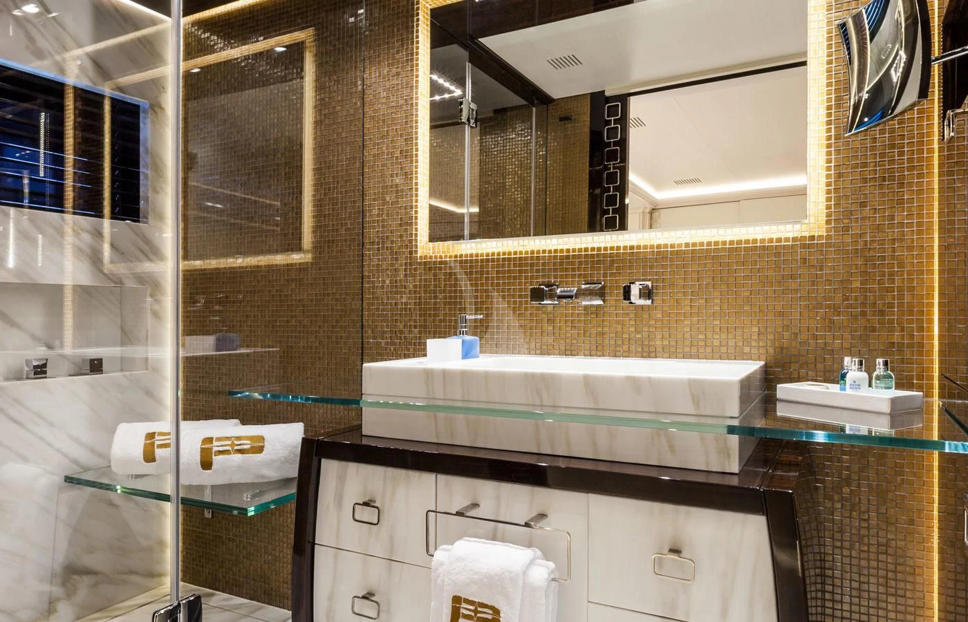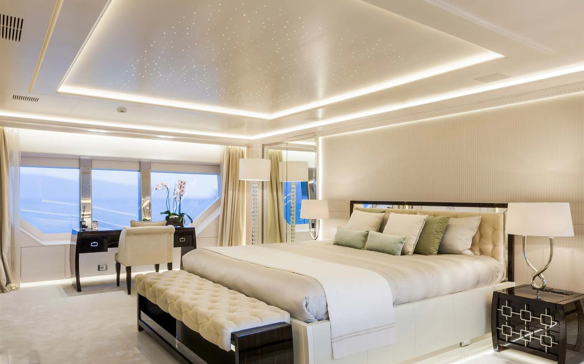 Stepping inside PARILLION unveils an interior that exudes sophistication and tranquility. Five sumptuous cabins provide accommodation for up to ten guests, each haven tastefully adorned with luxurious furnishings and top-tier amenities such as Wi-Fi connectivity throughout. The master stateroom stands out as a lavish retreat complete with opulent decor elements that embody refined taste and style - truly fit for royalty aboard this princely vessel! Complementing these private spaces are communal areas like the main salon where guests can gather for cocktails or quiet conversation; a dedicated gym offering state-of-the-art equipment for those keen on keeping their fitness routines intact; even movie nights become unforgettable experiences within PARILLION's exclusive onboard cinema.