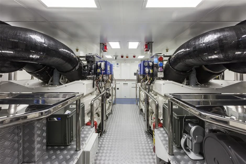 When it comes to action-packed water adventures or leisurely exploration along pristine coastlines, PARILLION does not disappoint either. Her inventory boasts an array of water toys guaranteed to thrill both young and old alike - from jet skis that zoom across sparkling waters to paddleboards ideal for peaceful mornings spent gliding over serene seascape backdrops. Further enhancing her appeal are two powerful MTU engines delivering combined horsepower of approximately 3460 hp /2580 kW – capable enough to propel this magnificent vessel towards any horizon beckoning her forth! With fuel capacity standing at around 11889 gallons (45000 liters), long-distance voyages become possibilities rather than mere dreams aboard this remarkable yacht.