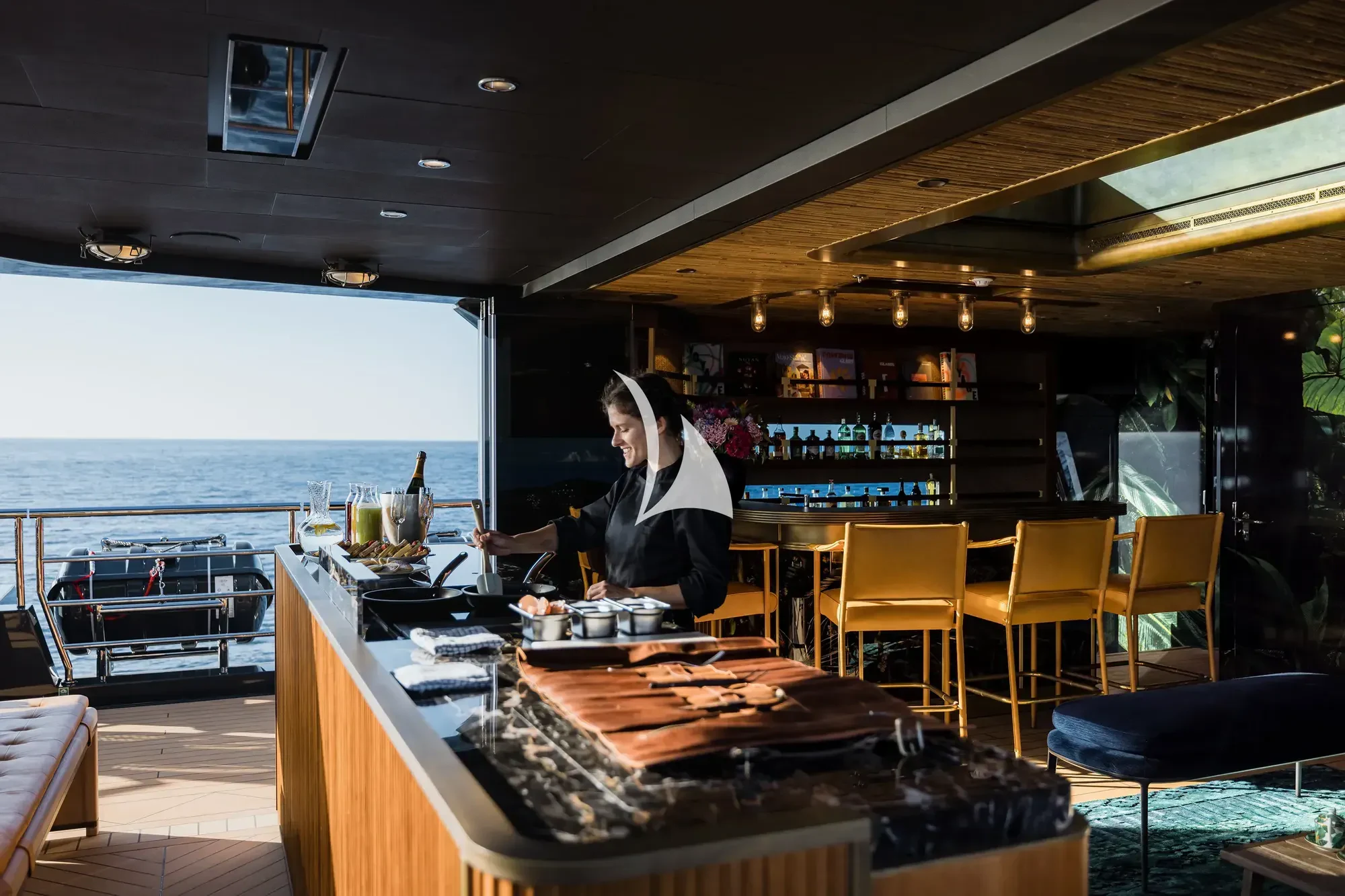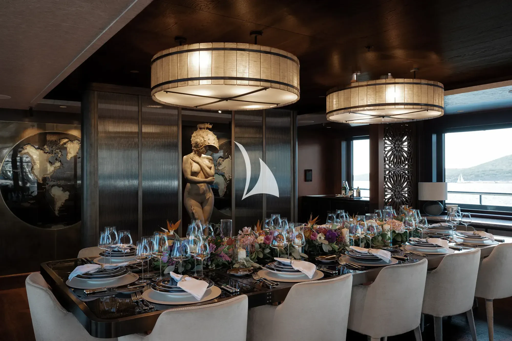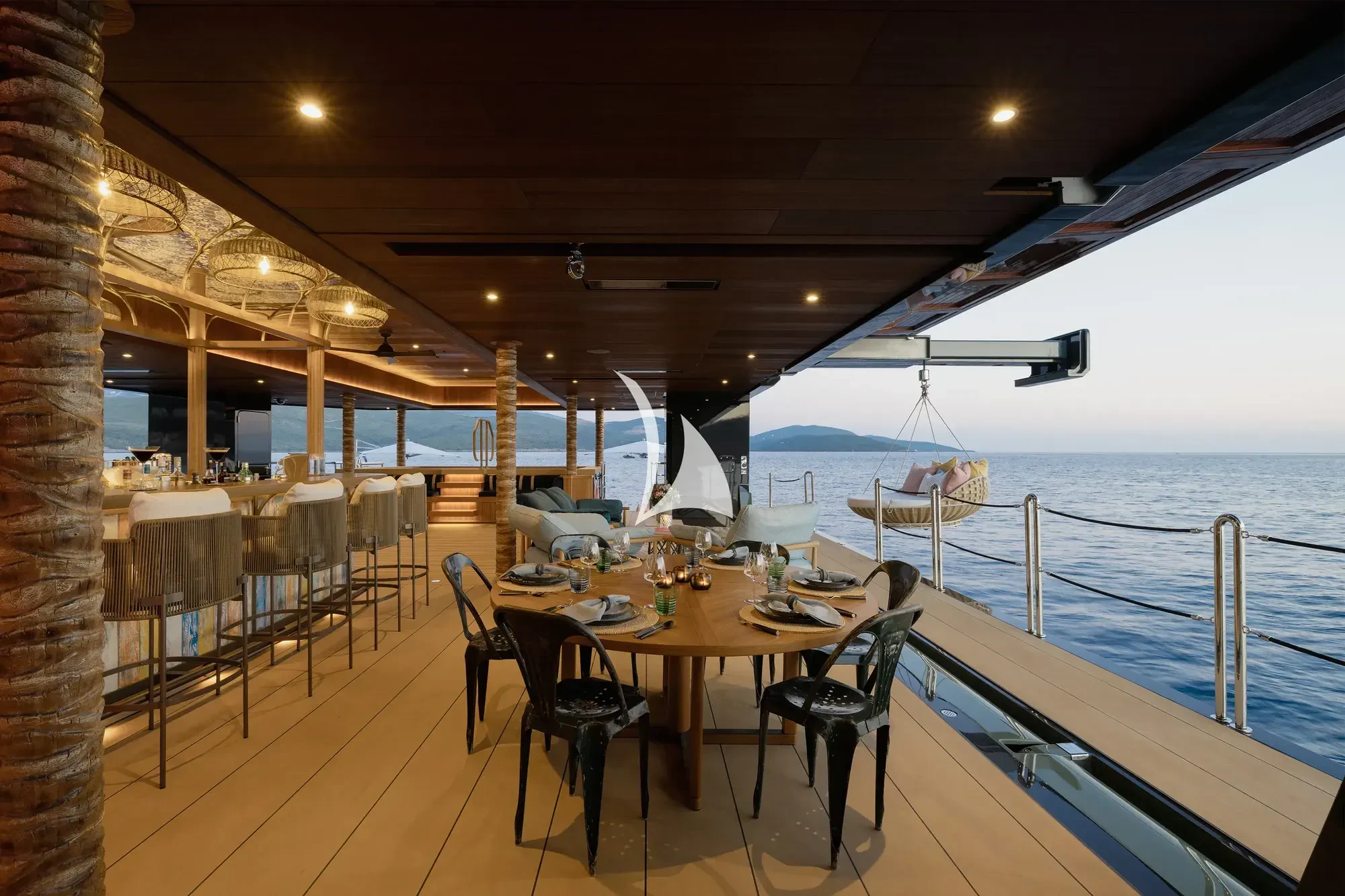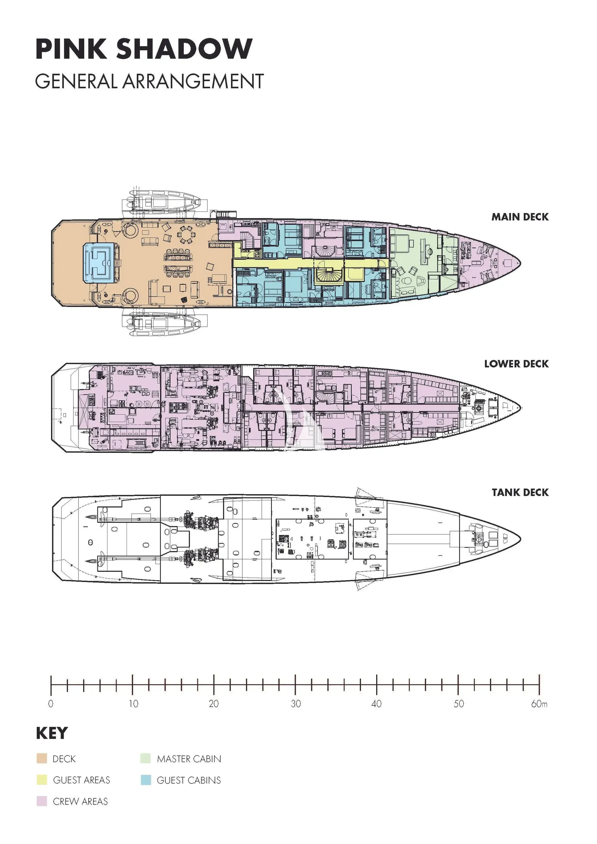 Step aboard PINK SHADOW and you'll find yourself surrounded by six luxurious cabins designed to accommodate up to twelve guests in utter comfort, ensuring privacy without compromising on space or luxury. An attentive crew team comprising eighteen members ensures every need is catered for during your voyage on this magnificent vessel.
