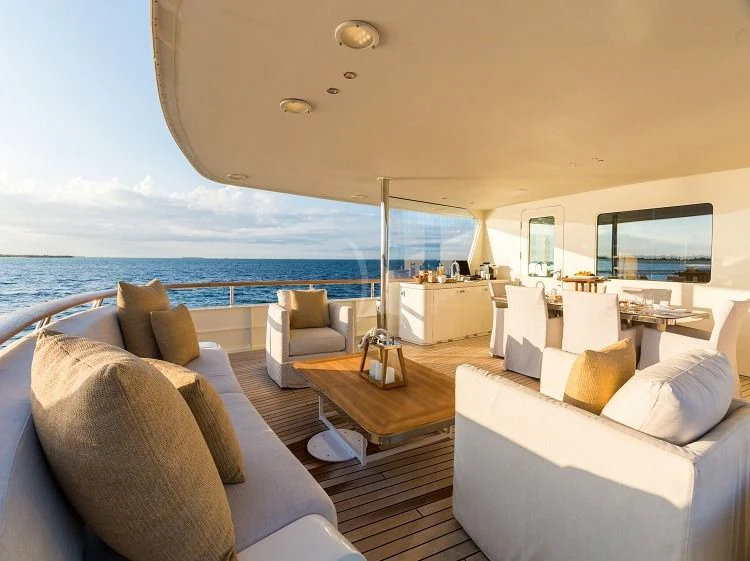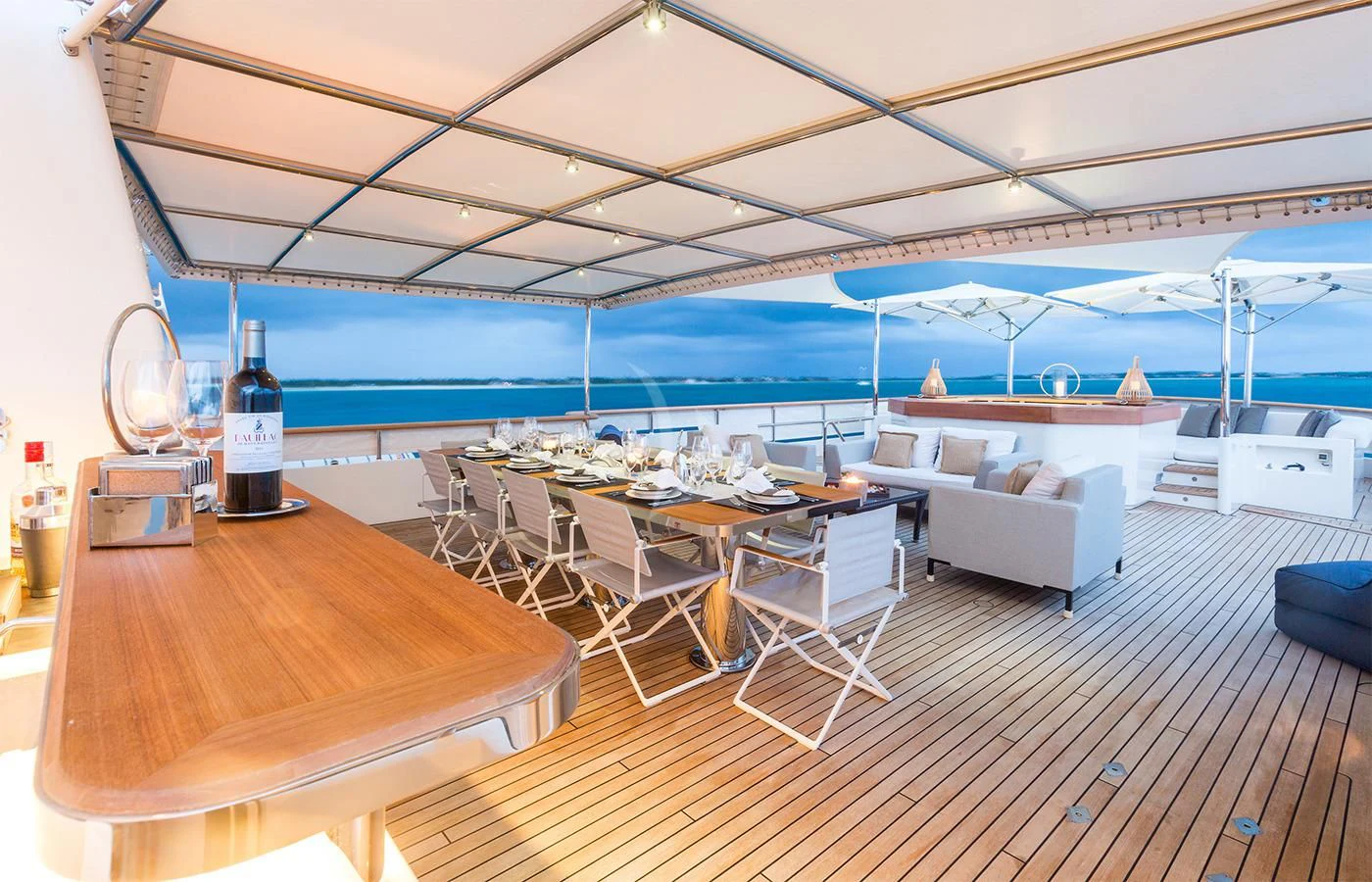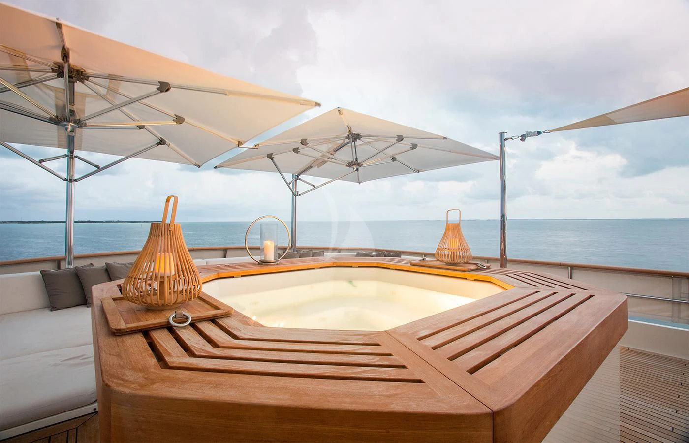 The exterior design of PIONEER is nothing short of breathtaking; she boasts a commanding presence on the water with her expansive beam stretching to 28 feet or around 8.8 meters in width. The sundecks are perfect for soaking up the sun while enjoying panoramic ocean views, whereas alfresco dining areas offer guests an unforgettable culinary experience under the stars. Notable exterior features include spacious lounging areas where guests can unwind and relax amidst plush furnishings and serene sea breezes.