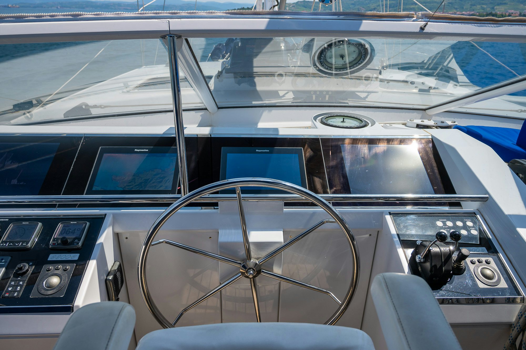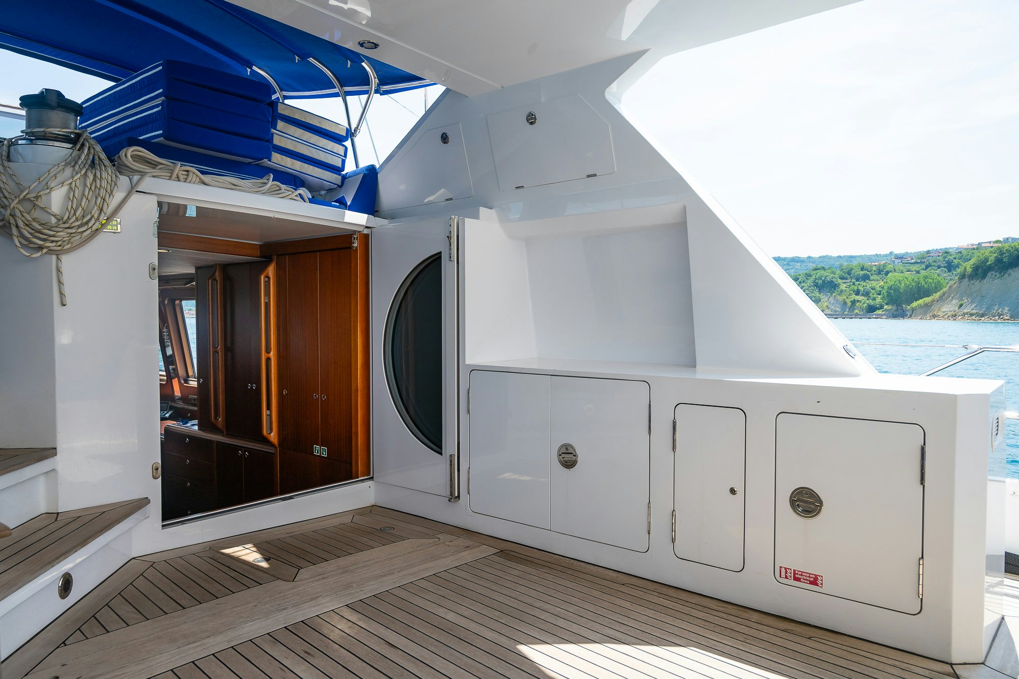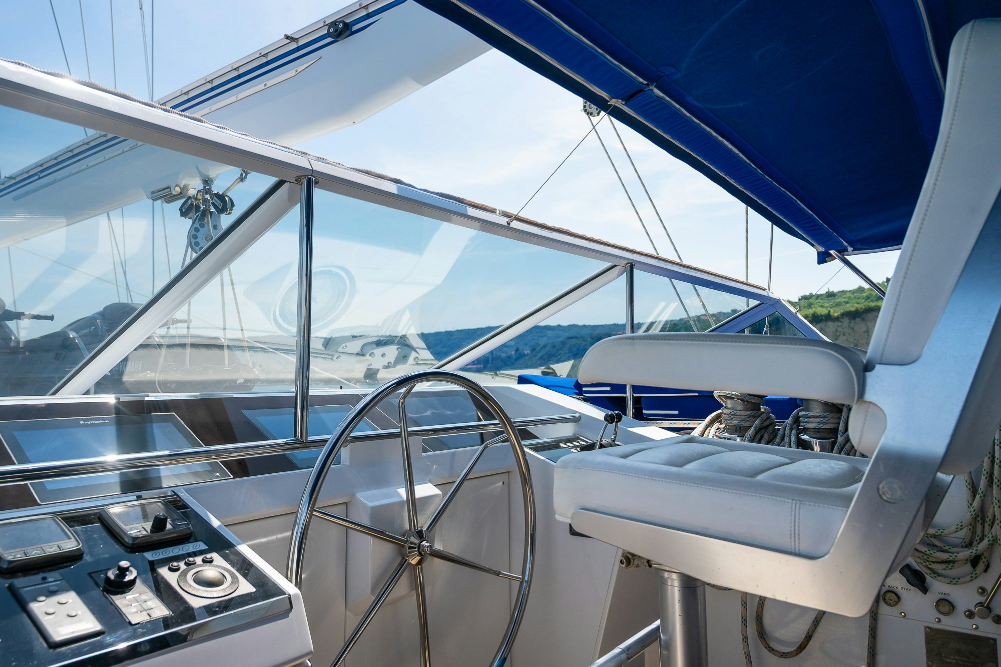 On deck, the yacht offers a spacious aft deck with a comfortable sitting area. An additional alfresco, shaded space is located forward, creating a unique exterior layout that enhances onboard flow and visibility. Her classic styling and deck arrangement support alfresco dining, lounging, and easy access throughout. The entire teak deck is in exceptional condition, showing no major signs of wear and maintaining impressive thickness (averaging 27–28mm) across all sections. Anti-slip surfaces and stainless hardware are clean and intact, and the custom helm station is fully equipped with upgraded Raymarine touchscreen navigation displays and controls.