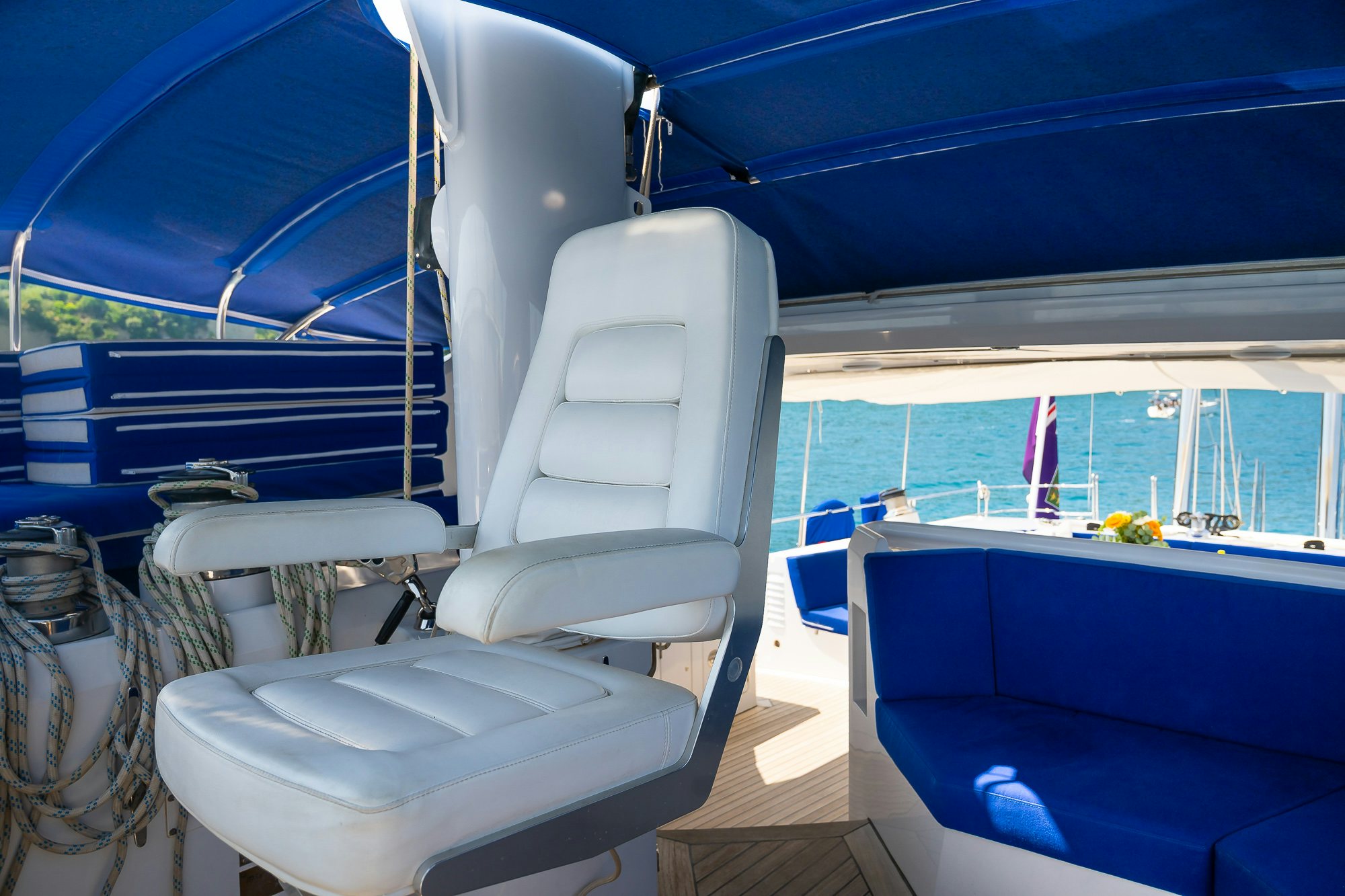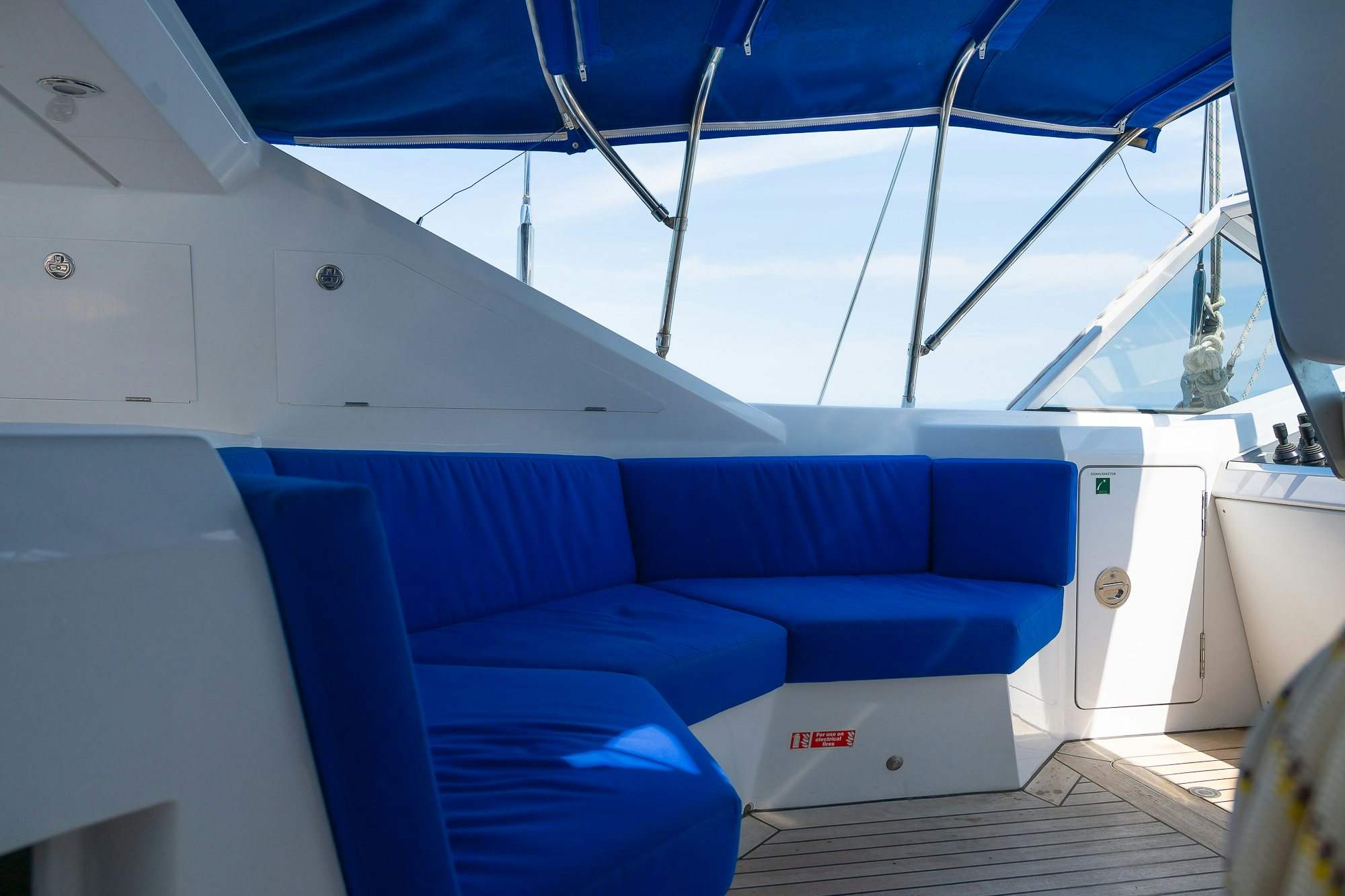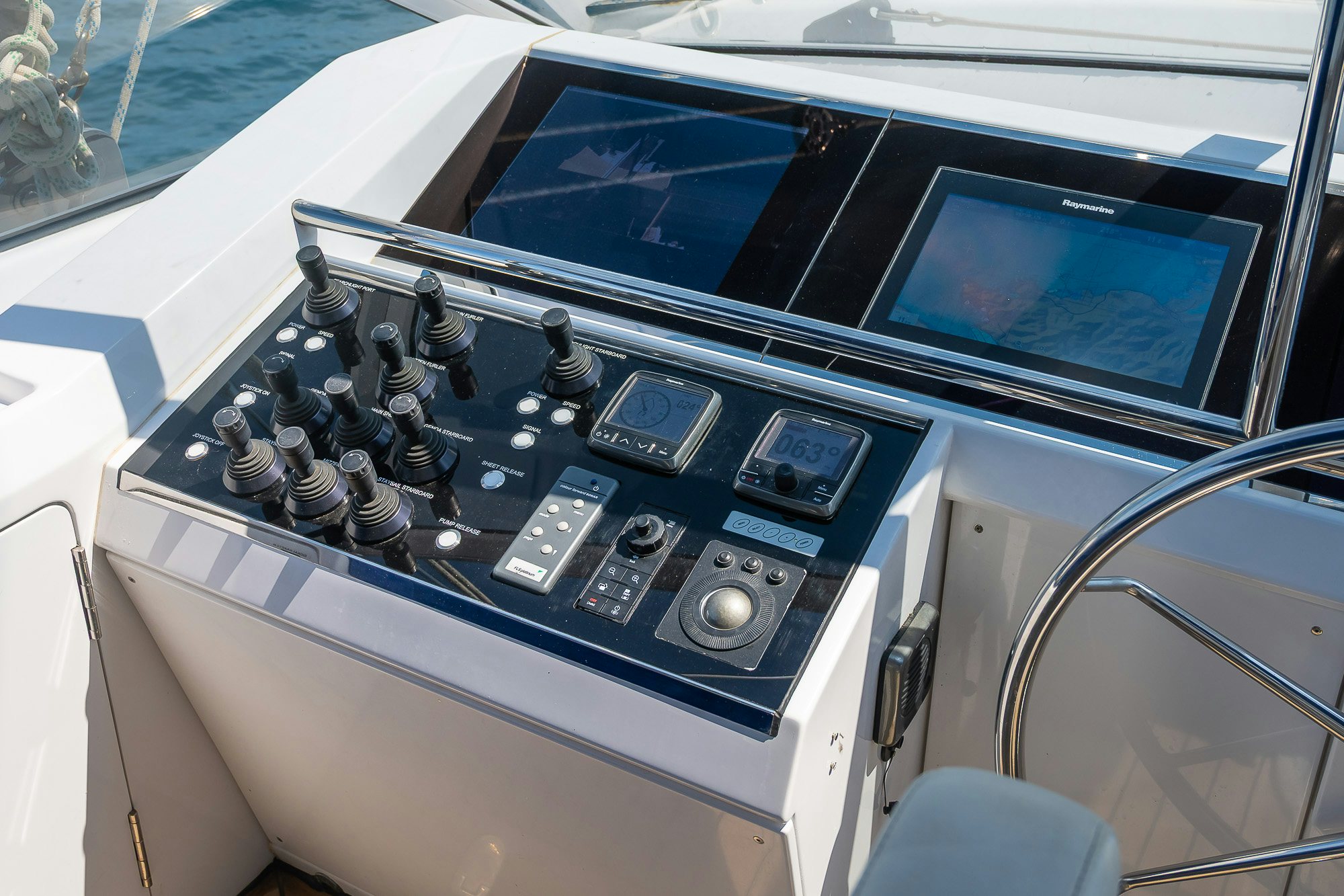 On deck, the yacht offers a spacious aft deck with a comfortable sitting area. An additional alfresco, shaded space is located forward, creating a unique exterior layout that enhances onboard flow and visibility. Her classic styling and deck arrangement support alfresco dining, lounging, and easy access throughout. The entire teak deck is in exceptional condition, showing no major signs of wear and maintaining impressive thickness (averaging 27–28mm) across all sections. Anti-slip surfaces and stainless hardware are clean and intact, and the custom helm station is fully equipped with upgraded Raymarine touchscreen navigation displays and controls.