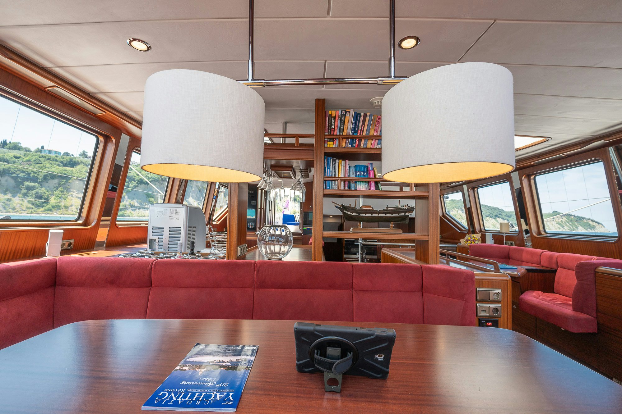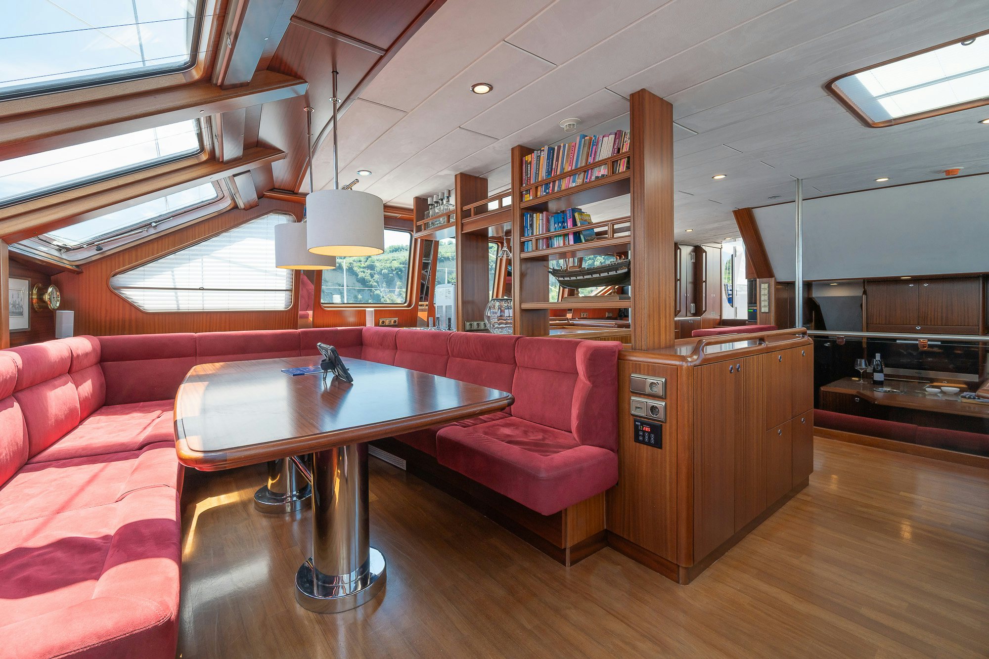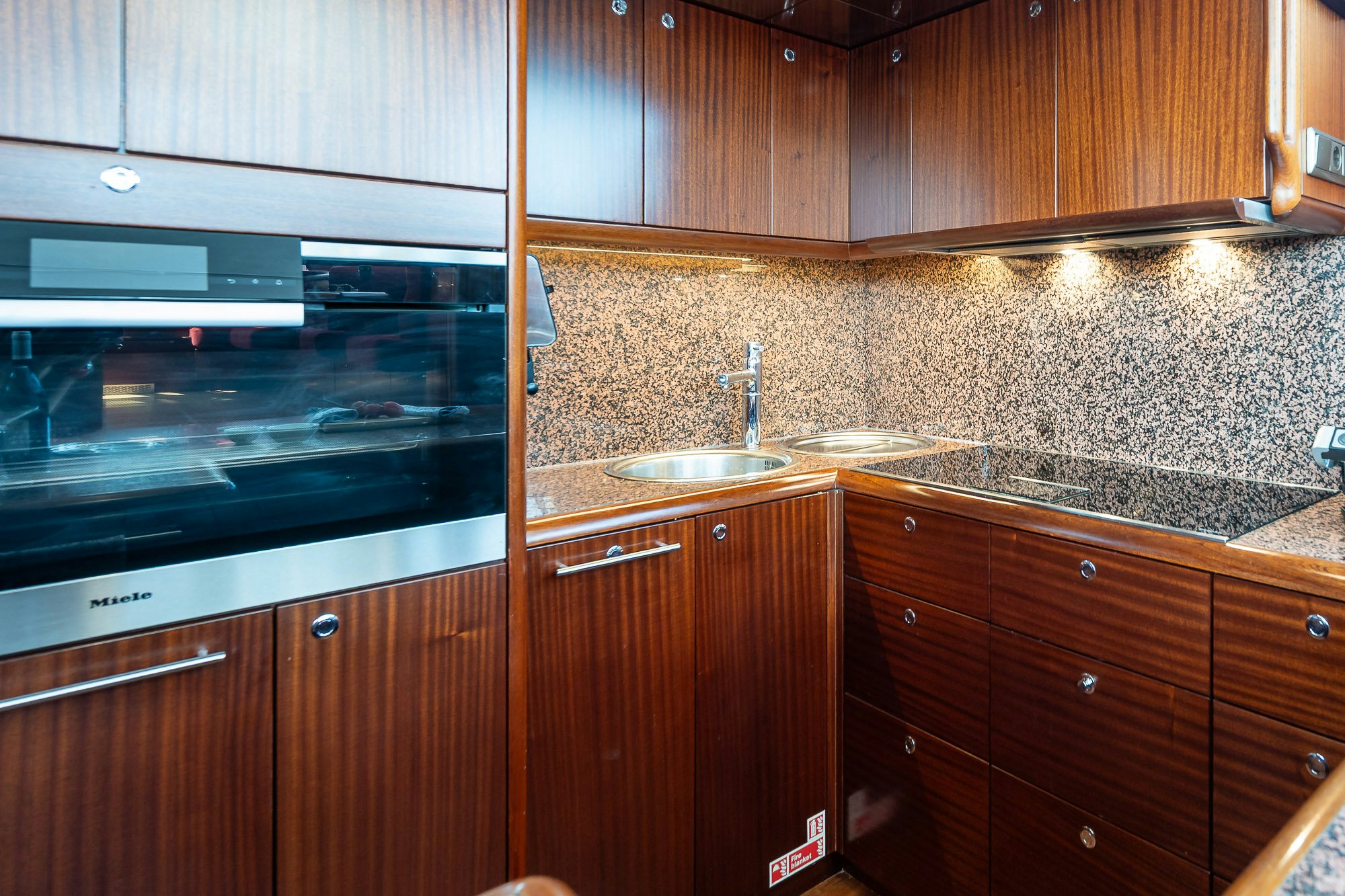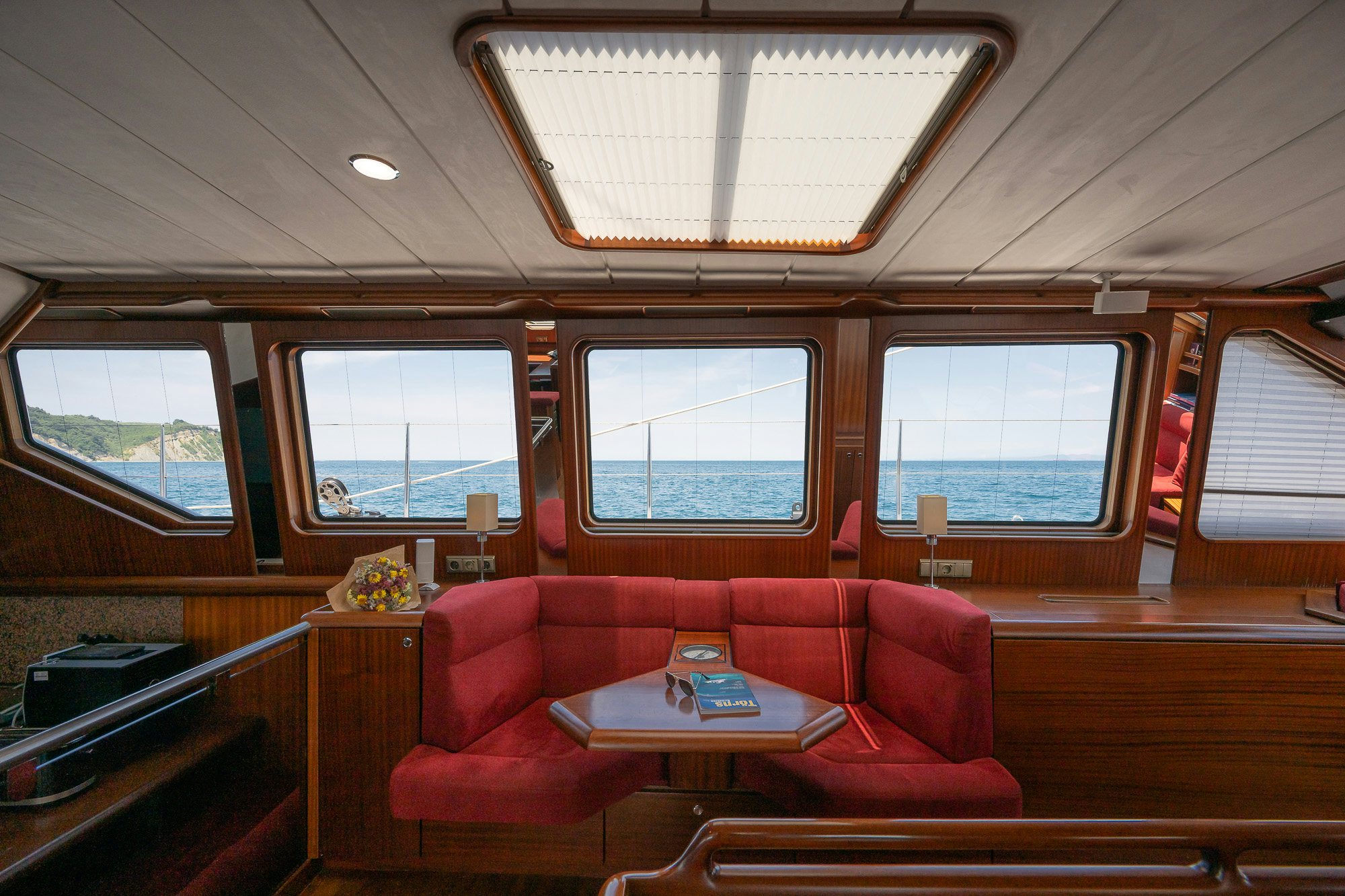 Her spacious interior benefits from oversized windows, allowing natural light to flood the main salon and galley area. The layout is open and practical, featuring a classic design that emphasizes comfort and usability. The salon and galley are integrated into one large space, ideal for socializing or family use. Varnish finishes, cabinetry, and flooring throughout the main living areas remain in superb condition, with only minimal wear observed — a testament to her thoughtful upkeep.