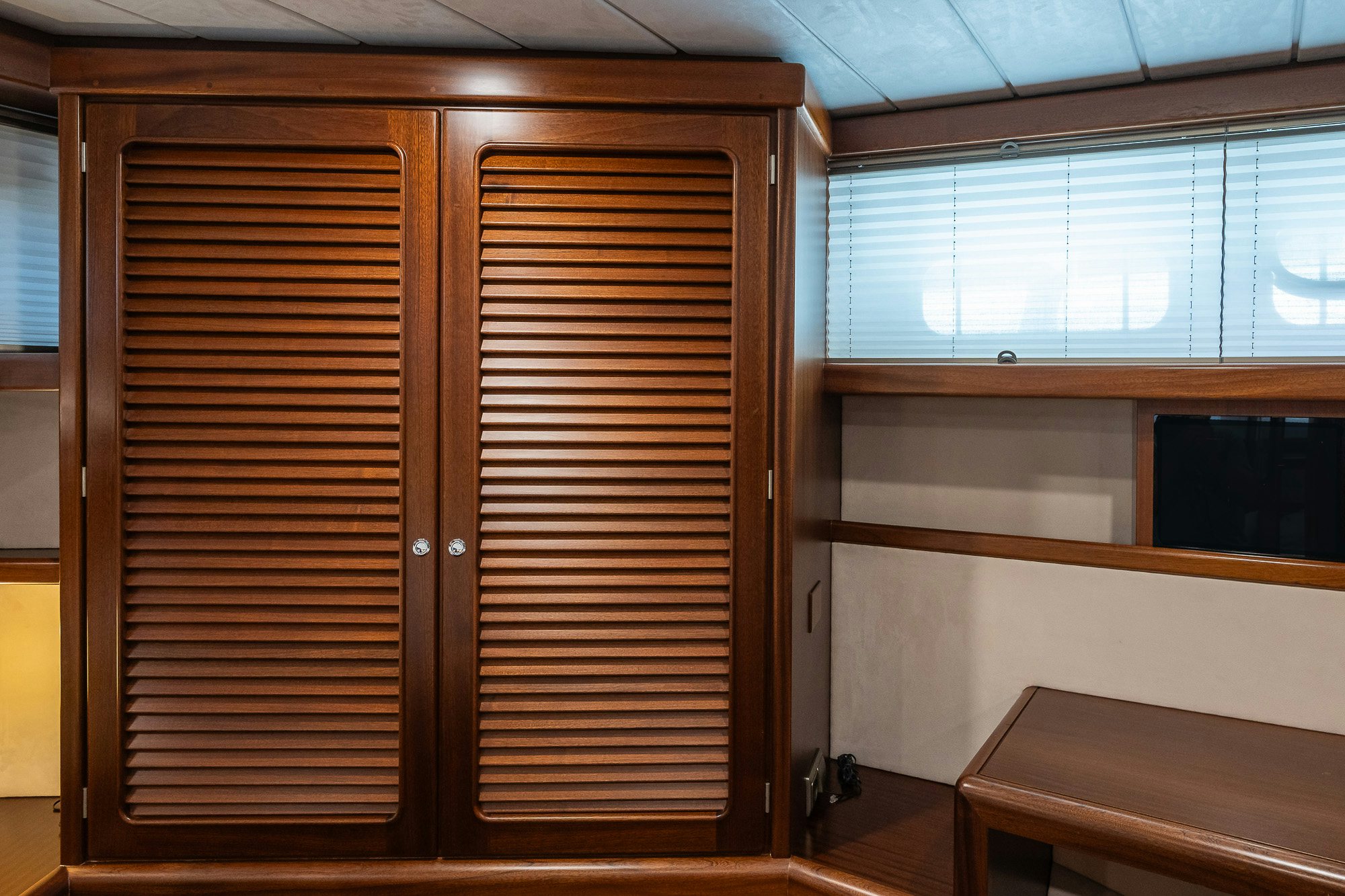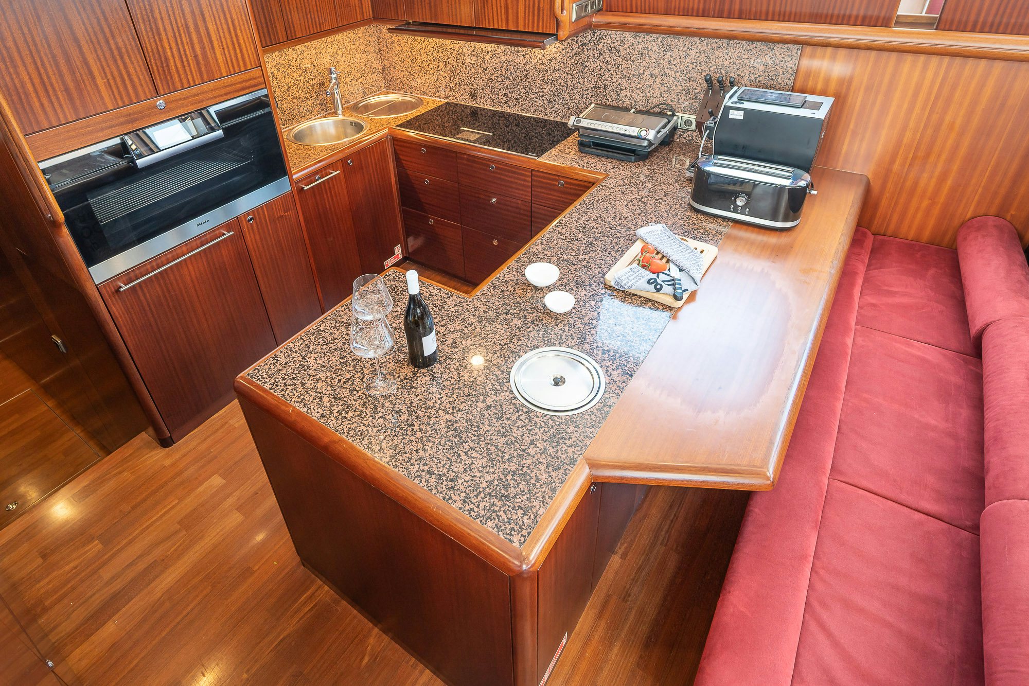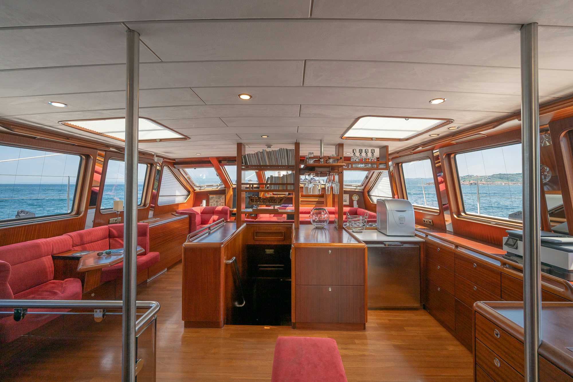 Her spacious interior benefits from oversized windows, allowing natural light to flood the main salon and galley area. The layout is open and practical, featuring a classic design that emphasizes comfort and usability. The salon and galley are integrated into one large space, ideal for socializing or family use. Varnish finishes, cabinetry, and flooring throughout the main living areas remain in superb condition, with only minimal wear observed — a testament to her thoughtful upkeep.