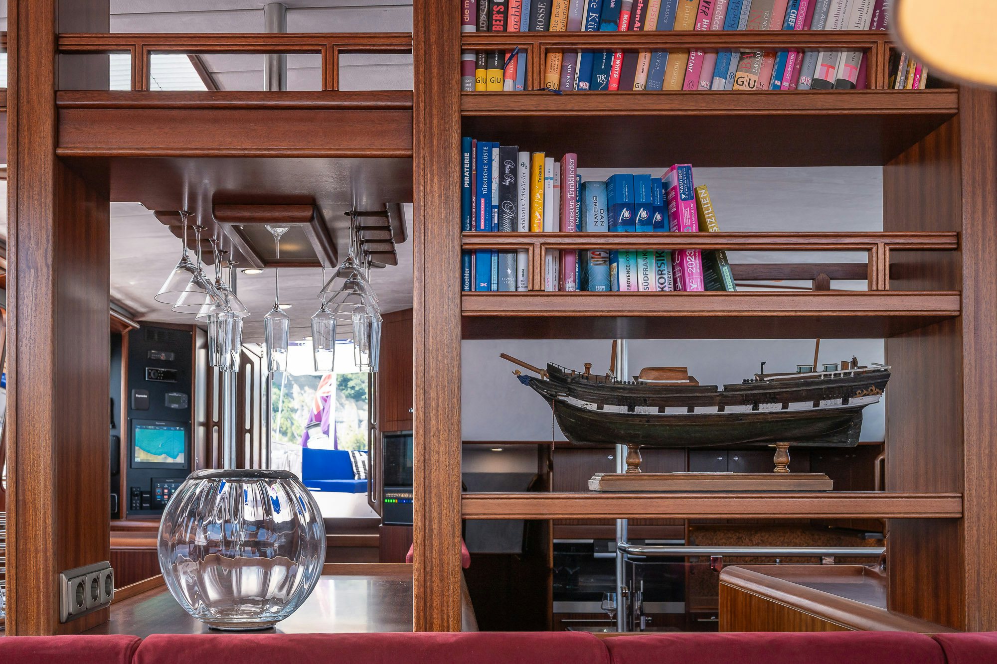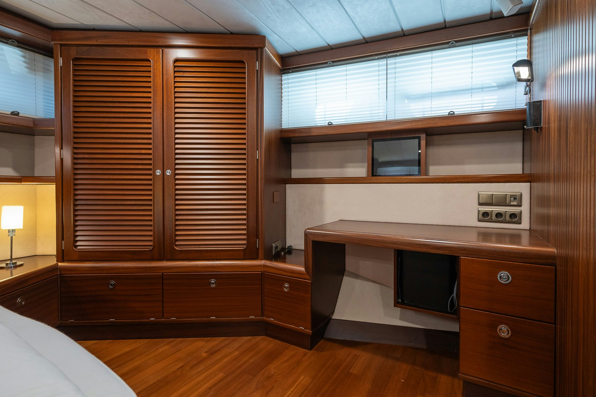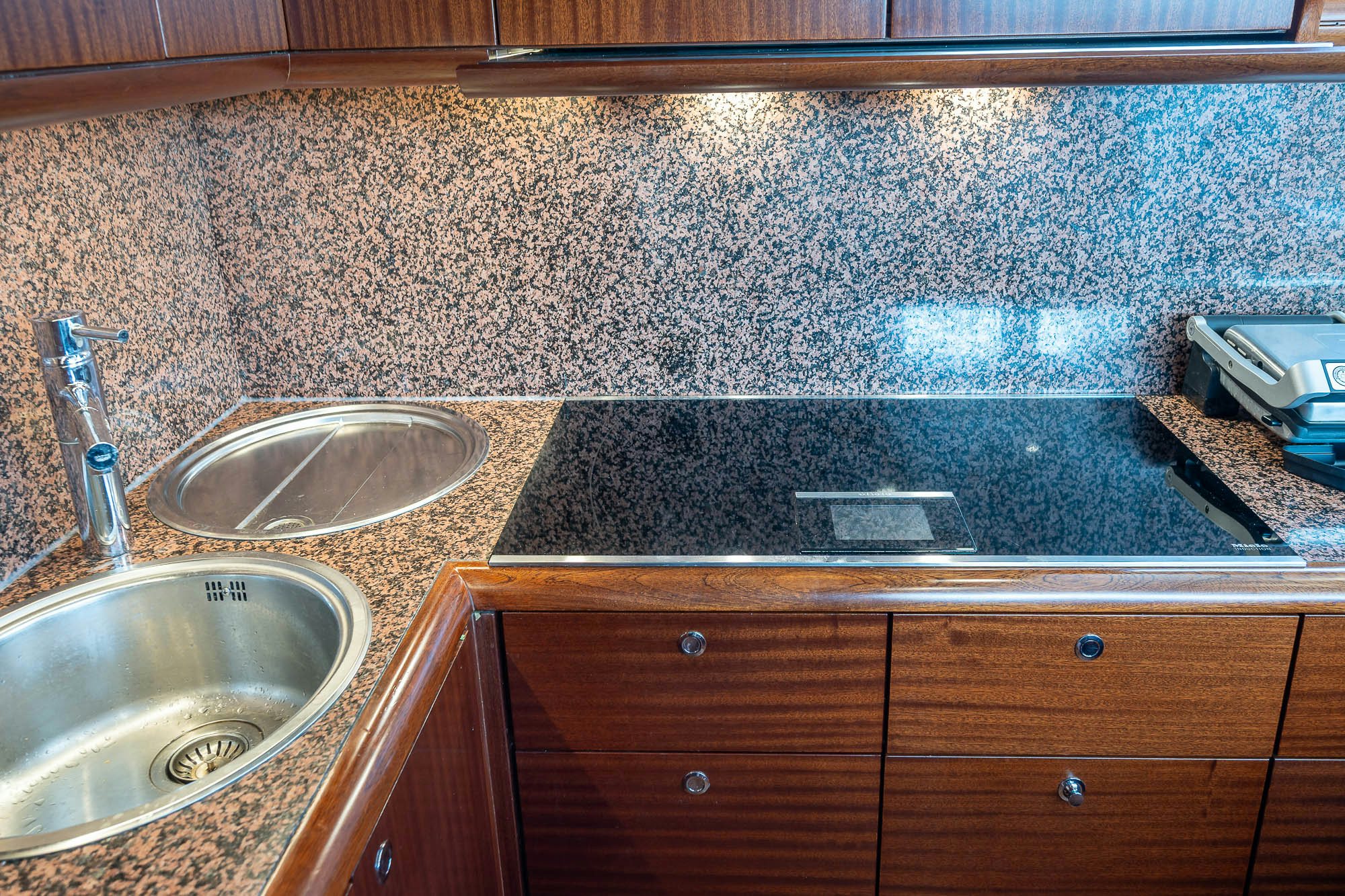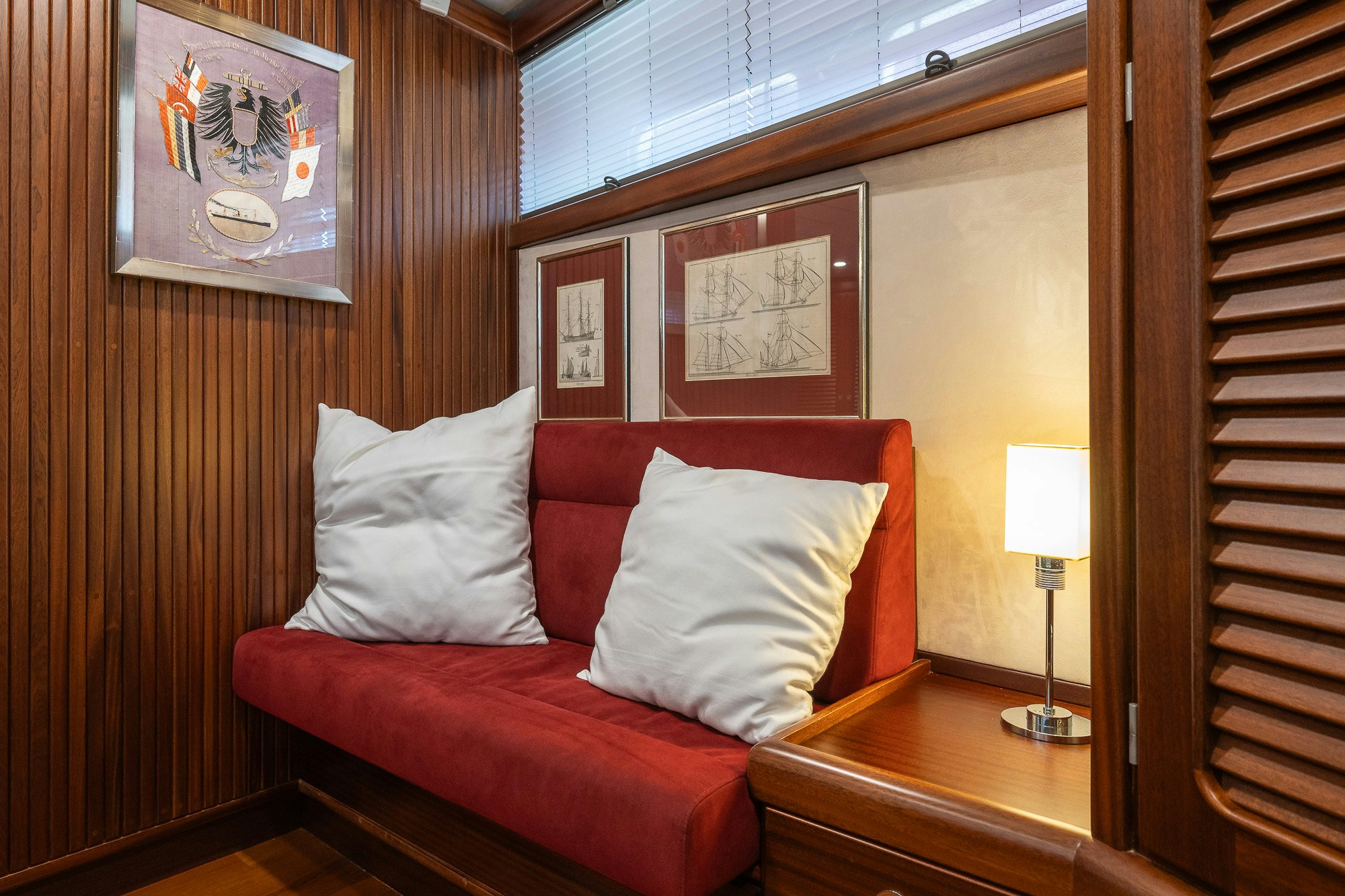 Her spacious interior benefits from oversized windows, allowing natural light to flood the main salon and galley area. The layout is open and practical, featuring a classic design that emphasizes comfort and usability. The salon and galley are integrated into one large space, ideal for socializing or family use. Varnish finishes, cabinetry, and flooring throughout the main living areas remain in superb condition, with only minimal wear observed — a testament to her thoughtful upkeep.