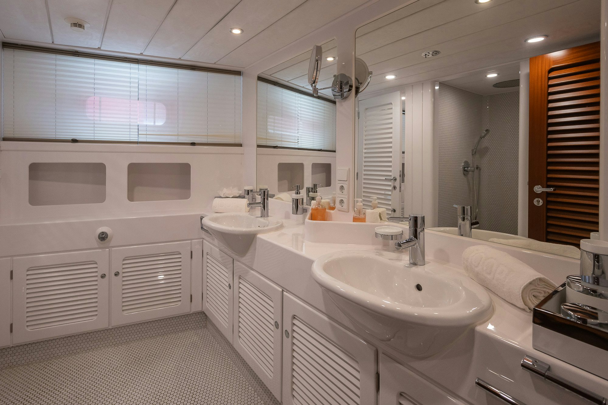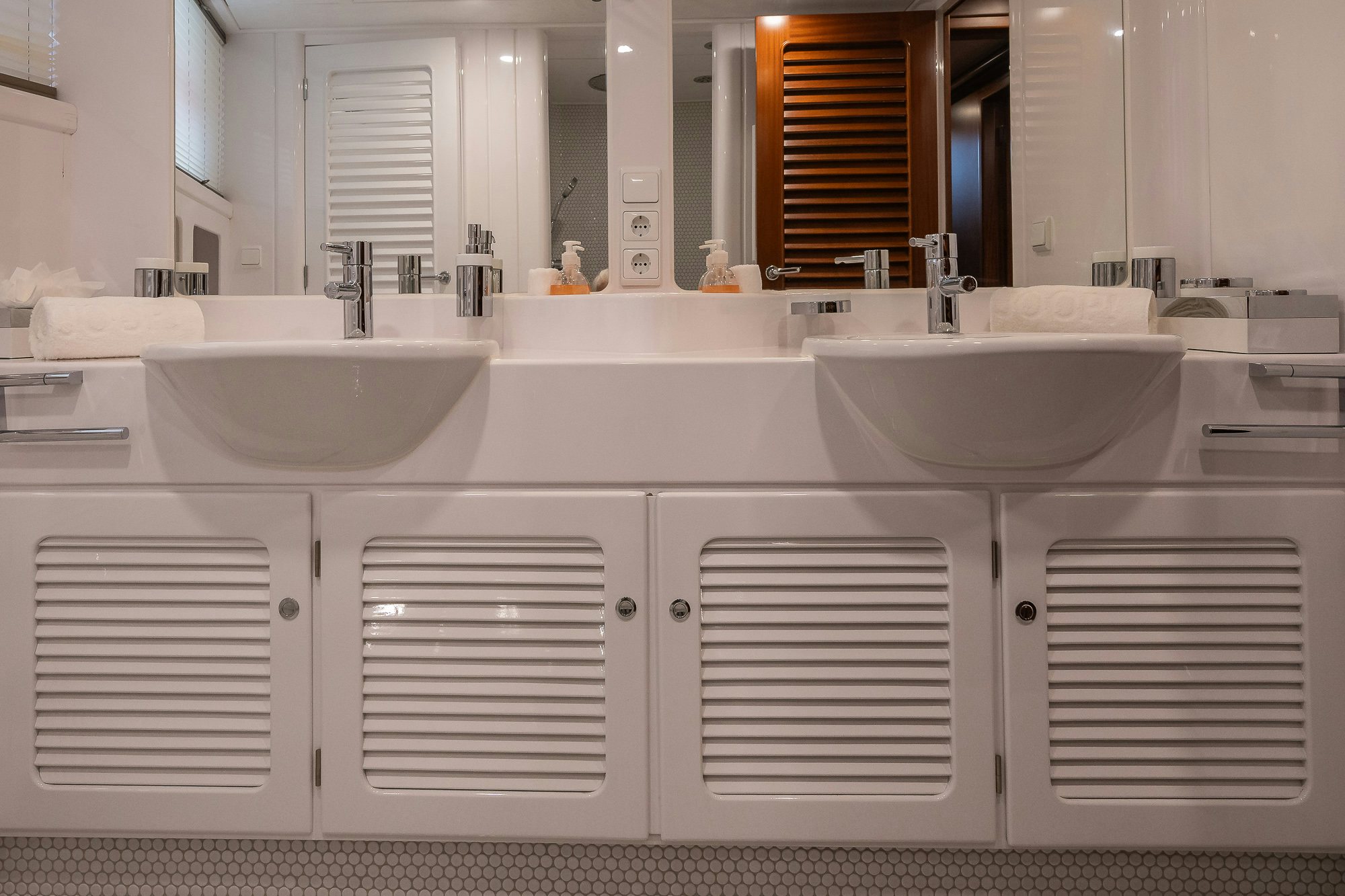 PLAYMOBIL accommodates up to eight guests in four en-suite staterooms. The owner’s cabin features a double bed and en-suite bath. The VIP guest cabin also has a double bed and en-suite, while the remaining guest cabins include one with twin beds and another with a double bed—each with their own en-suite bathrooms. Crew accommodations are thoughtfully laid out, including a captain’s cabin with bunk beds, a table, and en-suite, and a separate single crew cabin. All cabins were found in excellent cosmetic and functional condition, with en-suite heads featuring fully operational Tecma electric macerator toilets and strong water pressure throughout.