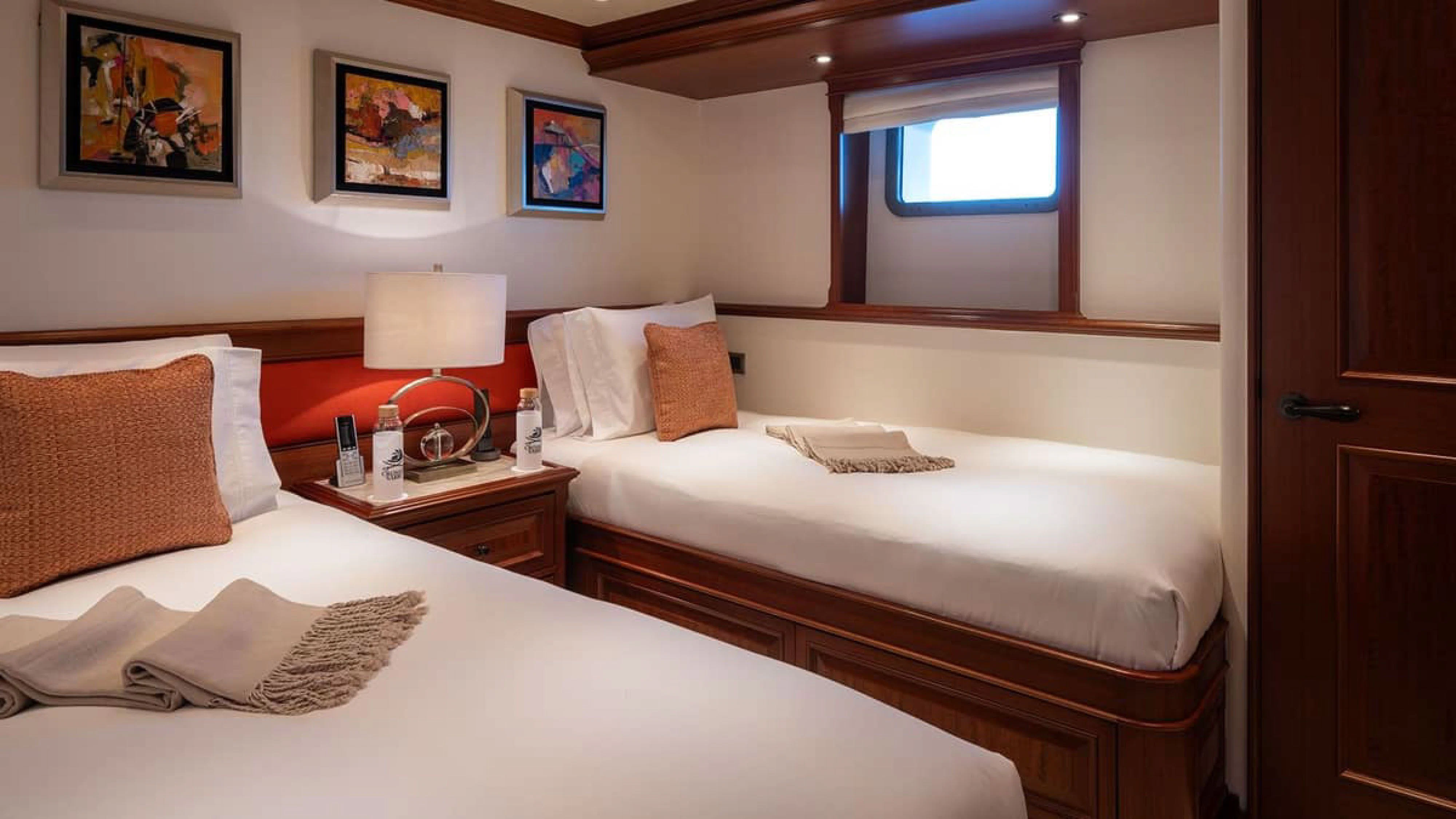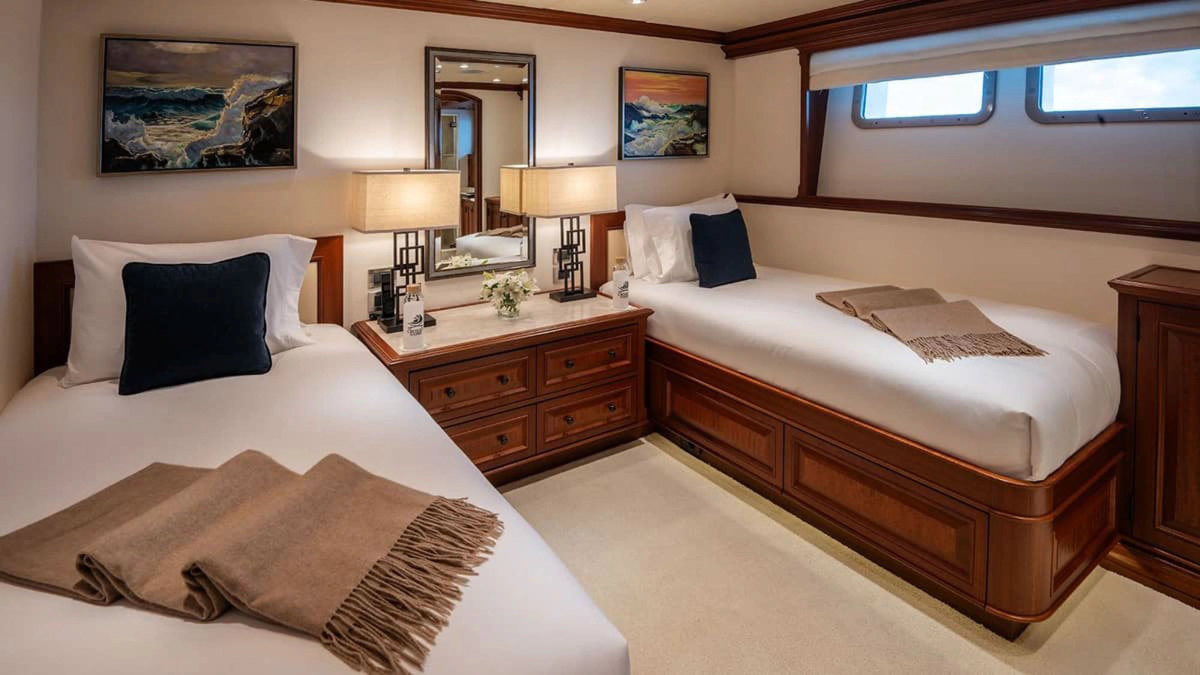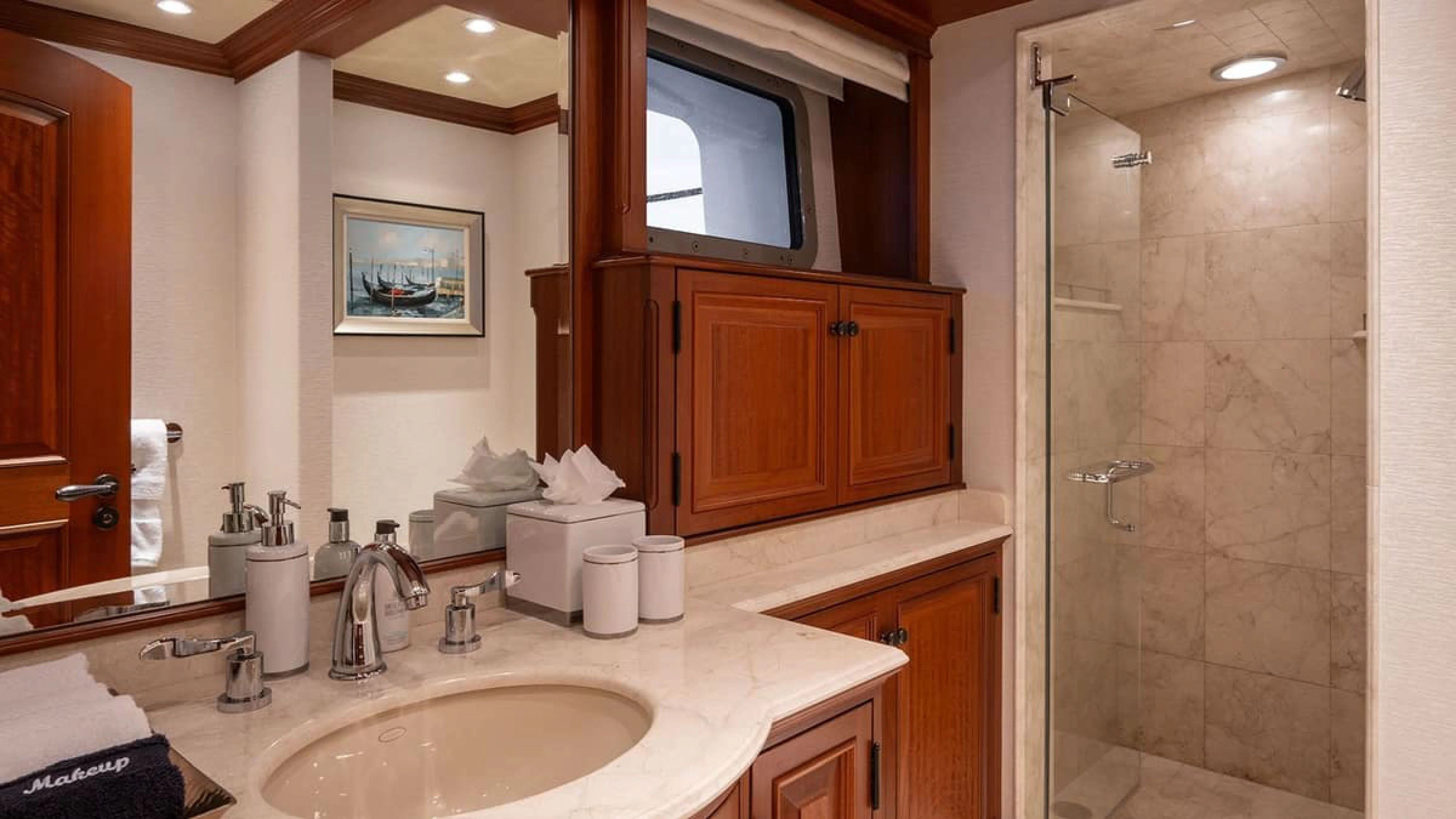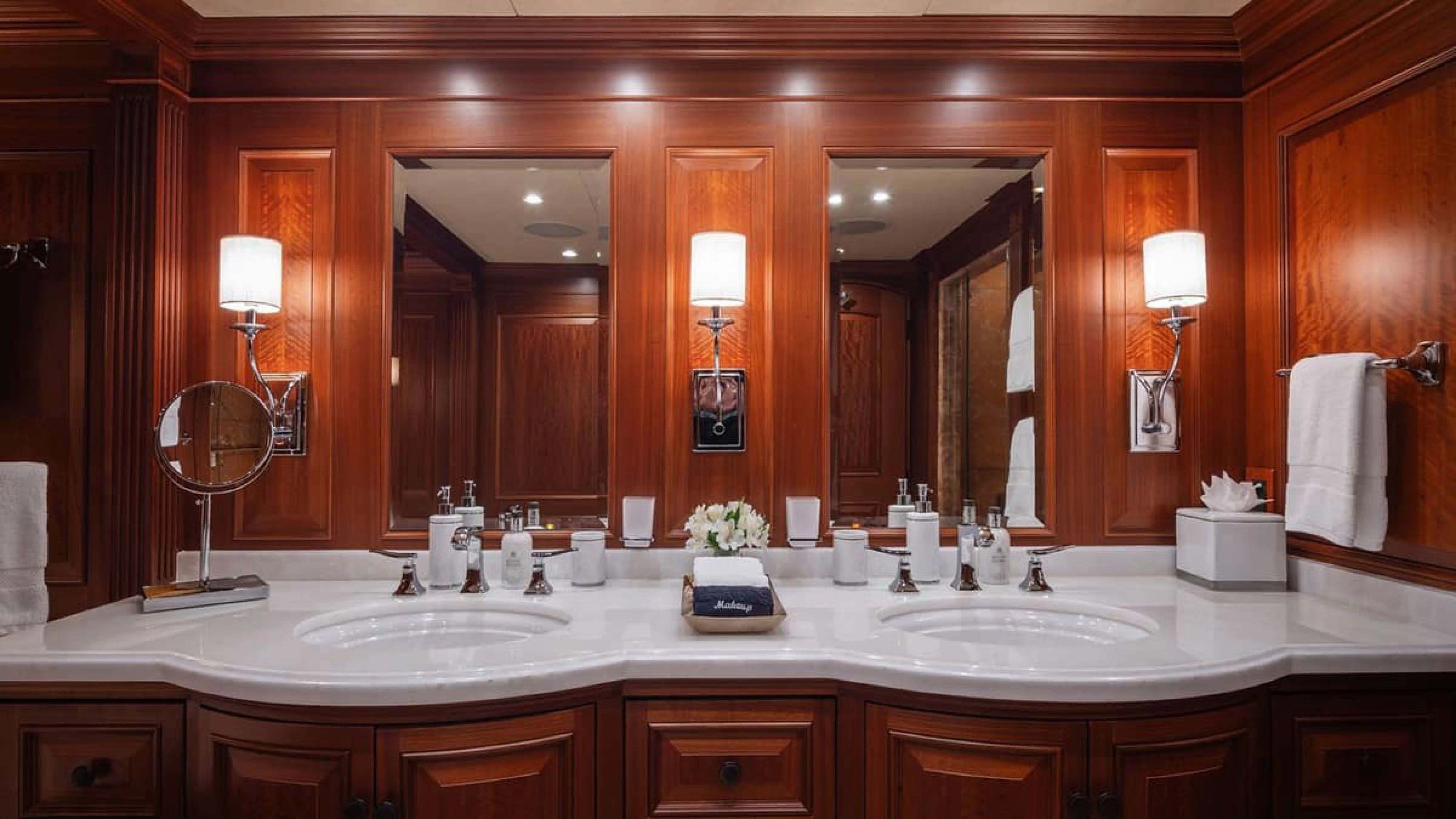 Step inside CROSSED SABRE to discover an interior that exudes sophistication and comfort. Seven sumptuous cabins accommodate up to twelve guests, ensuring everyone experiences unparalleled luxury during their stay aboard this floating palace. The master stateroom stands as a testament to ultimate indulgence with opulent furnishings, lavish en-suite facilities, and breathtaking views from expansive windows.