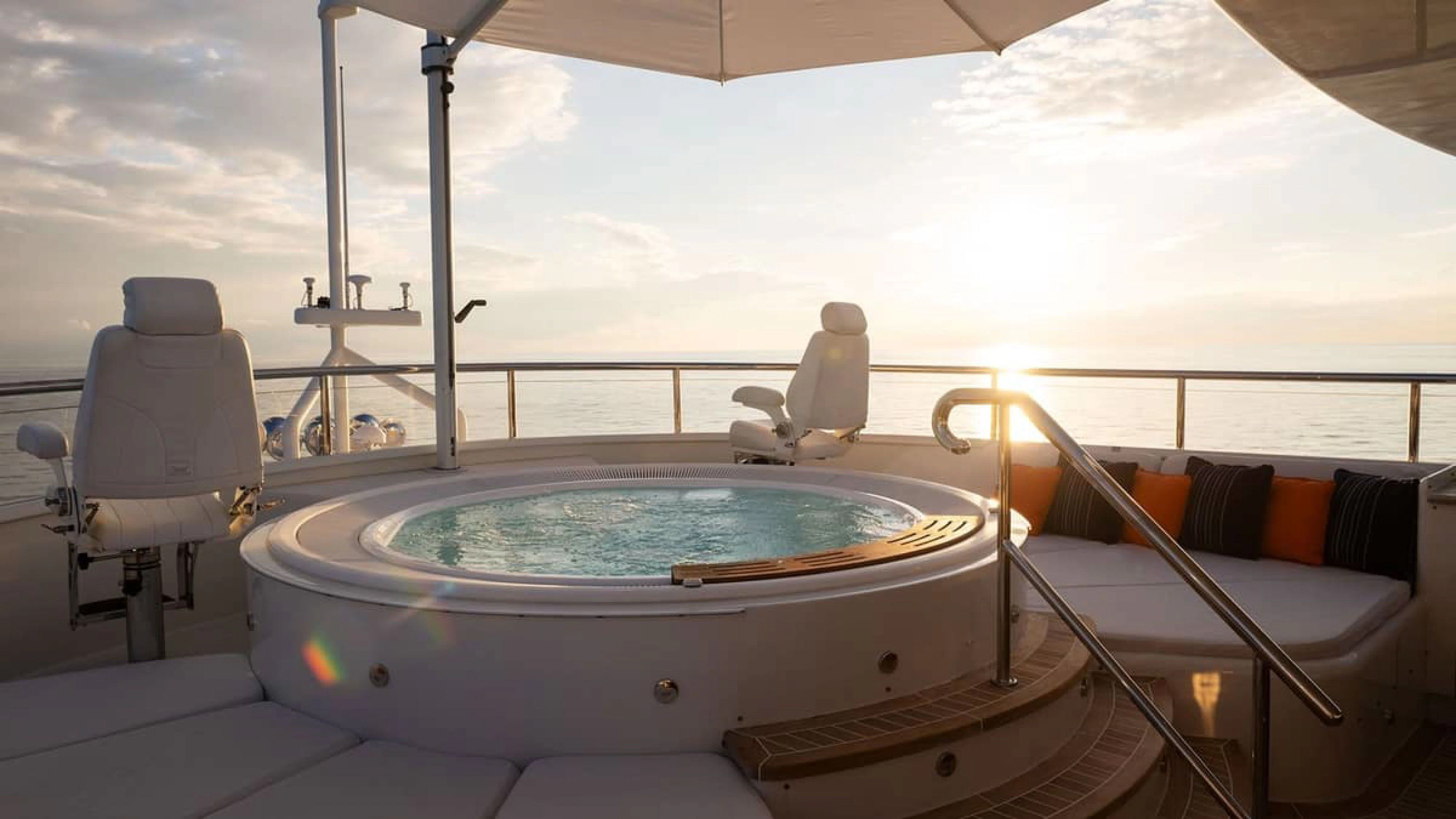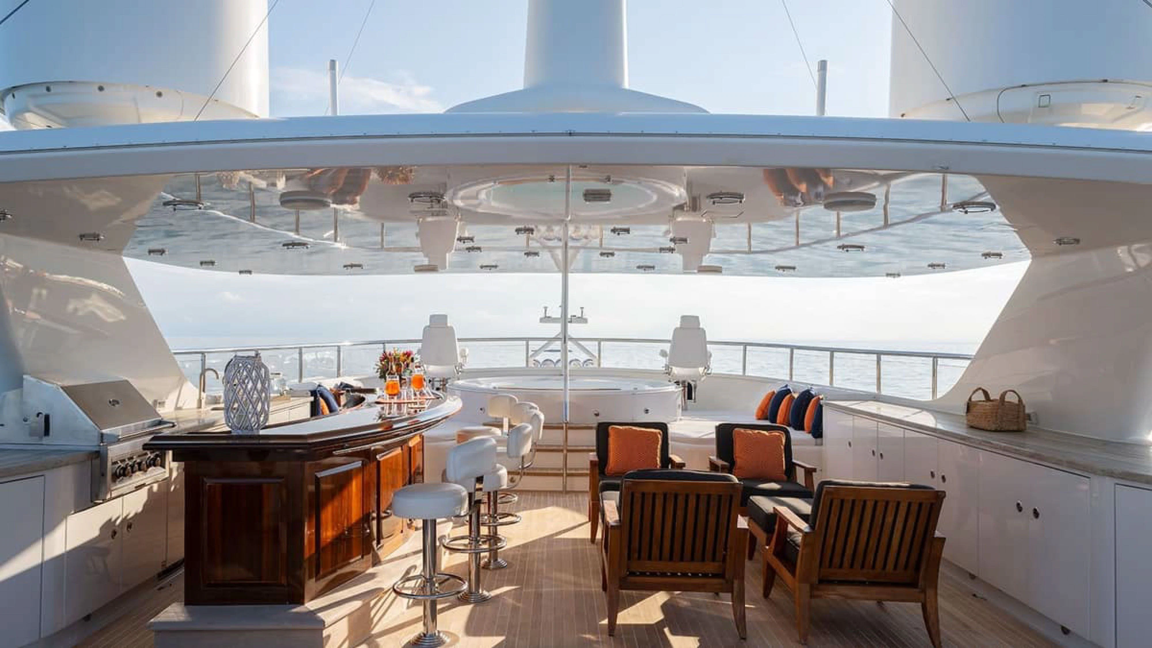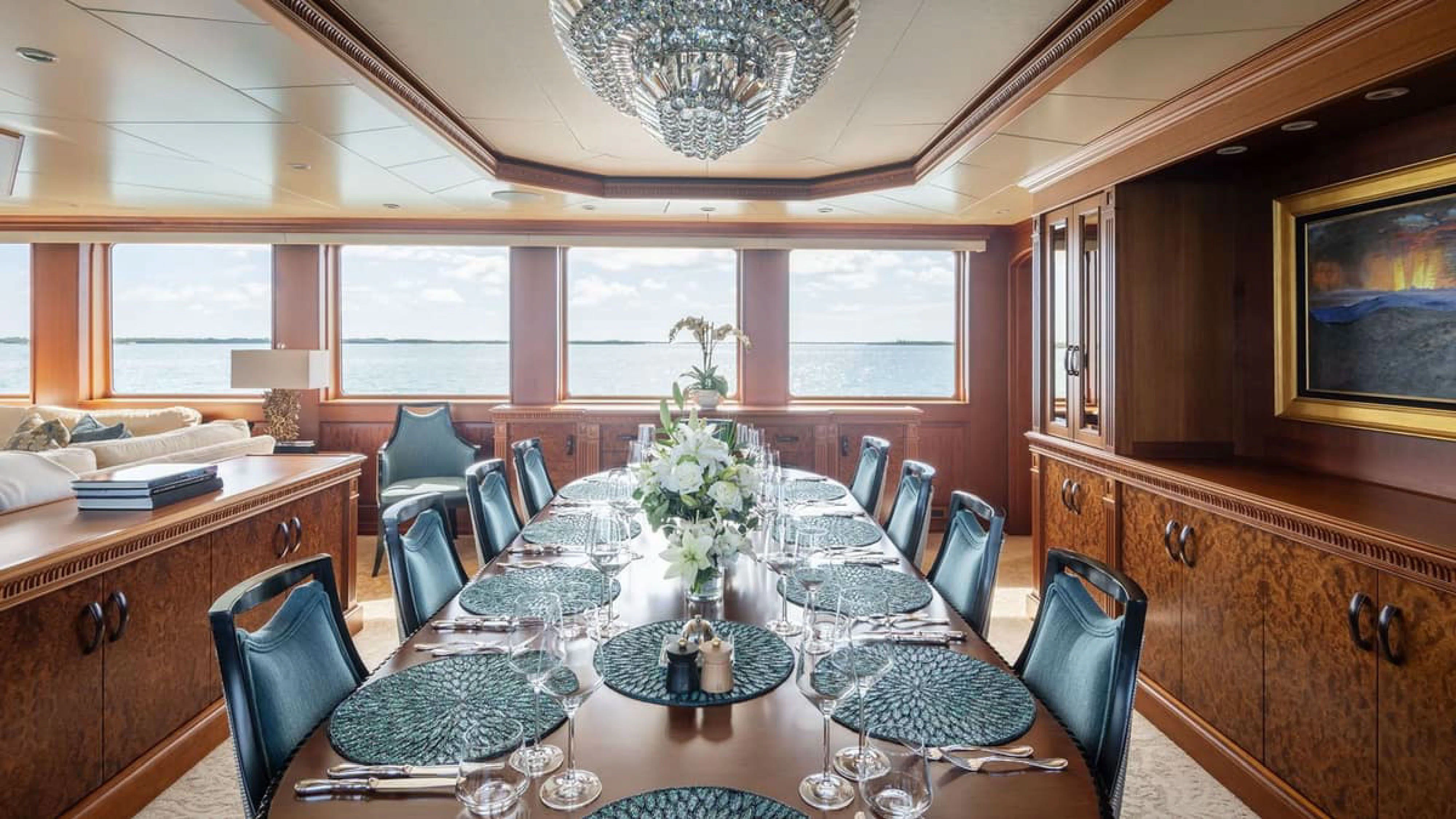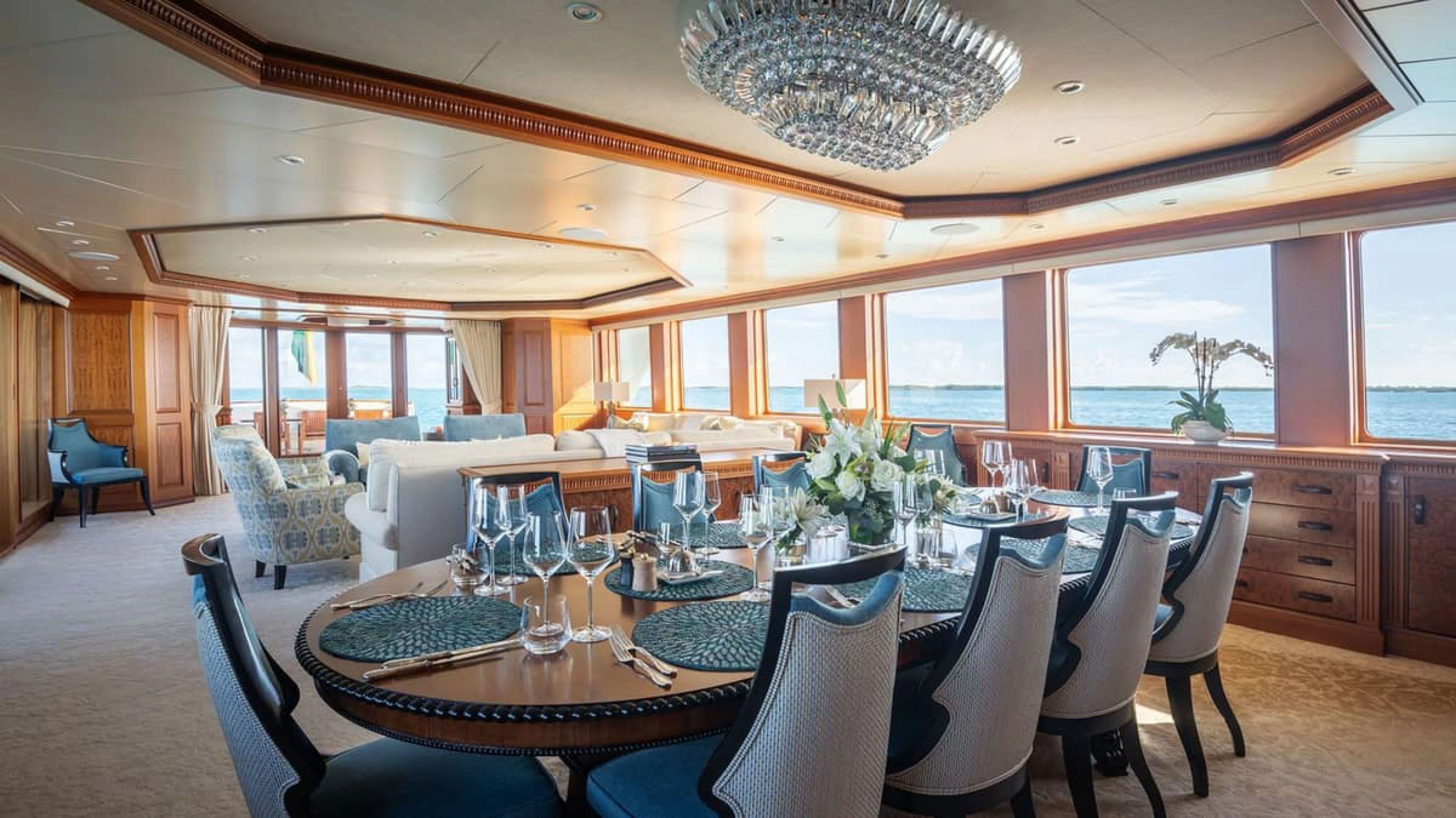 The main salon provides a welcoming space for socializing or unwinding after a day filled with aquatic adventures such as scuba diving - one among many amenities offered by CROSSED SABRE. Other onboard facilities include a state-of-the-art movie theater for cinematic experiences at sea, a fully-equipped gym for those keen on maintaining their fitness regimen while cruising, and an inviting Jacuzzi promising blissful relaxation under open skies.