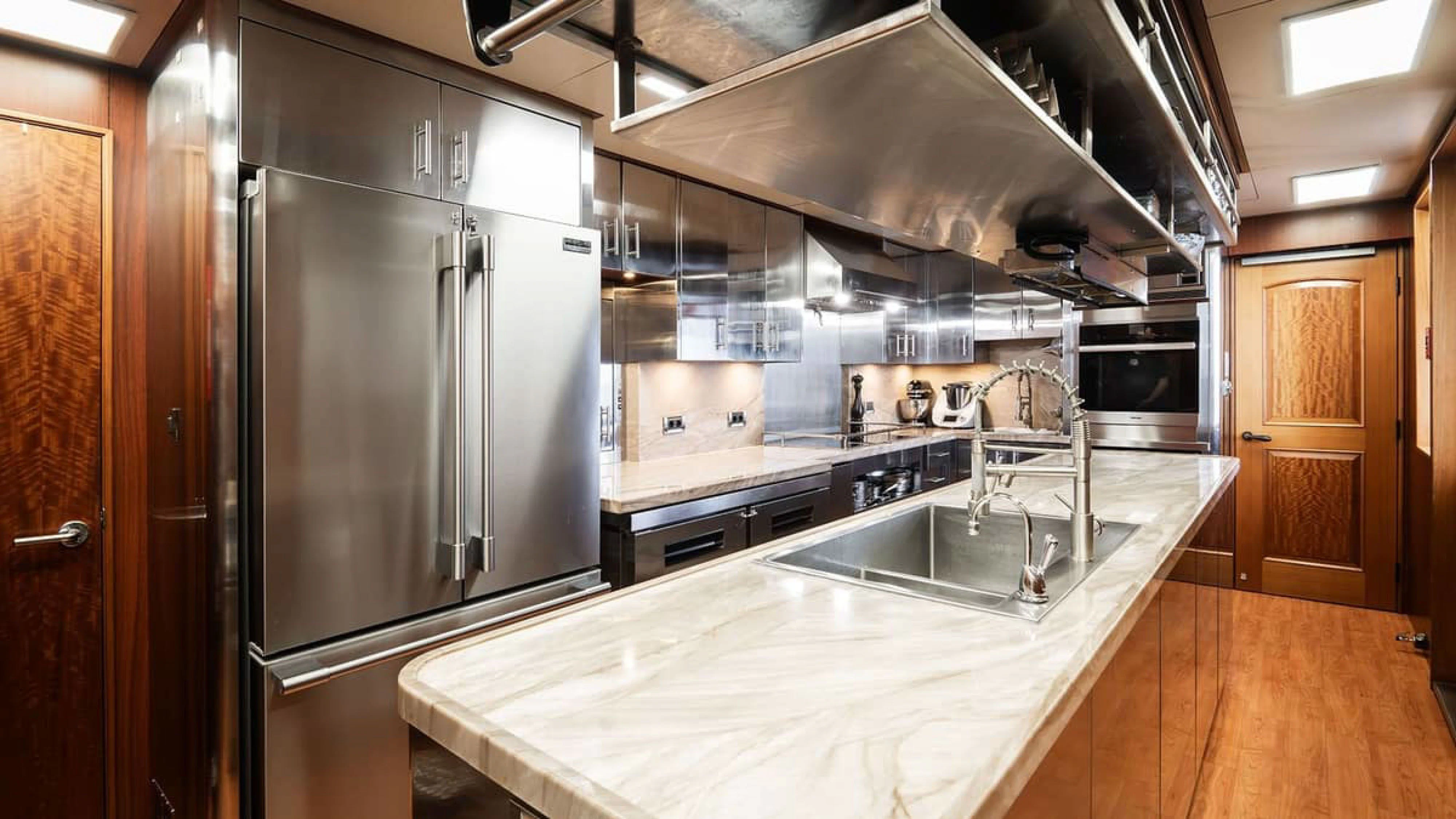 The vessel’s machinery is equally impressive featuring two MTU 12V-4000 M90 engines with power output reaching up to 2736 hp /2040 kW each providing comfortable cruising speed of 12 knots while capable of reaching top speeds up to 14 knots when required. For maneuverability in marinas or tight anchorages there is Quantum Marine Dual Counter Rotating Propeller QT-120 bow thruster installed on board which makes docking procedures effortless even in challenging conditions.