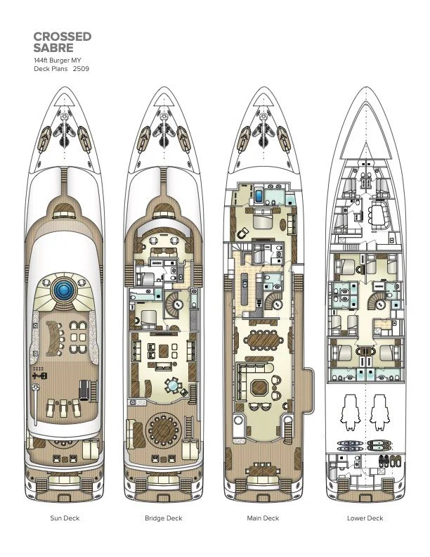 Introducing the epitome of luxury and elegance, CROSSED SABRE. A magnificent creation of Burger Boat Company, this 144-foot (43.9m) custom motor yacht was launched in 2006 and underwent a comprehensive refit in 2020. With an impressive semi-displacement aluminum hull, CROSSED SABRE boasts a beam of 27 feet (8.43m) and a maximum draft of 9 feet (2.82m), offering ample space for guests to enjoy both its exterior and interior grandeur.