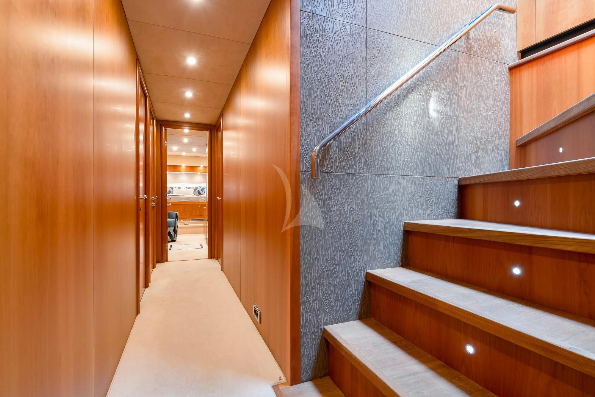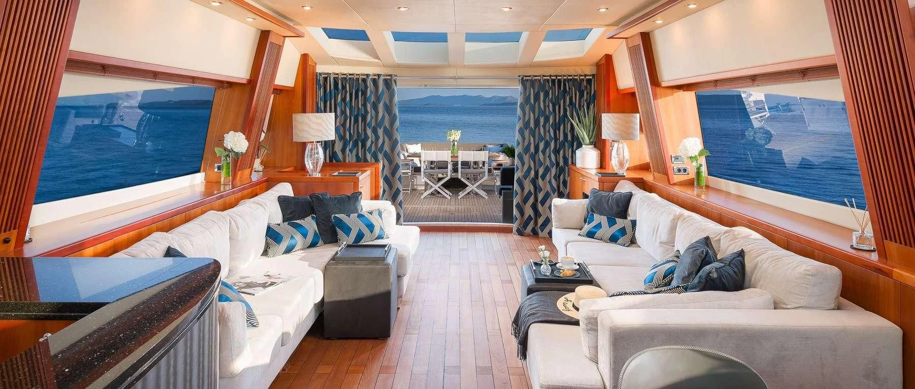 Stepping inside the QUANTUM reveals an interior that exudes refined sophistication and comfort. It hosts four beautifully appointed cabins that can comfortably accommodate eight guests, providing them with an intimate yet luxurious seafaring experience. The master stateroom stands out with its plush furnishings and stylish décor that perfectly encapsulate the essence of high-end living at sea.