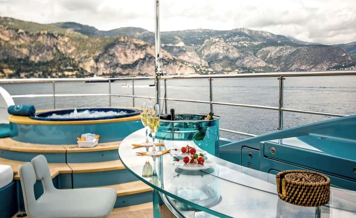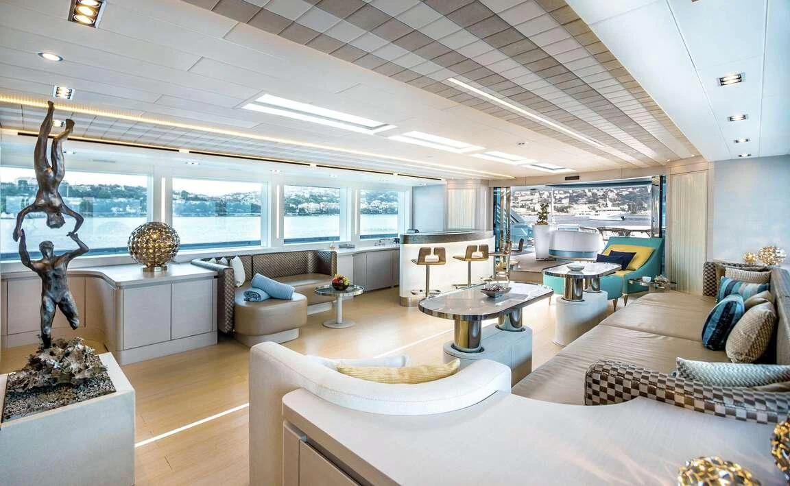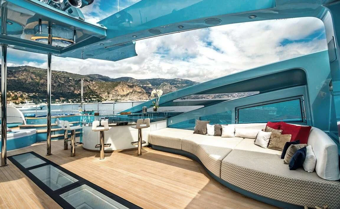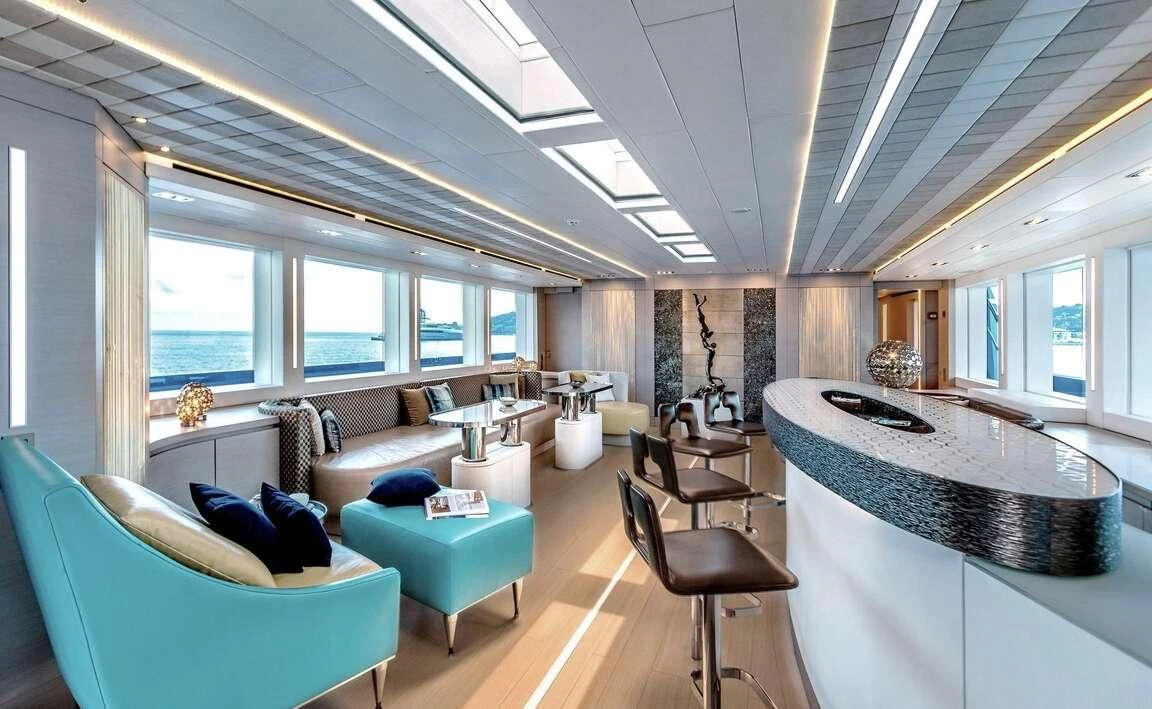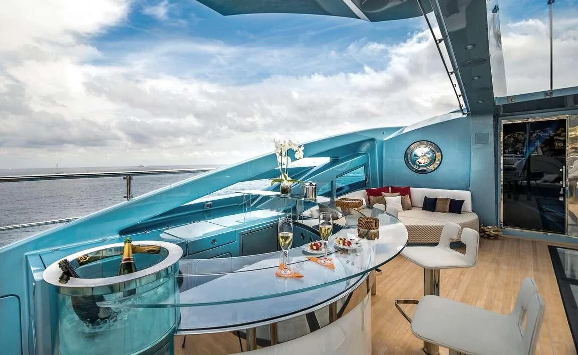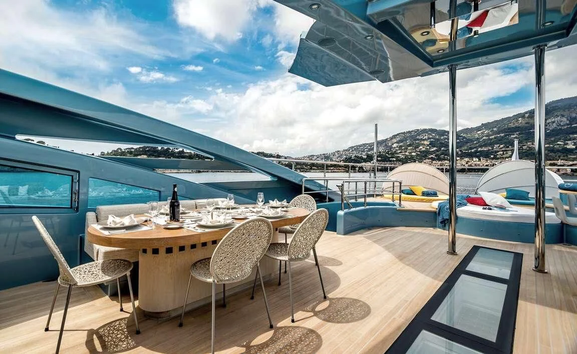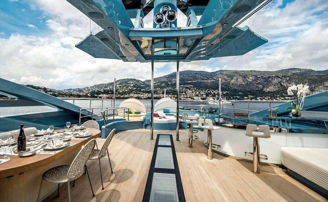 Her exterior design is nothing short of breathtaking. The expansive beam stretching to about 28 feet (8.6 meters) provides ample space for outdoor relaxation and entertainment areas. Her sundecks offer the perfect spot for sunbathing or simply enjoying panoramic ocean views under clear blue skies. Alfresco dining areas are strategically positioned to allow guests to relish their meals amidst serene seascapes, while lounging areas provide comfortable spaces for rest and recreation.