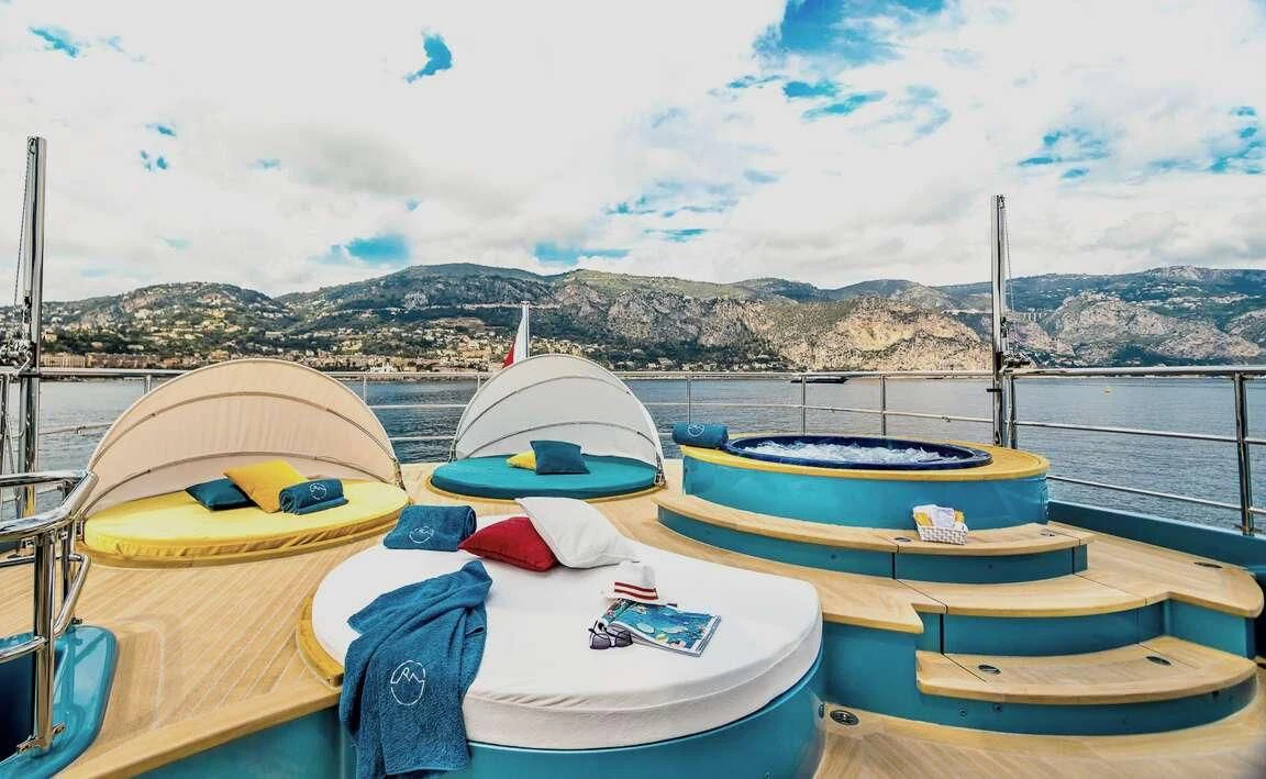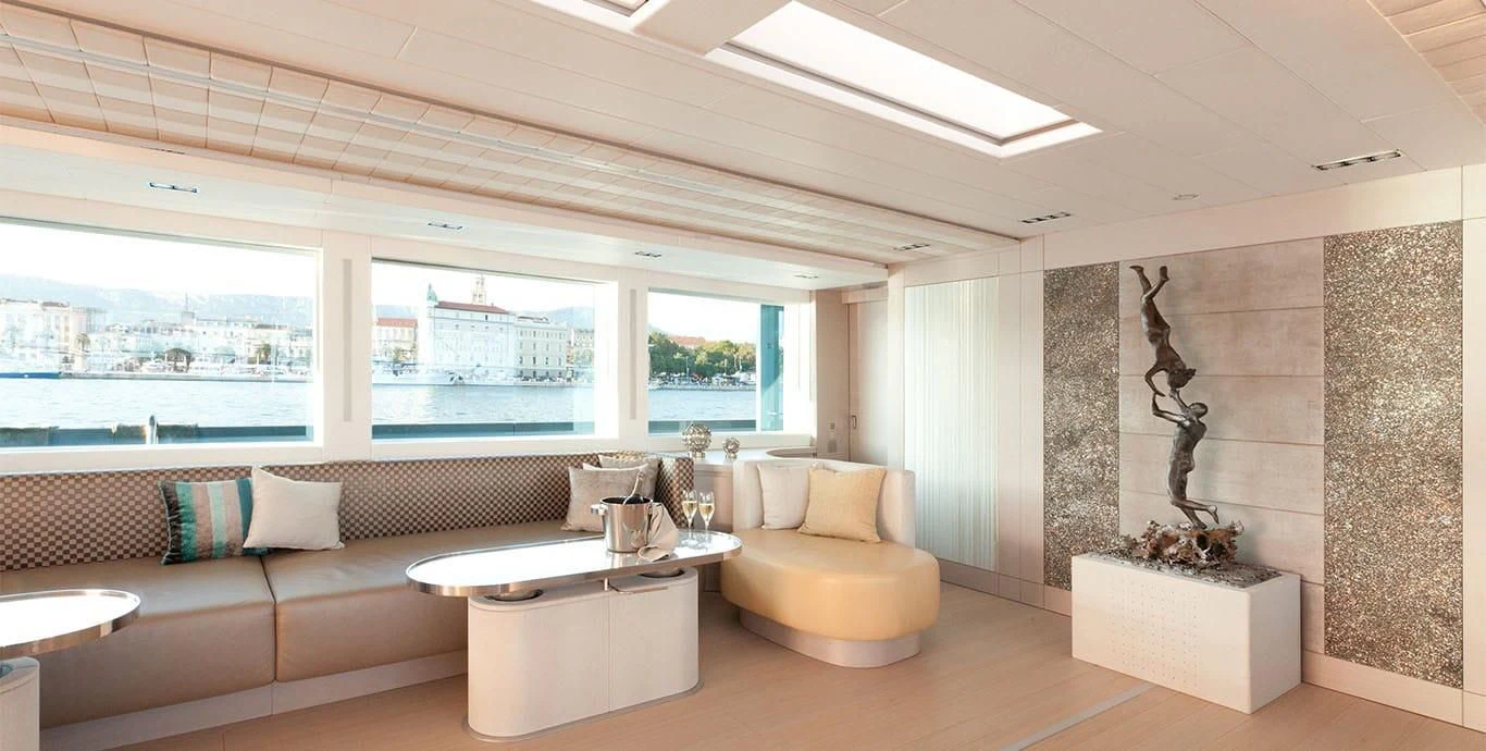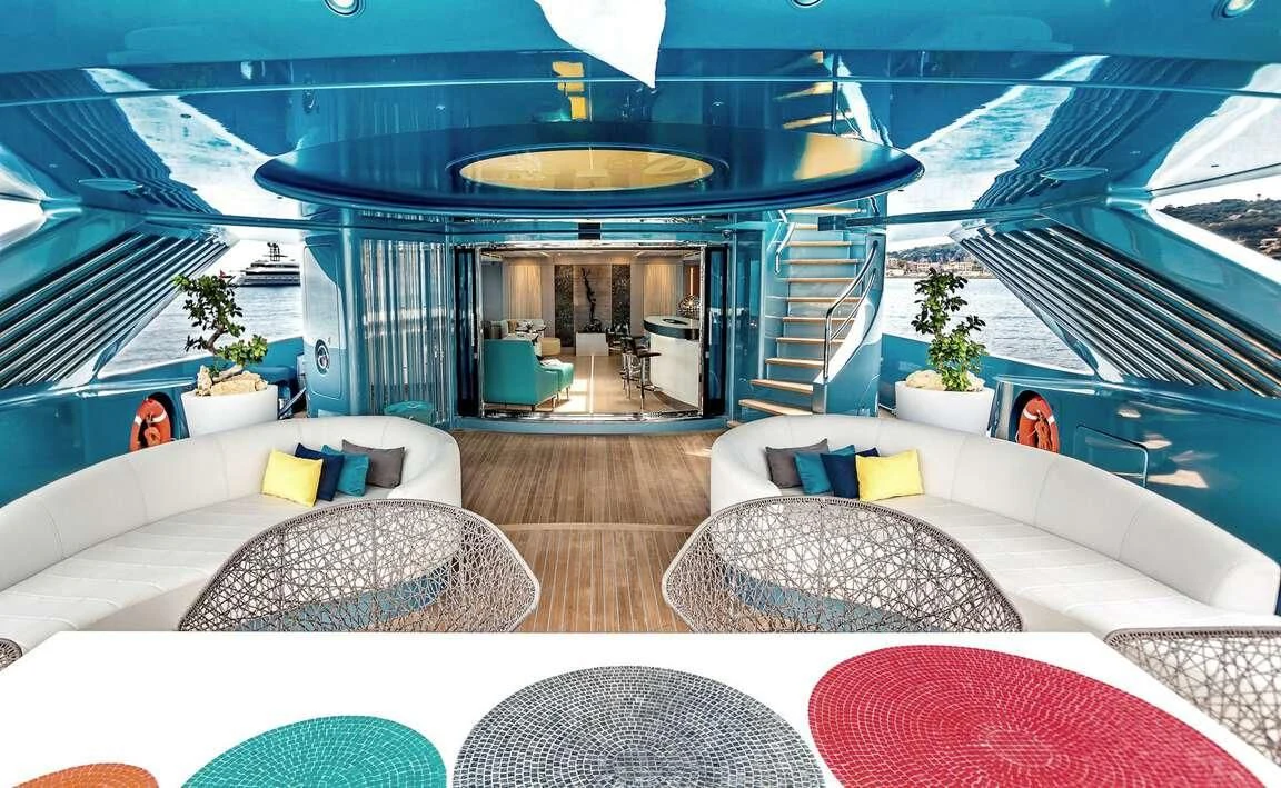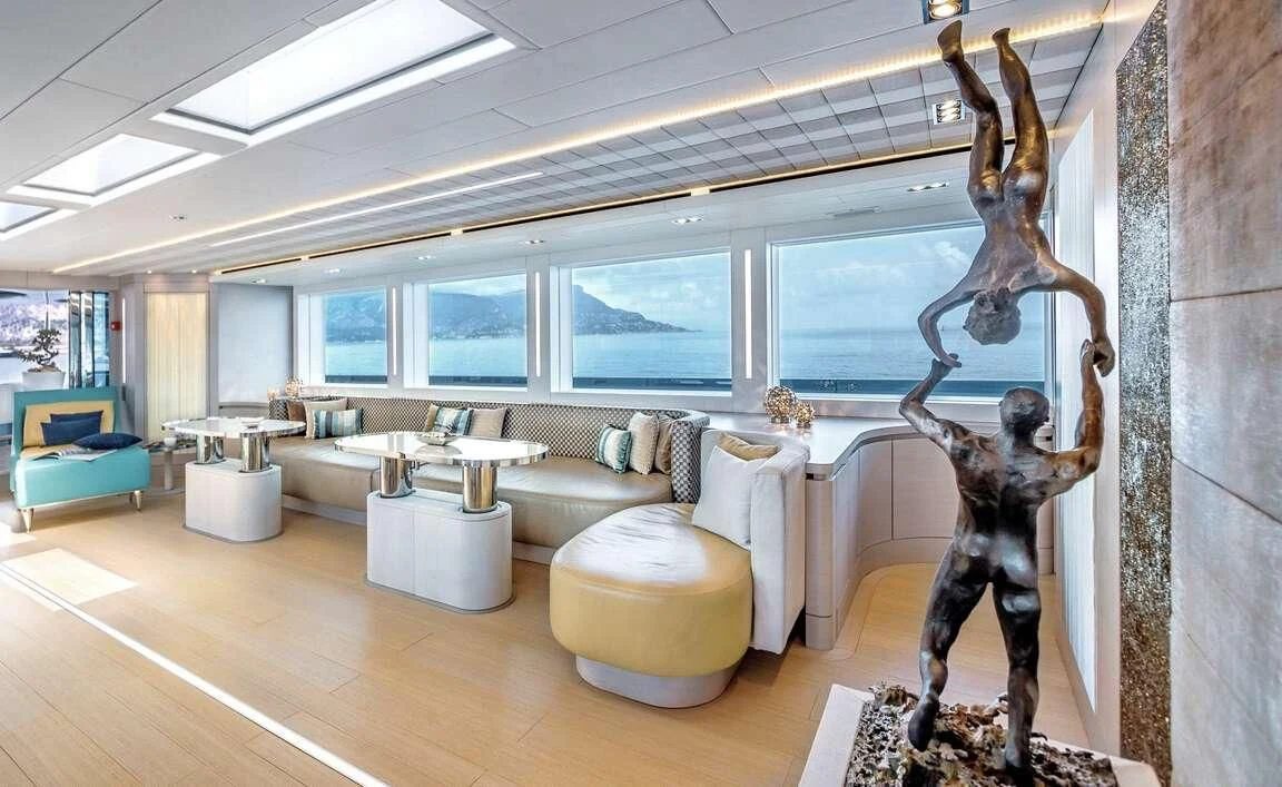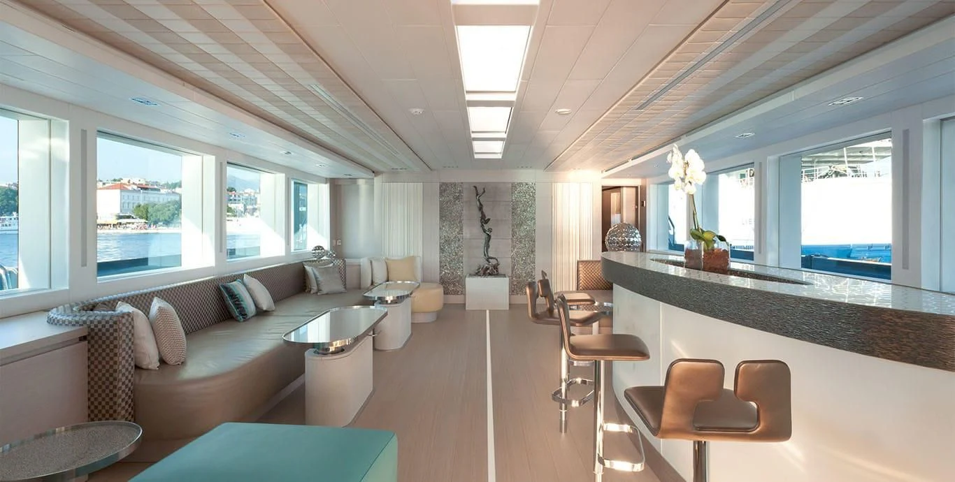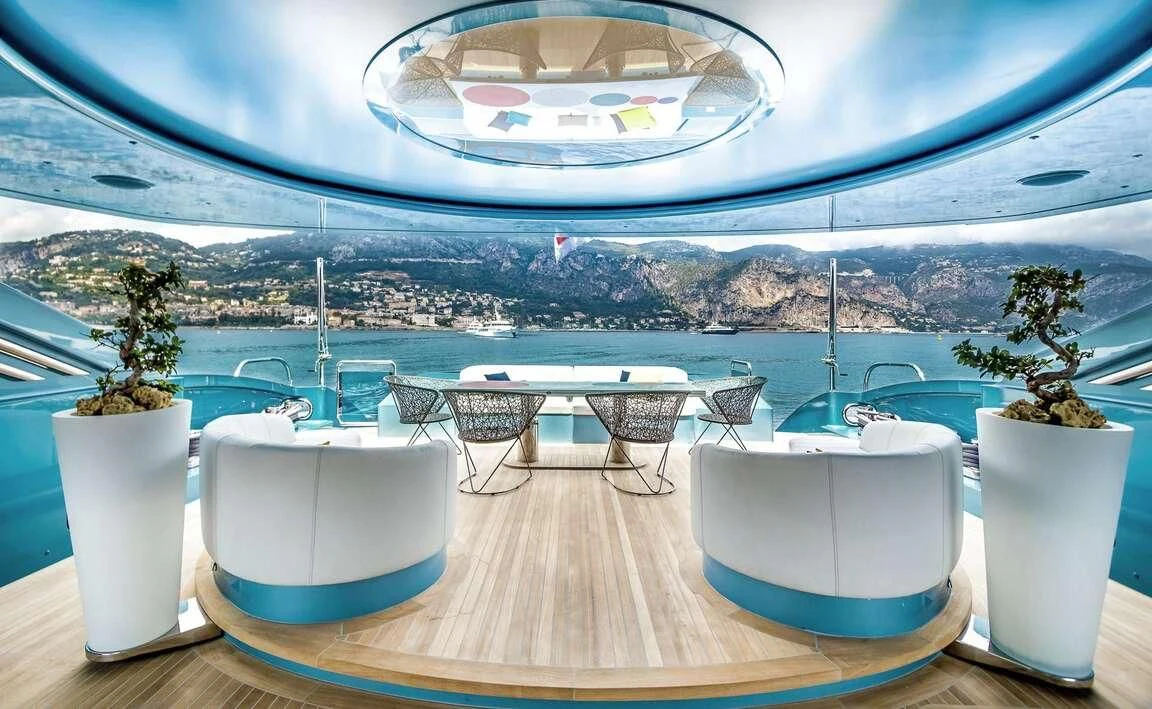 Her exterior design is nothing short of breathtaking. The expansive beam stretching to about 28 feet (8.6 meters) provides ample space for outdoor relaxation and entertainment areas. Her sundecks offer the perfect spot for sunbathing or simply enjoying panoramic ocean views under clear blue skies. Alfresco dining areas are strategically positioned to allow guests to relish their meals amidst serene seascapes, while lounging areas provide comfortable spaces for rest and recreation.