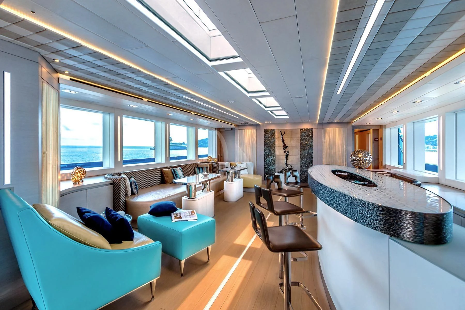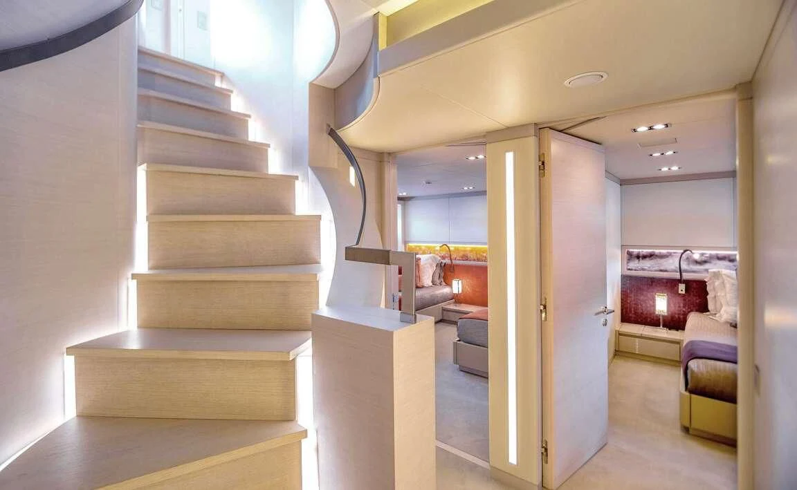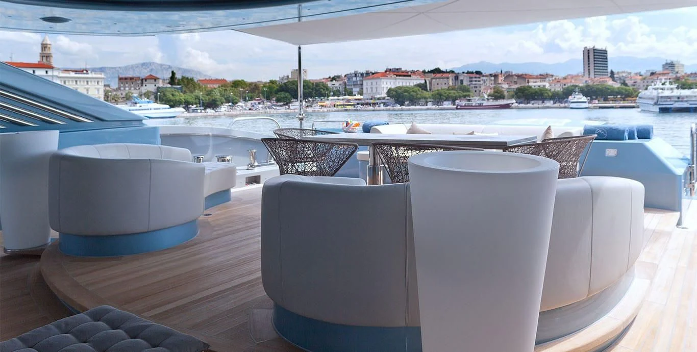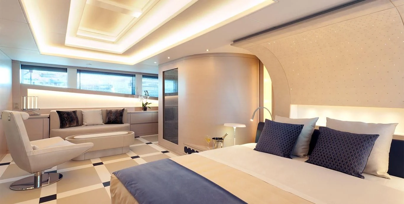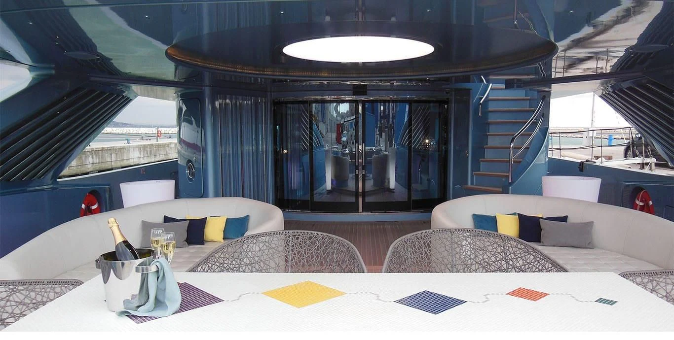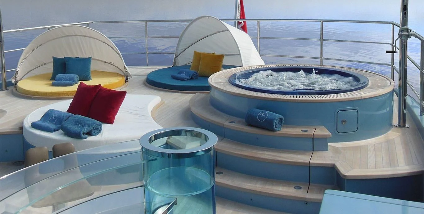 Her exterior design is nothing short of breathtaking. The expansive beam stretching to about 28 feet (8.6 meters) provides ample space for outdoor relaxation and entertainment areas. Her sundecks offer the perfect spot for sunbathing or simply enjoying panoramic ocean views under clear blue skies. Alfresco dining areas are strategically positioned to allow guests to relish their meals amidst serene seascapes, while lounging areas provide comfortable spaces for rest and recreation.