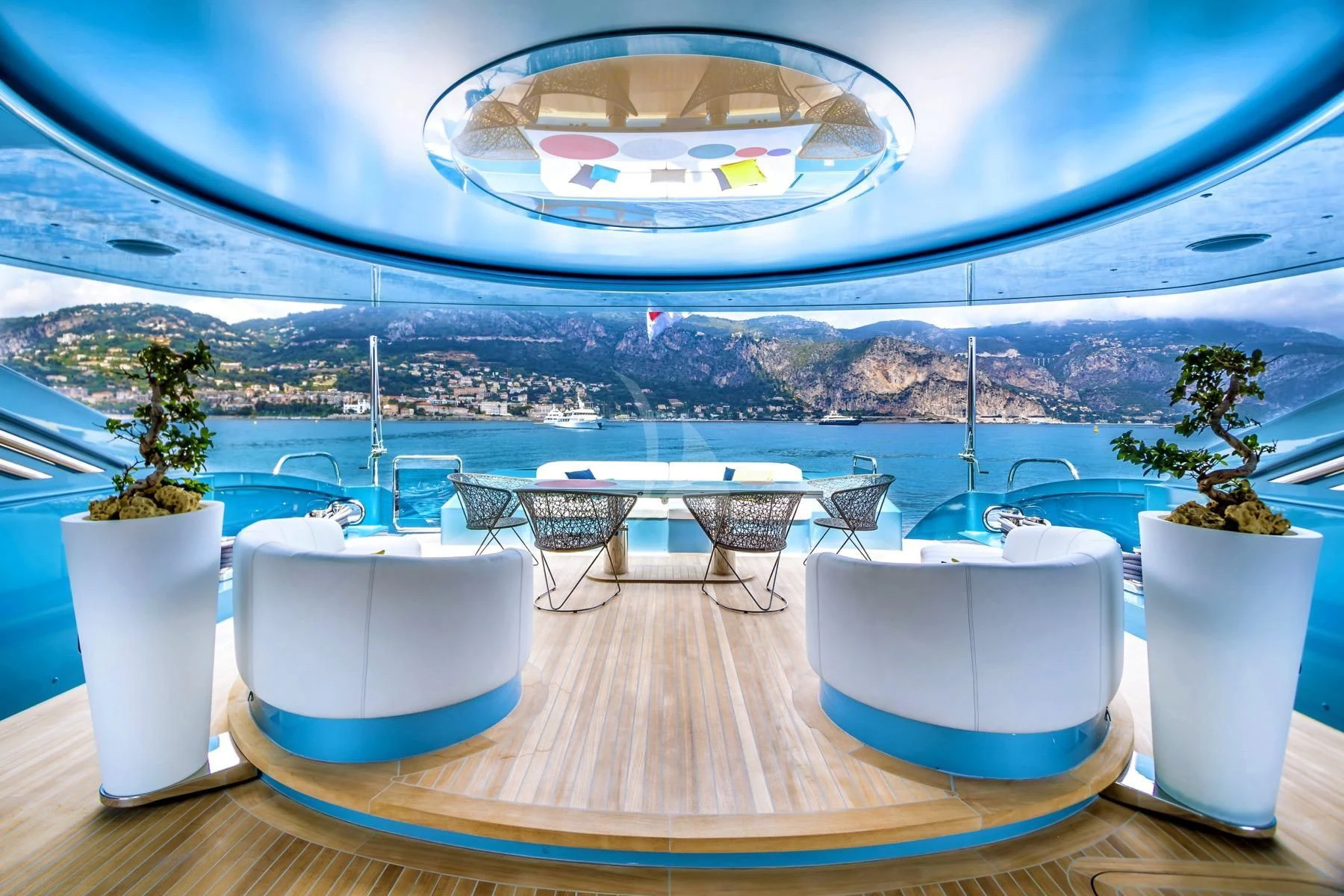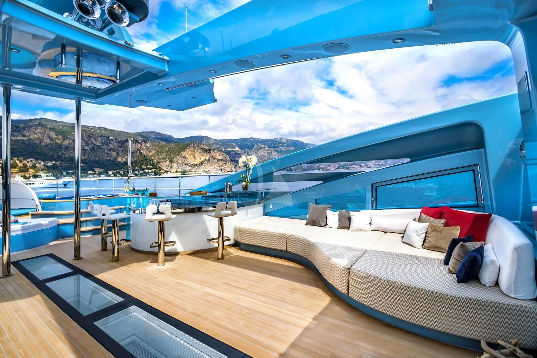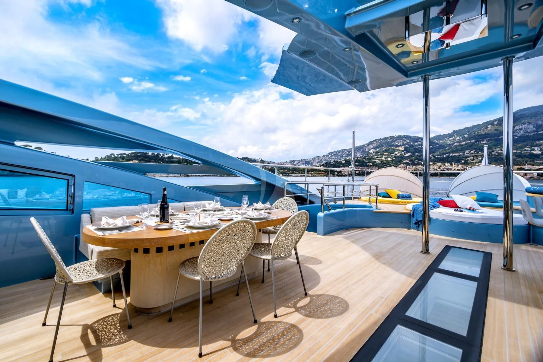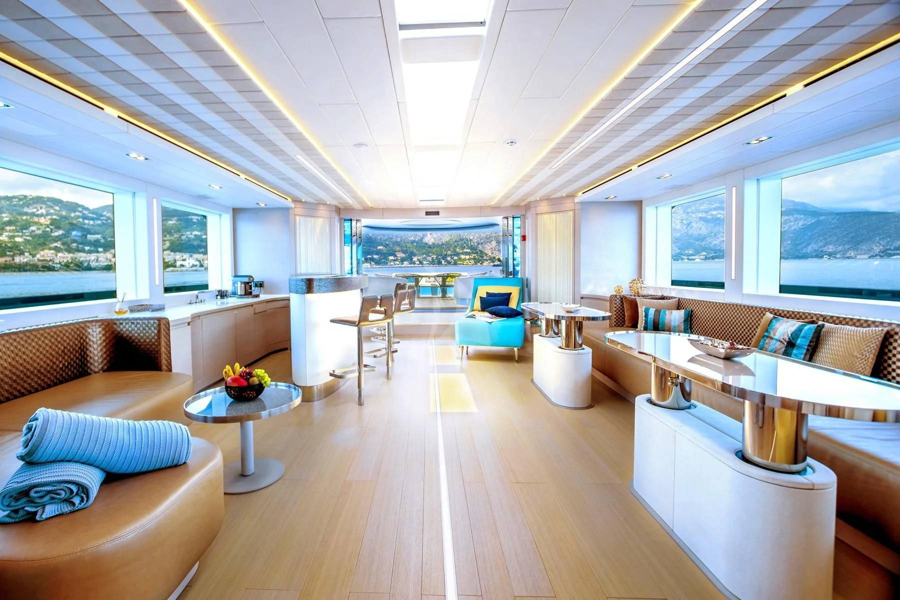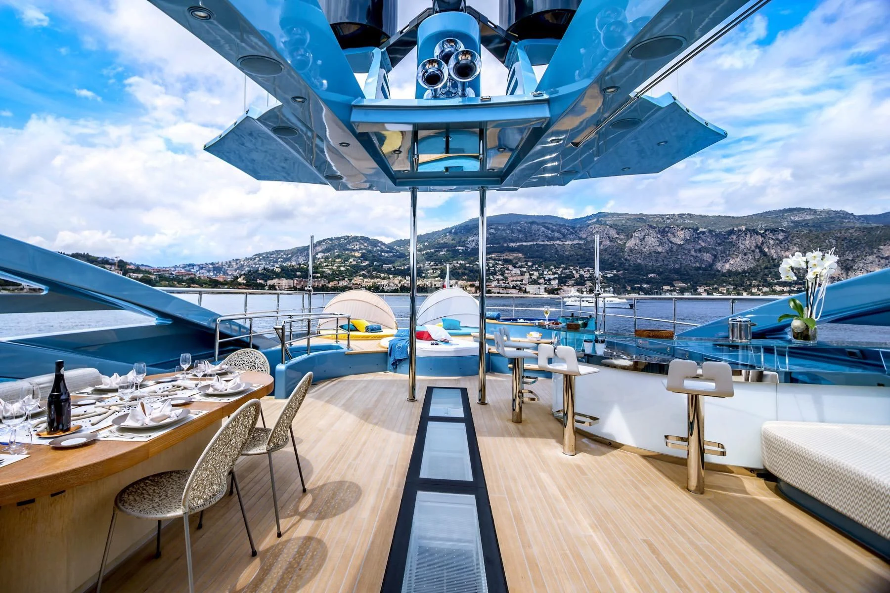 Her exterior design is nothing short of breathtaking. The expansive beam stretching to about 28 feet (8.6 meters) provides ample space for outdoor relaxation and entertainment areas. Her sundecks offer the perfect spot for sunbathing or simply enjoying panoramic ocean views under clear blue skies. Alfresco dining areas are strategically positioned to allow guests to relish their meals amidst serene seascapes, while lounging areas provide comfortable spaces for rest and recreation.