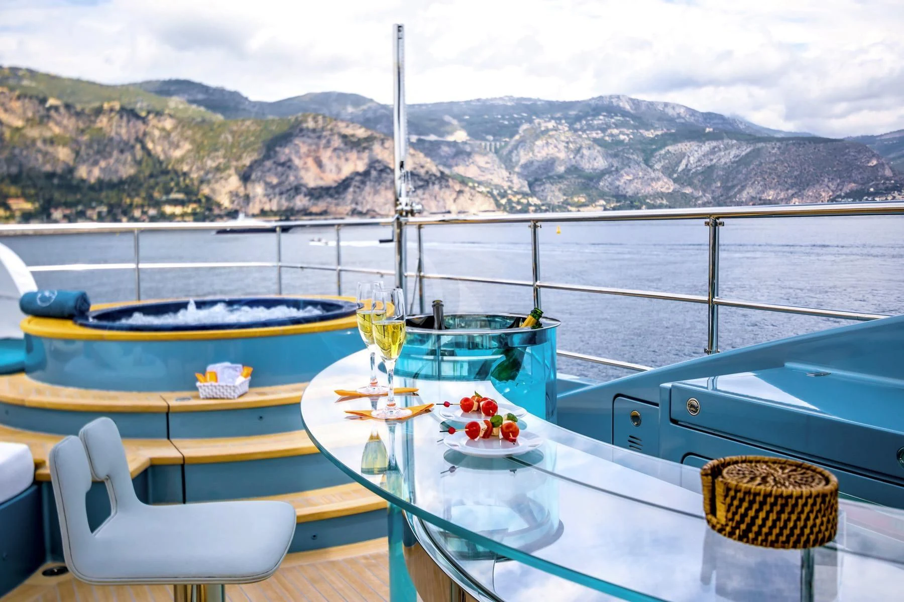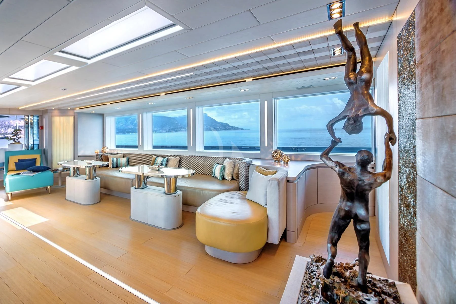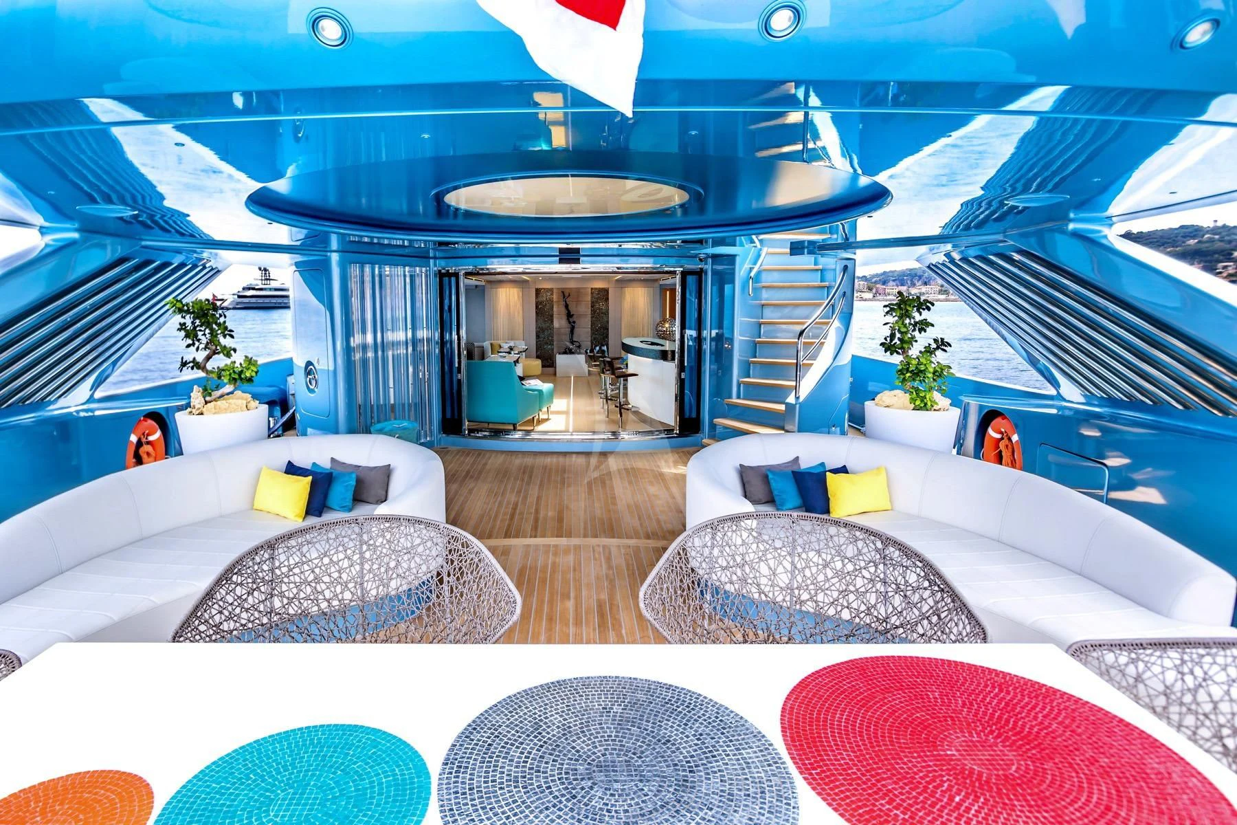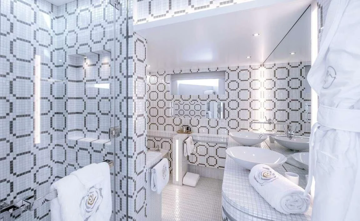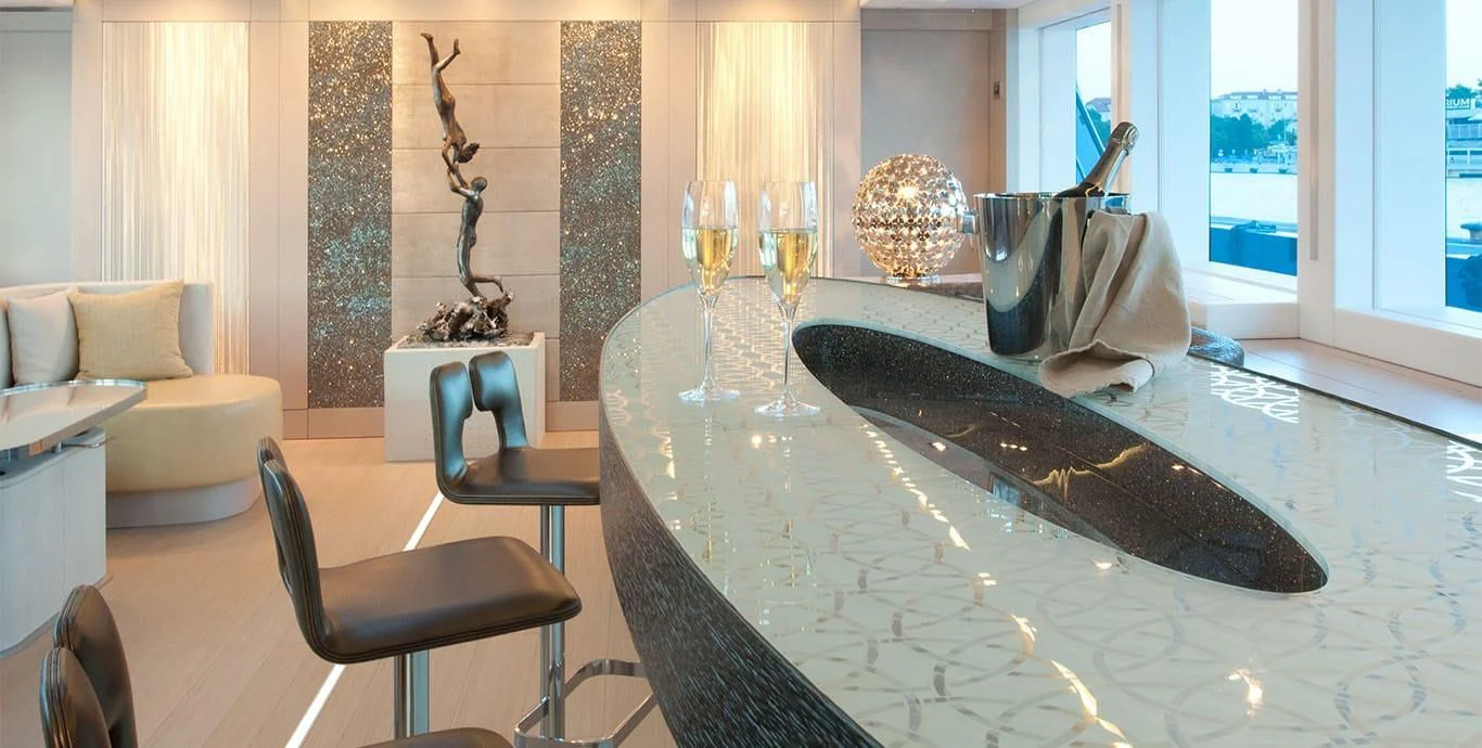 Her exterior design is nothing short of breathtaking. The expansive beam stretching to about 28 feet (8.6 meters) provides ample space for outdoor relaxation and entertainment areas. Her sundecks offer the perfect spot for sunbathing or simply enjoying panoramic ocean views under clear blue skies. Alfresco dining areas are strategically positioned to allow guests to relish their meals amidst serene seascapes, while lounging areas provide comfortable spaces for rest and recreation.