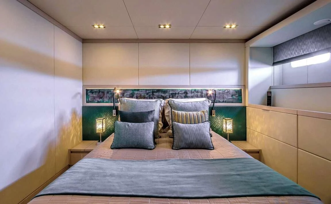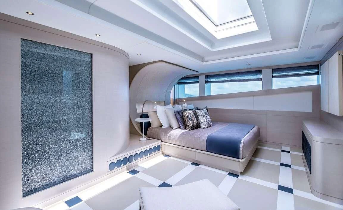Stepping inside the QUEEN ALLA reveals an interior that exudes sophistication and style at its finest. Every corner reflects meticulous attention to detail by renowned designers who have seamlessly blended modern aesthetics with timeless elegance. A soothing color palette graces each room, creating an atmosphere of tranquility that resonates throughout the yacht's five luxurious cabins which can accommodate up to ten guests comfortably.