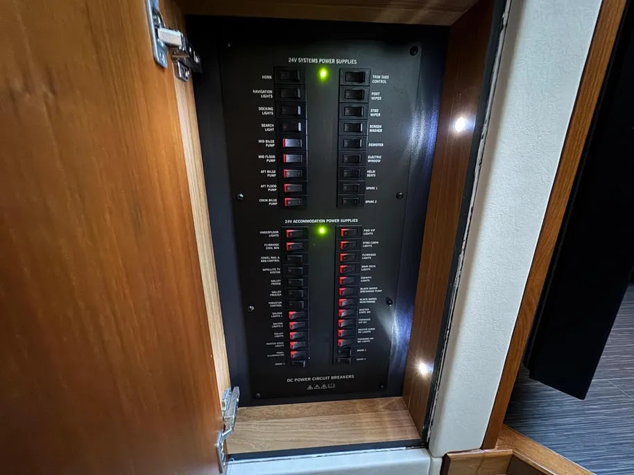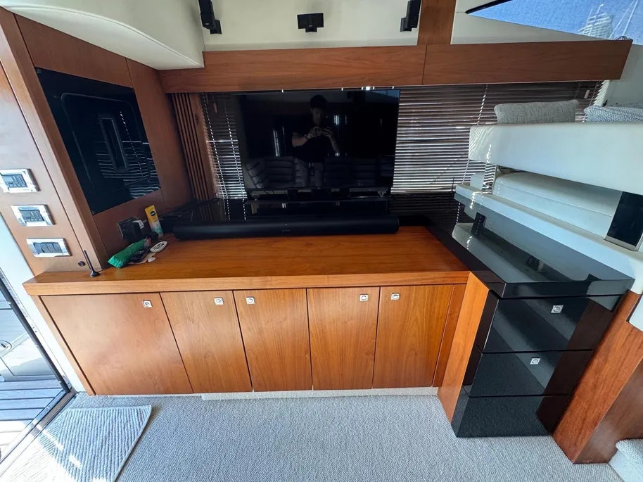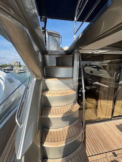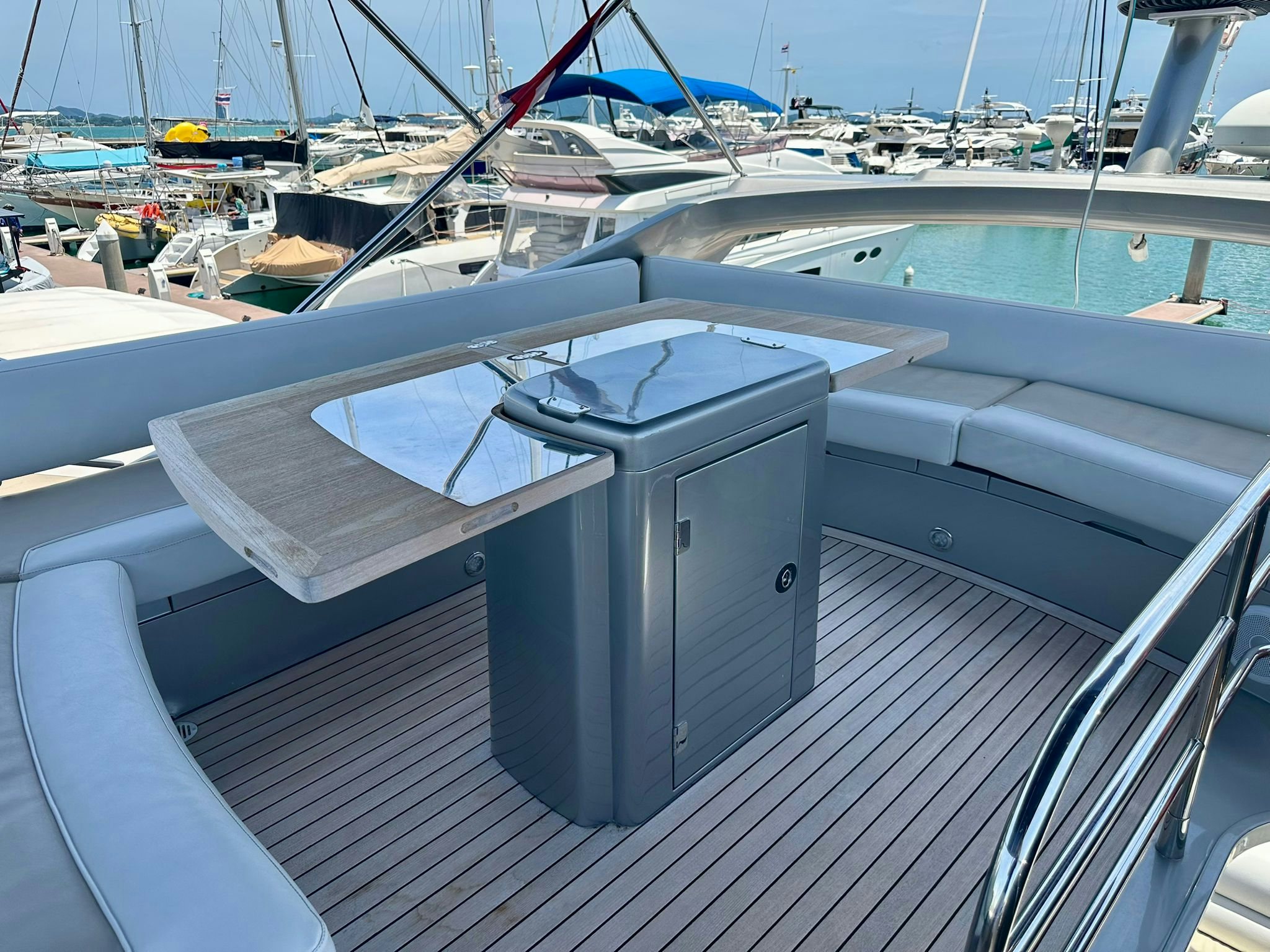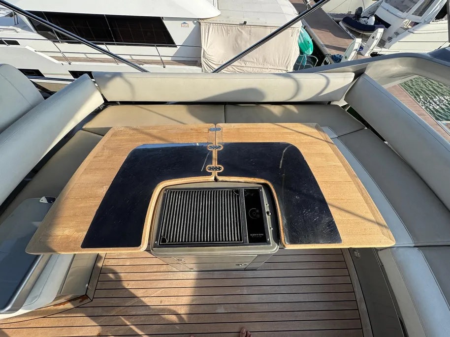 This elevated space includes a second helm station with commanding views, wrap-around seating, a wet bar, refrigerator, and often even an electric barbecue. A Bimini top provides shade, making this the go-to spot for entertaining underway or at anchor. In some configurations, there’s even a crane for tender launch and retrieval.