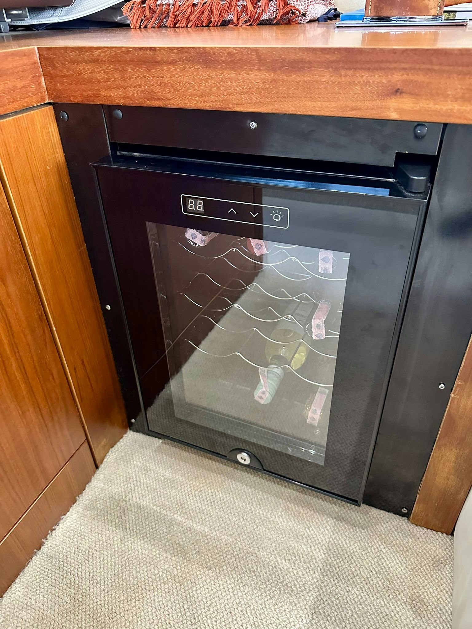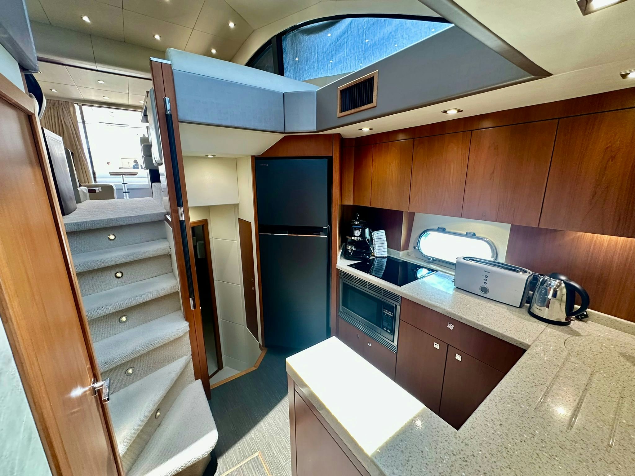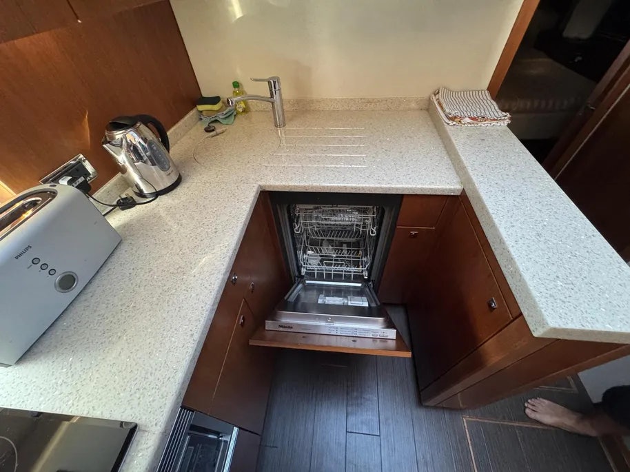 A few steps down from the main deck, the galley is cleverly designed for both functionality and style. It boasts a solid surface countertop, stainless steel sink, two-burner ceramic cooktop, microwave/convection oven, fridge and freezer, dishwasher, and generous storage in both overhead and under-counter cabinets. Whether you're prepping a quick lunch or a more elaborate meal, everything is within easy reach.