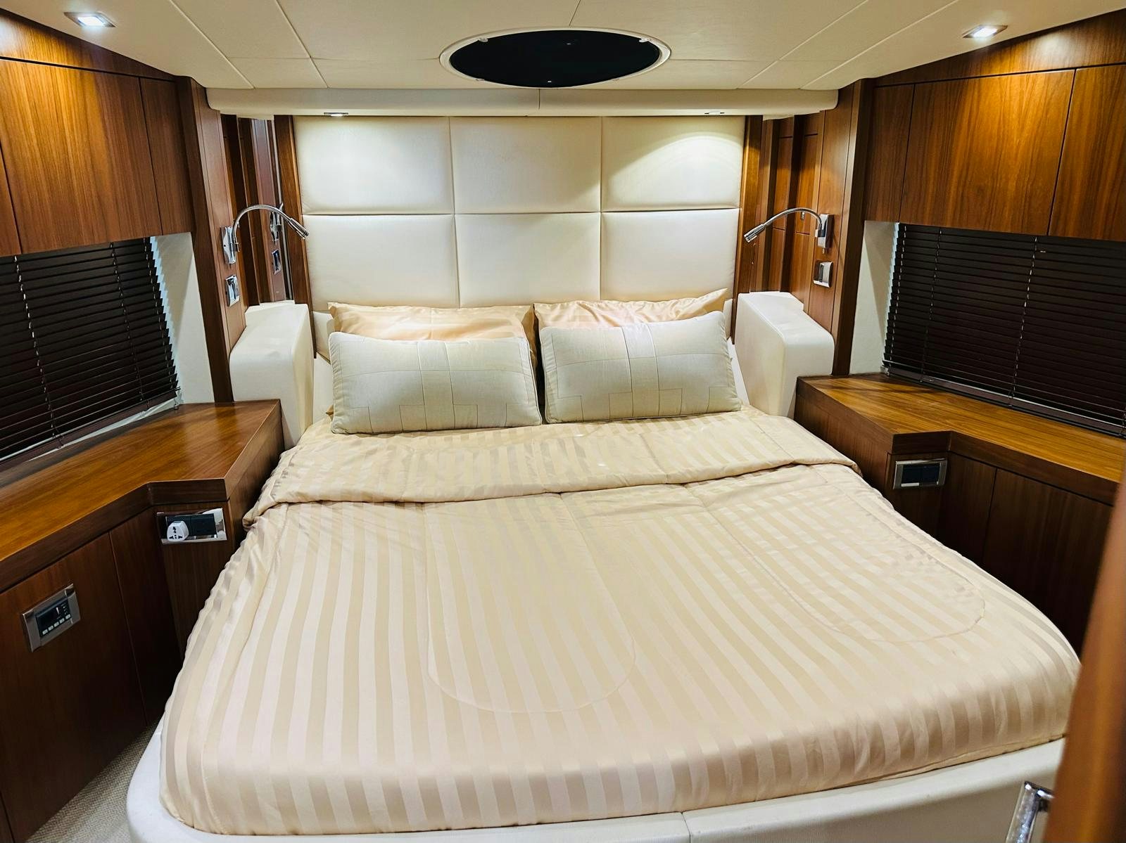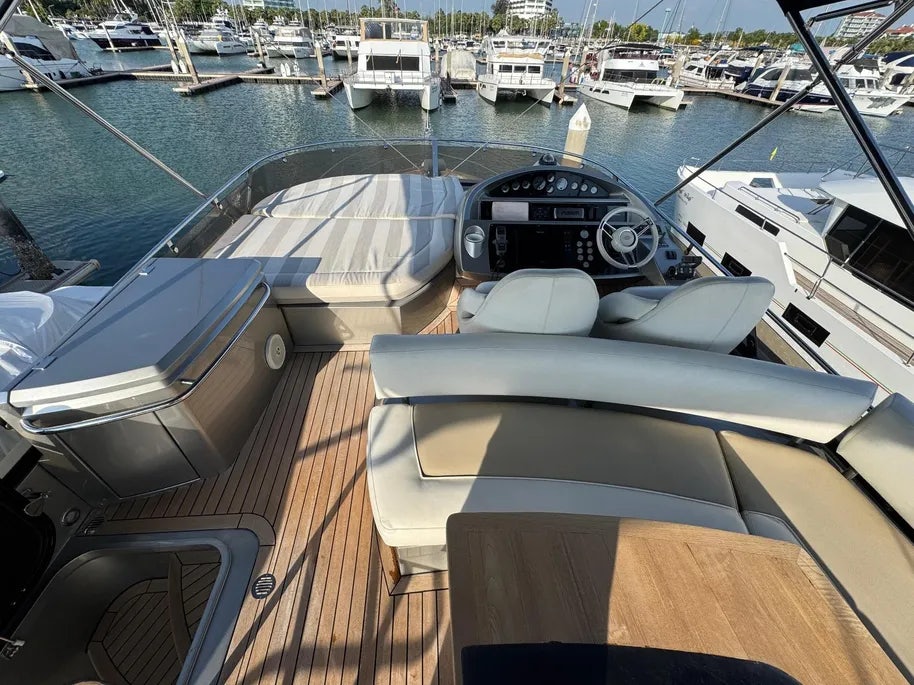 Outdoors, the Manhattan 53 delivers exactly what you’d expect from a Sunseeker. Her exterior is sleek and contemporary, finished with smooth lines and classic teak accents. The aft cockpit connects seamlessly to the main salon, creating an effortless indoor-outdoor flow, perfect for alfresco dining or lounging. The hydraulic swim platform isn't just for easy water access—it also serves as a launch system for a tender or water toys. Forward on the bow, you'll find sunpads ideal for soaking up the sun, while the flybridge is the ultimate social hub.