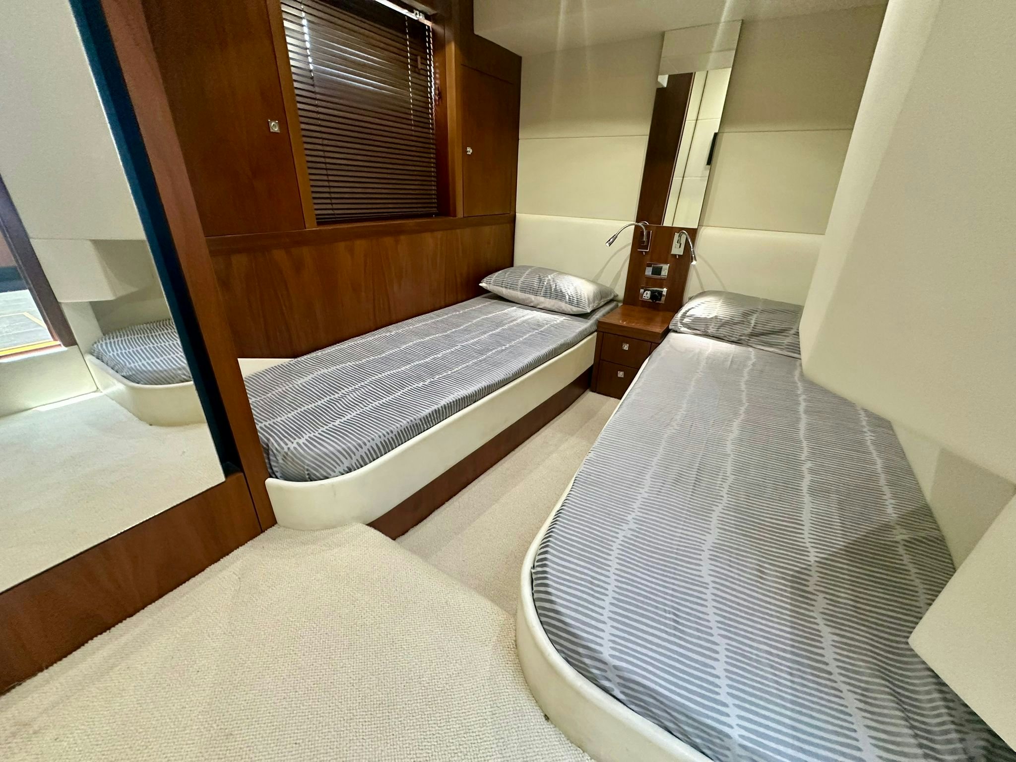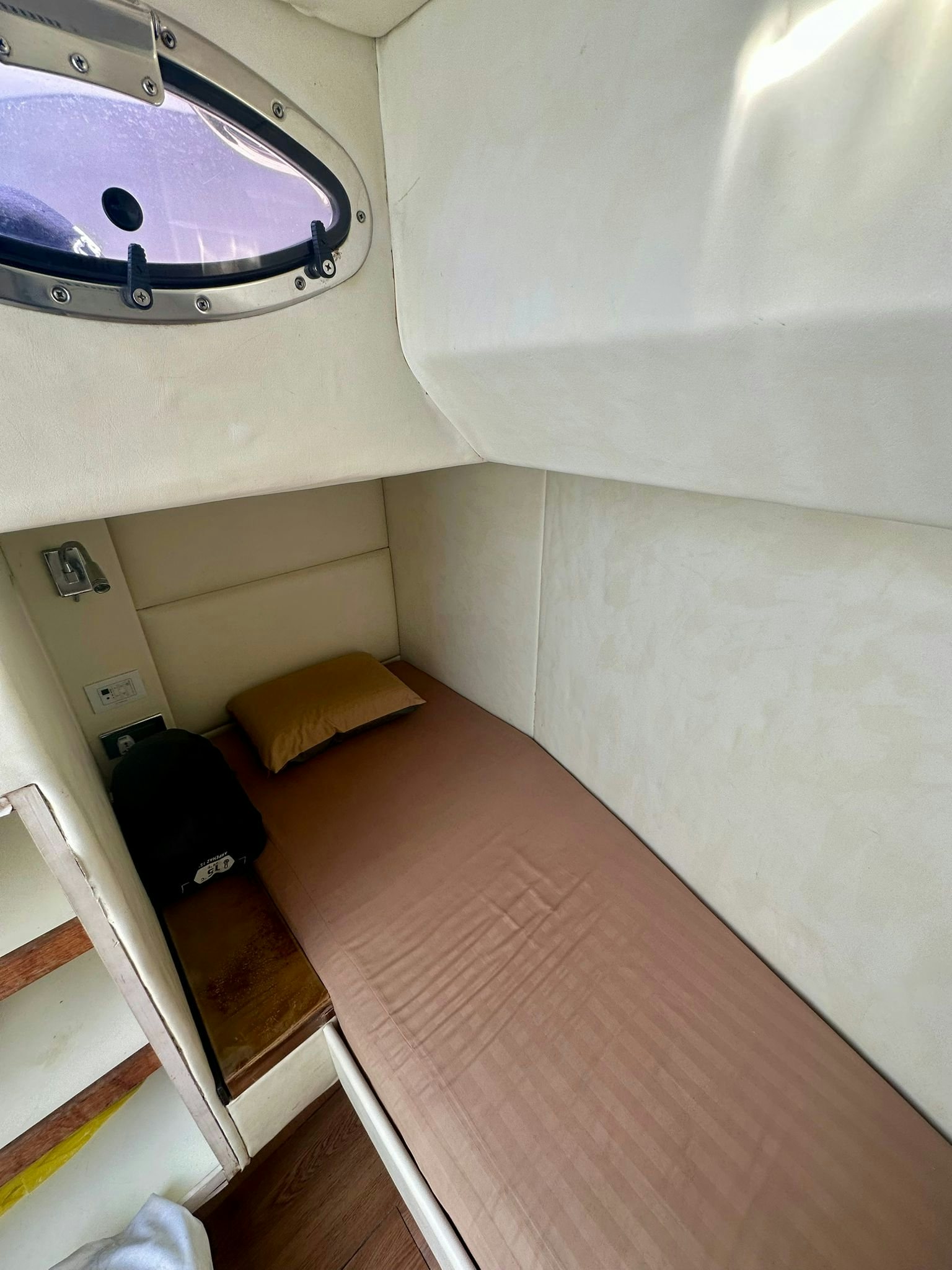 Below deck, QUICKSILVER I offers accommodation for up to eight guests across three well-appointed cabins. The full-beam master stateroom amidships is a true retreat, with a double bed, a vanity desk, large hull windows that bring in natural light, and an ensuite bathroom. The forward VIP cabin also features a double bed and enjoys either private or shared access to a well-equipped bathroom. A third twin cabin midship adds flexibility for families or additional guests and shares a bathroom with the VIP.
