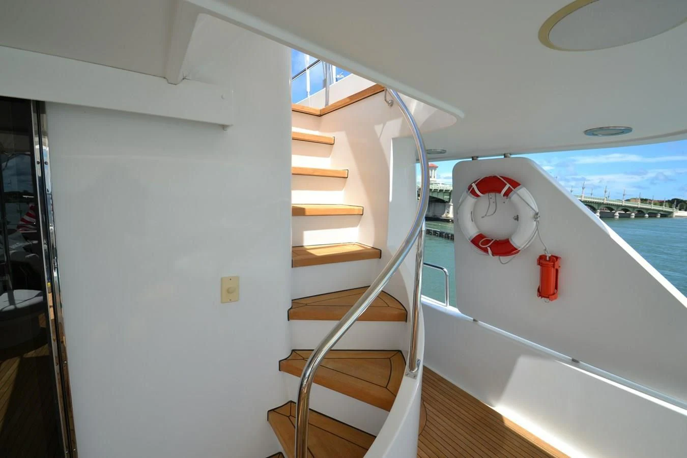 - A comfortable circular stairwell winds upward to Skylounge and Pilothouse areas on the Boat Deck above. The staircase is carpeted and has a Cherrywood handrail and integral step lighting.