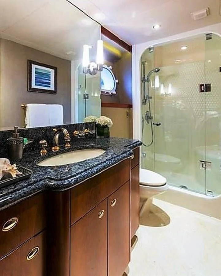 - The Main Deck day head is located near the forward end of the foyer and has inlaid marble flooring, an onyx granite lavatory top with THG gold designer lavatory faucets.