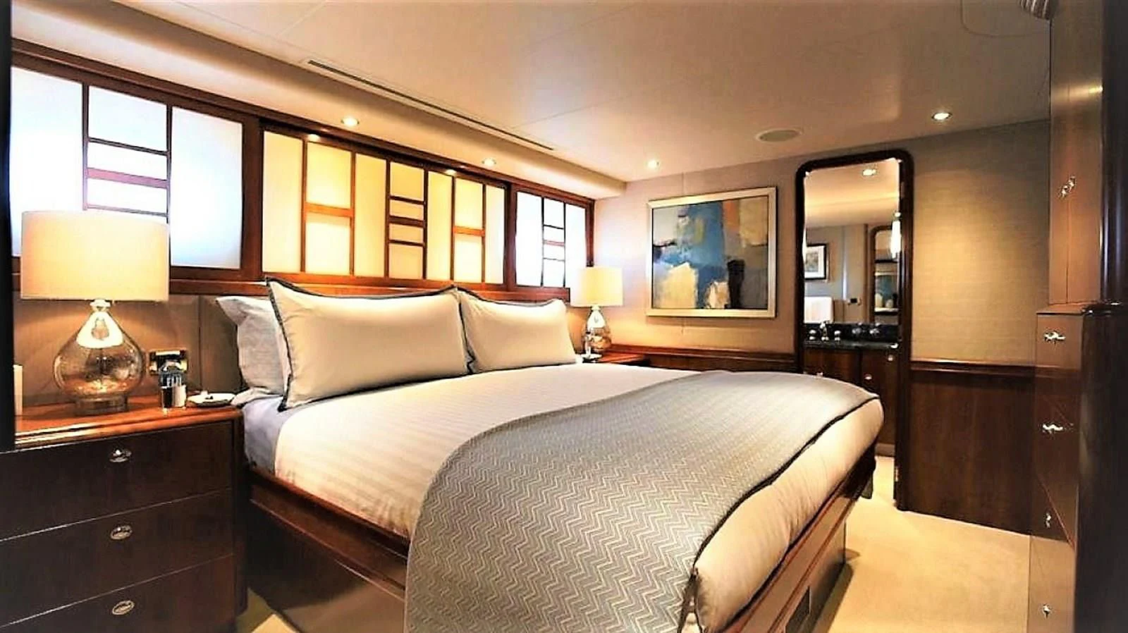 - Captain’s cabin with double bed, cabinetry, and ensuite head and shower