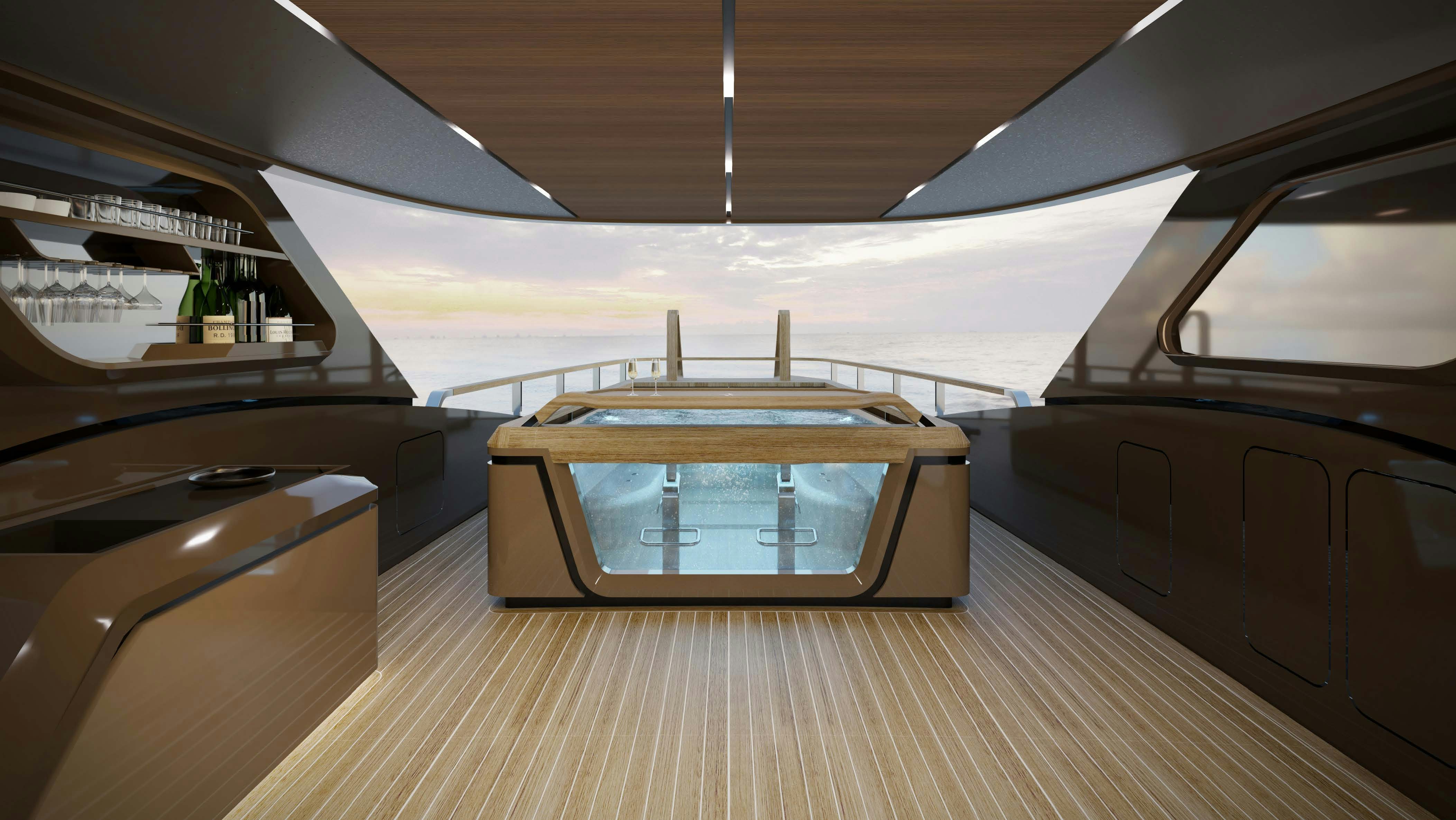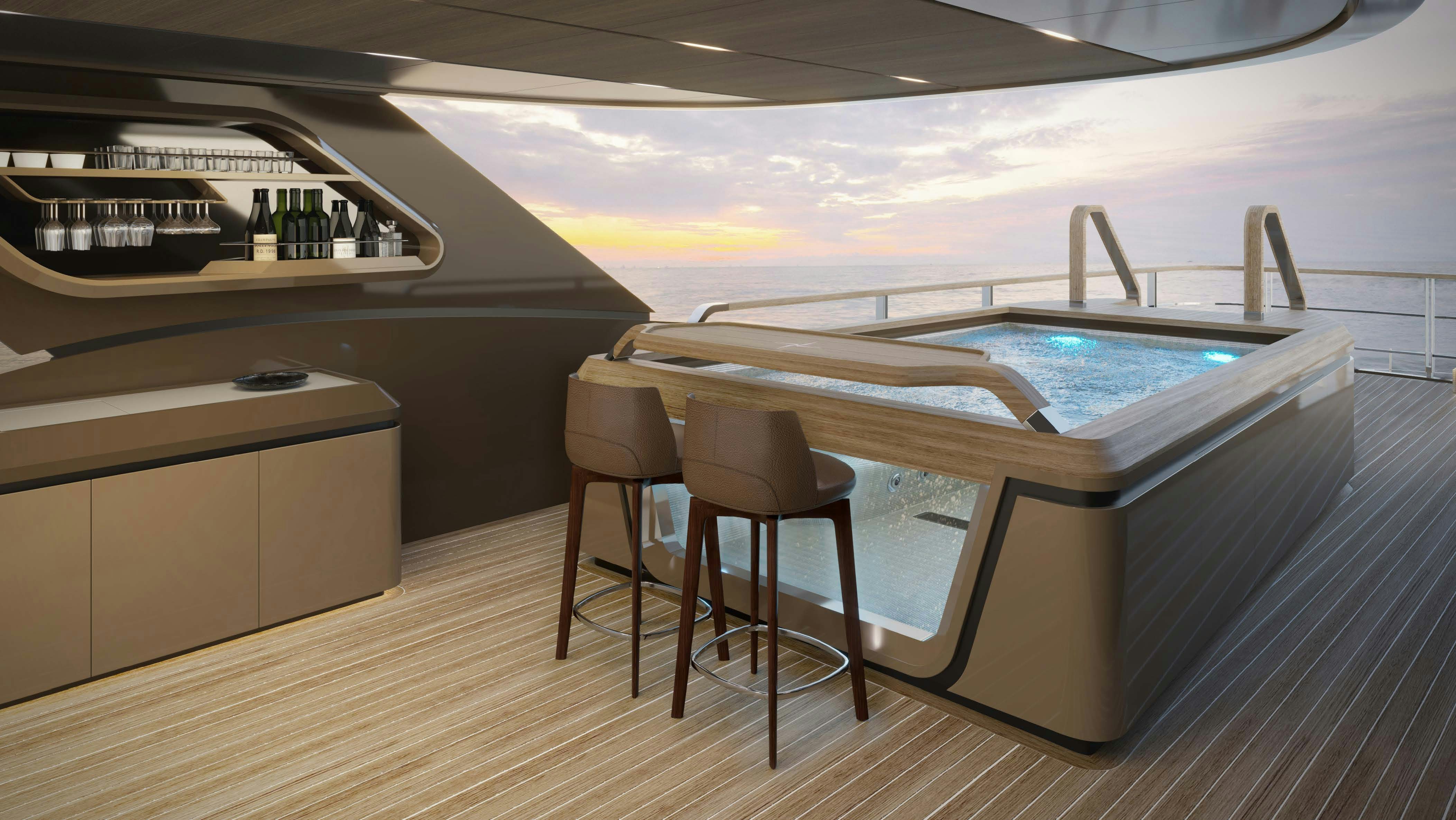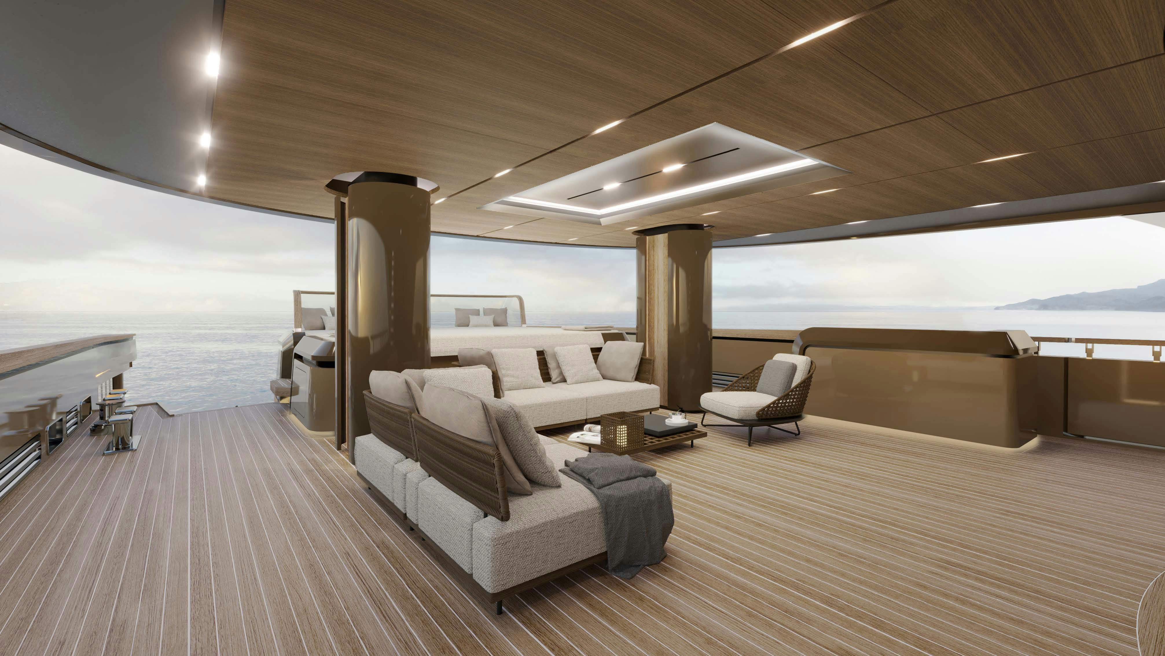 Outdoor living is equally dynamic. Her sleek profile masks an array of standout amenities: two aft decks designed for lounging and alfresco dining, a sundeck Jacuzzi paired with a gym, massage bed, bar, and even a dedicated dance floor. Aft, a beach club with shaded sunpads provides a spectacular platform for ocean access via a custom swim ladder. Perhaps most unique is her touch-and-go helipad, a circular foredeck space that transforms from an arrival zone to an open-air cinema, sunpad lounge, or winter-ready firelit terrace. It's a true stage for all-season adventure.