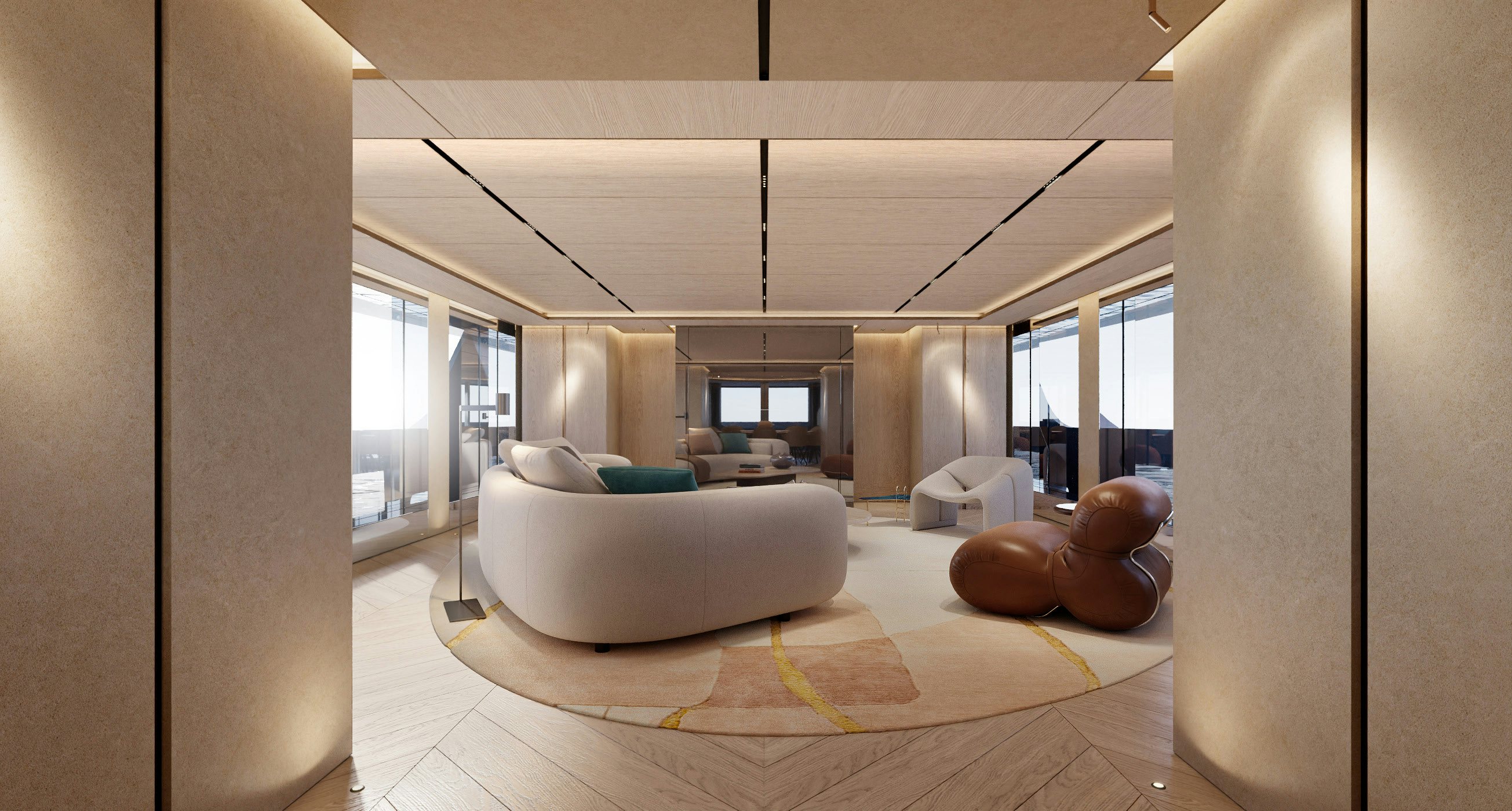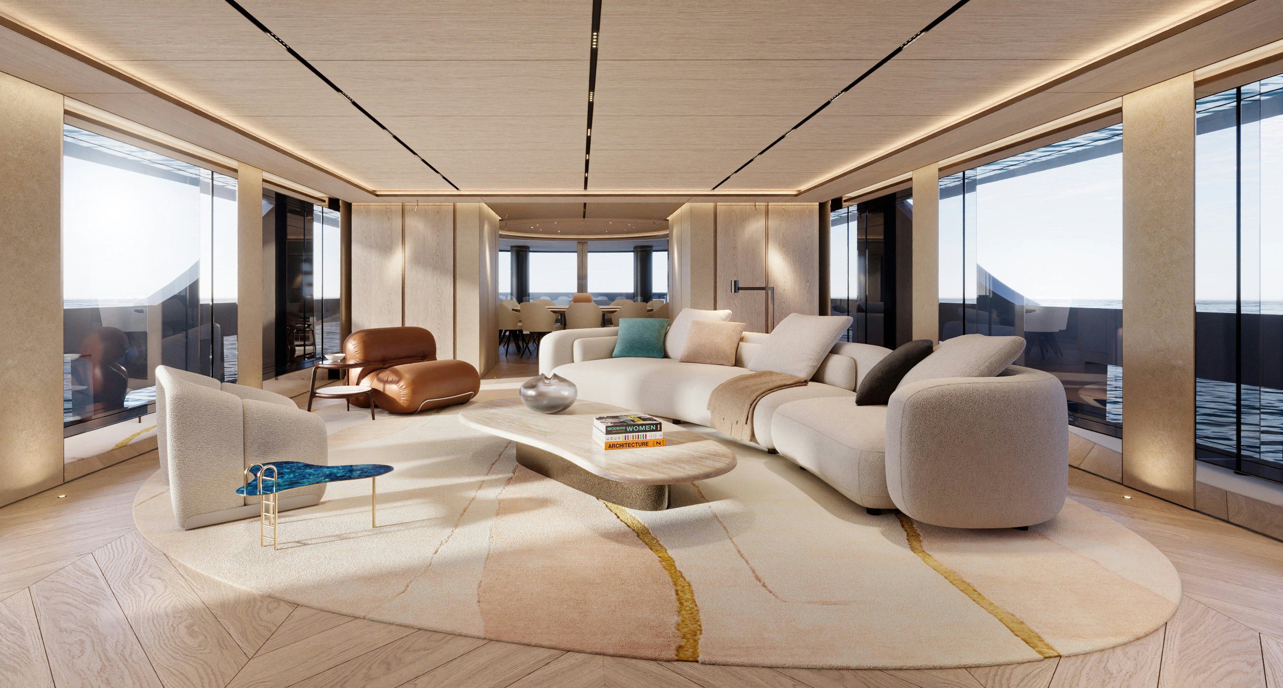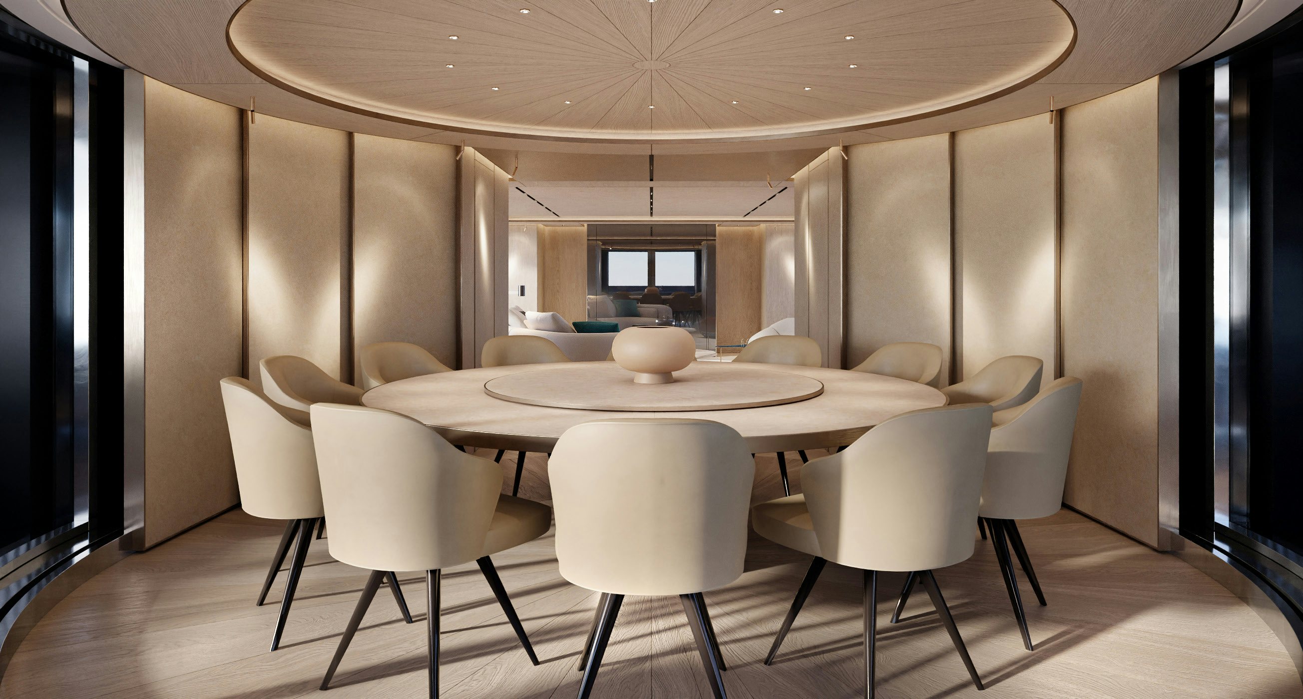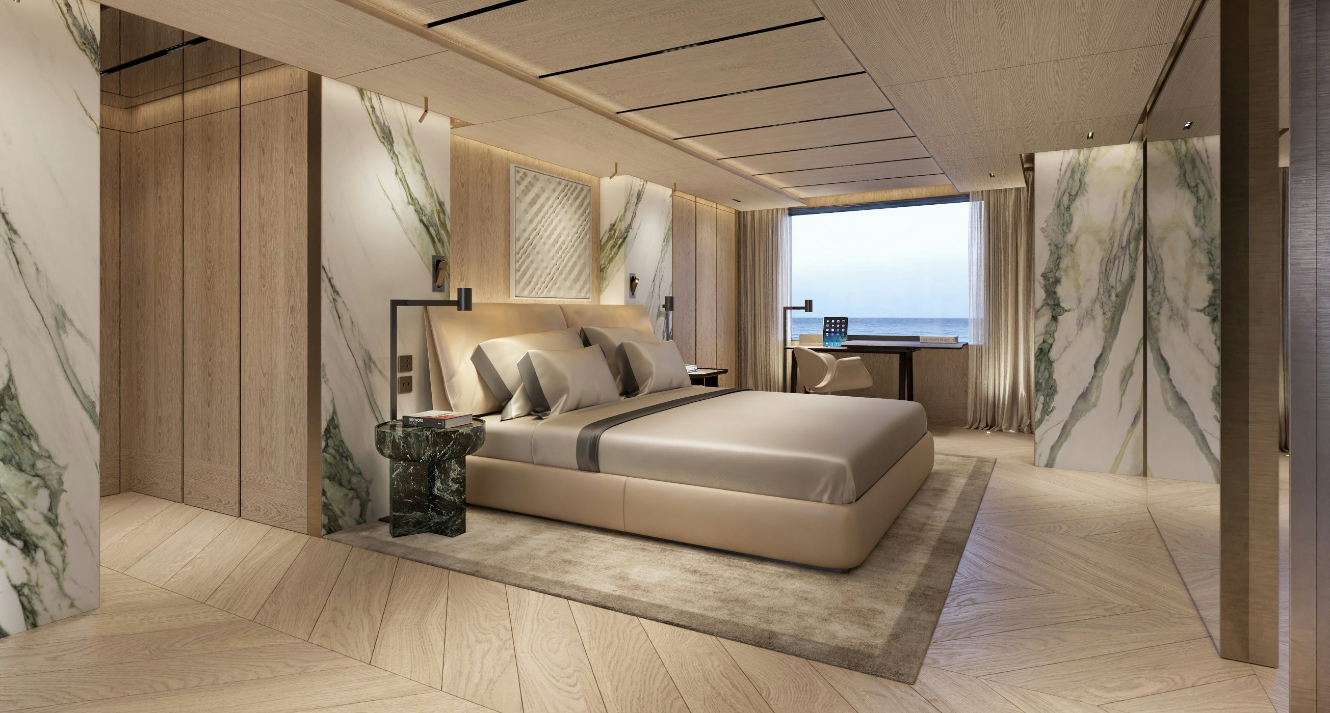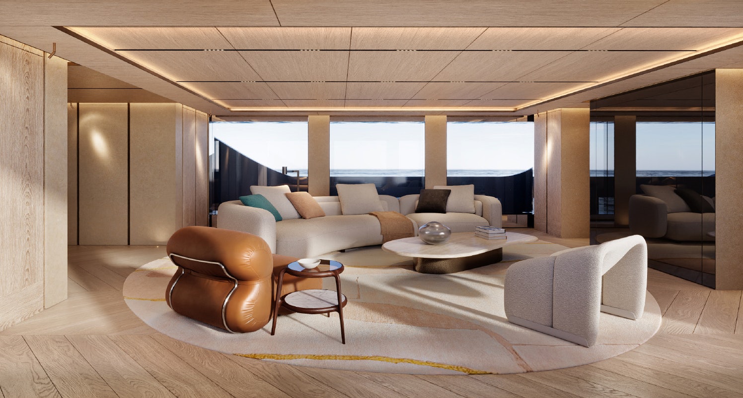 Accommodation is generous and refined. The owner’s suite and private office occupy the forward main deck, enjoying expansive views and privacy. Below, the guest quarters include a VIP cabin and four additional guest staterooms, allowing for 12 guests across six cabins, all serviced by a crew of 11. Natural light, neutral tones, and refined textures continue throughout the accommodation spaces, enhancing the yacht’s home-away-from-home appeal.
