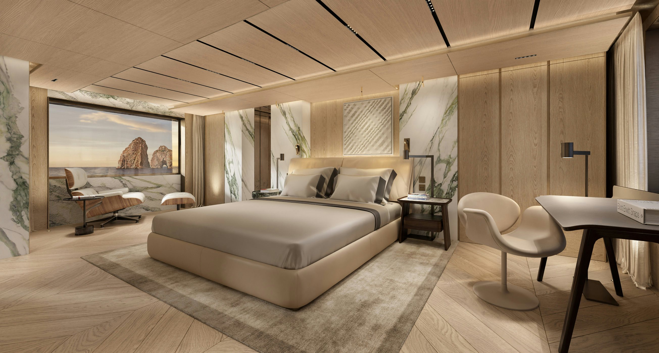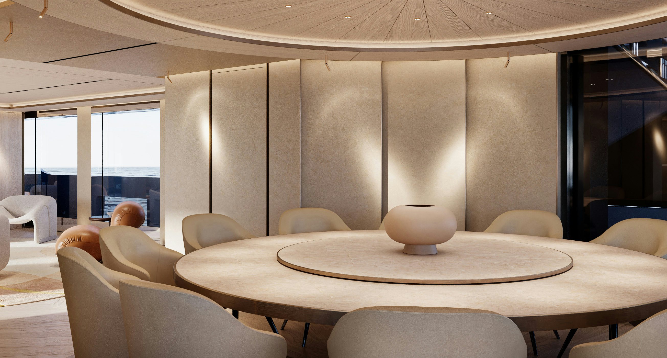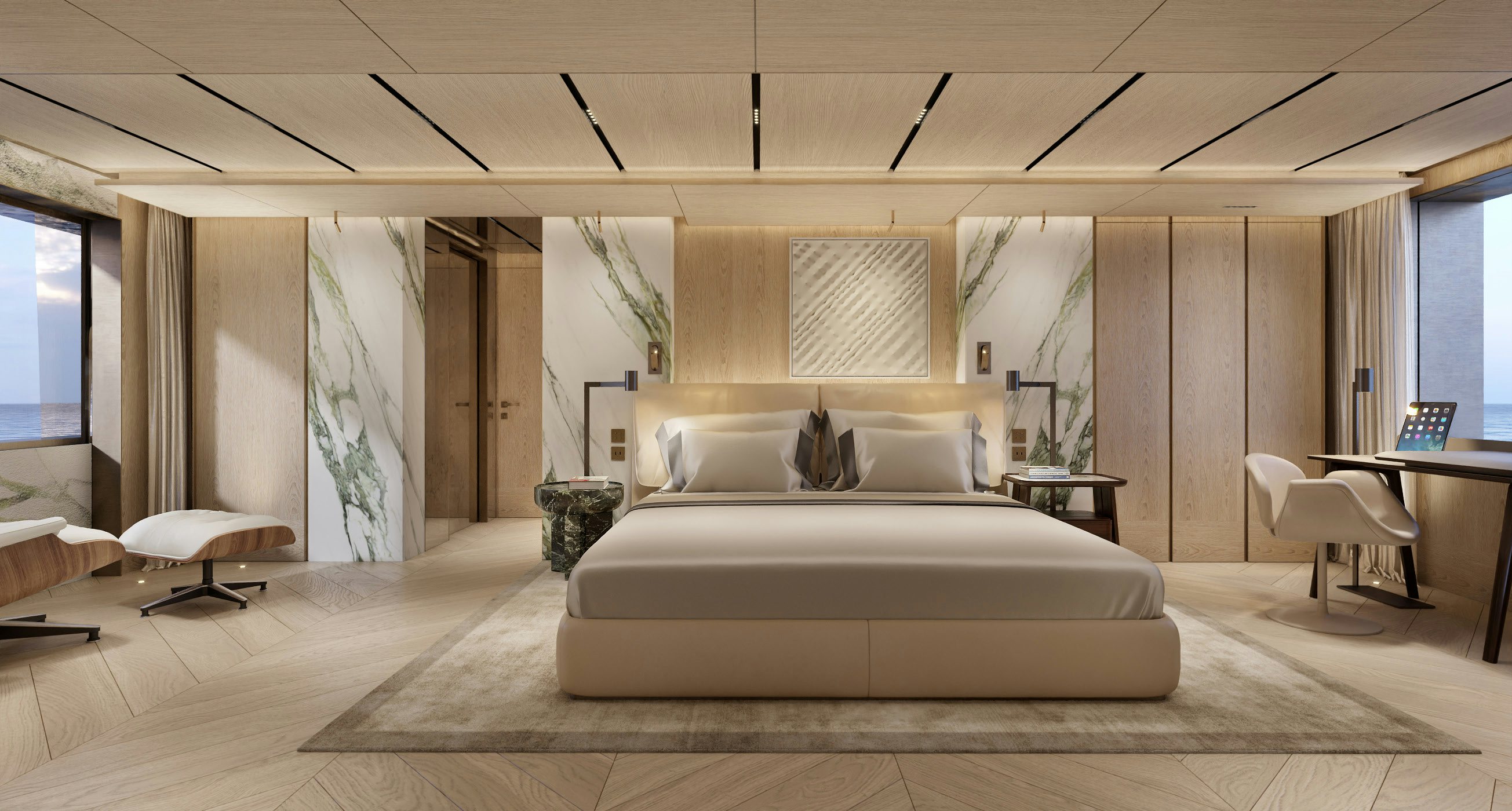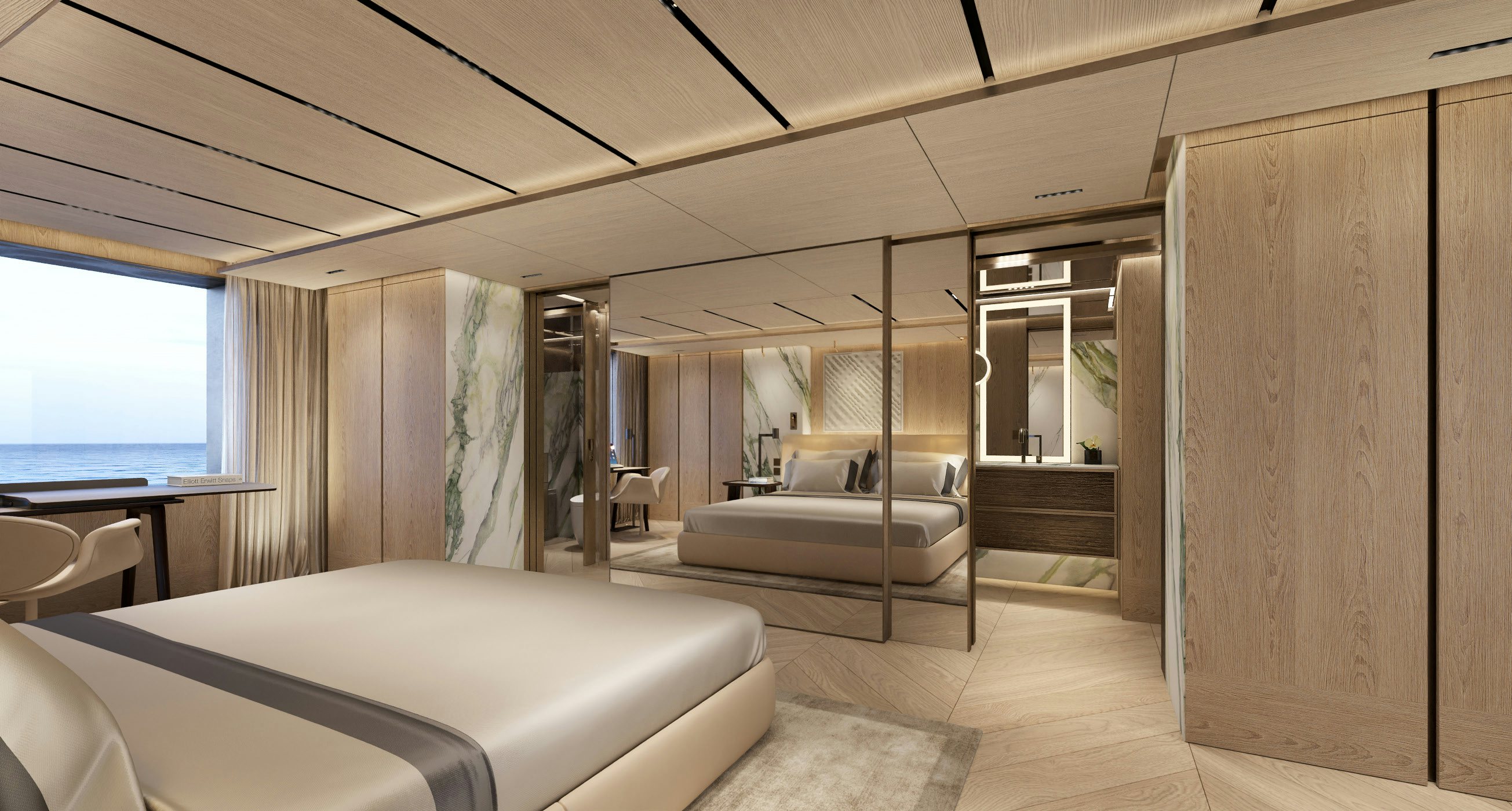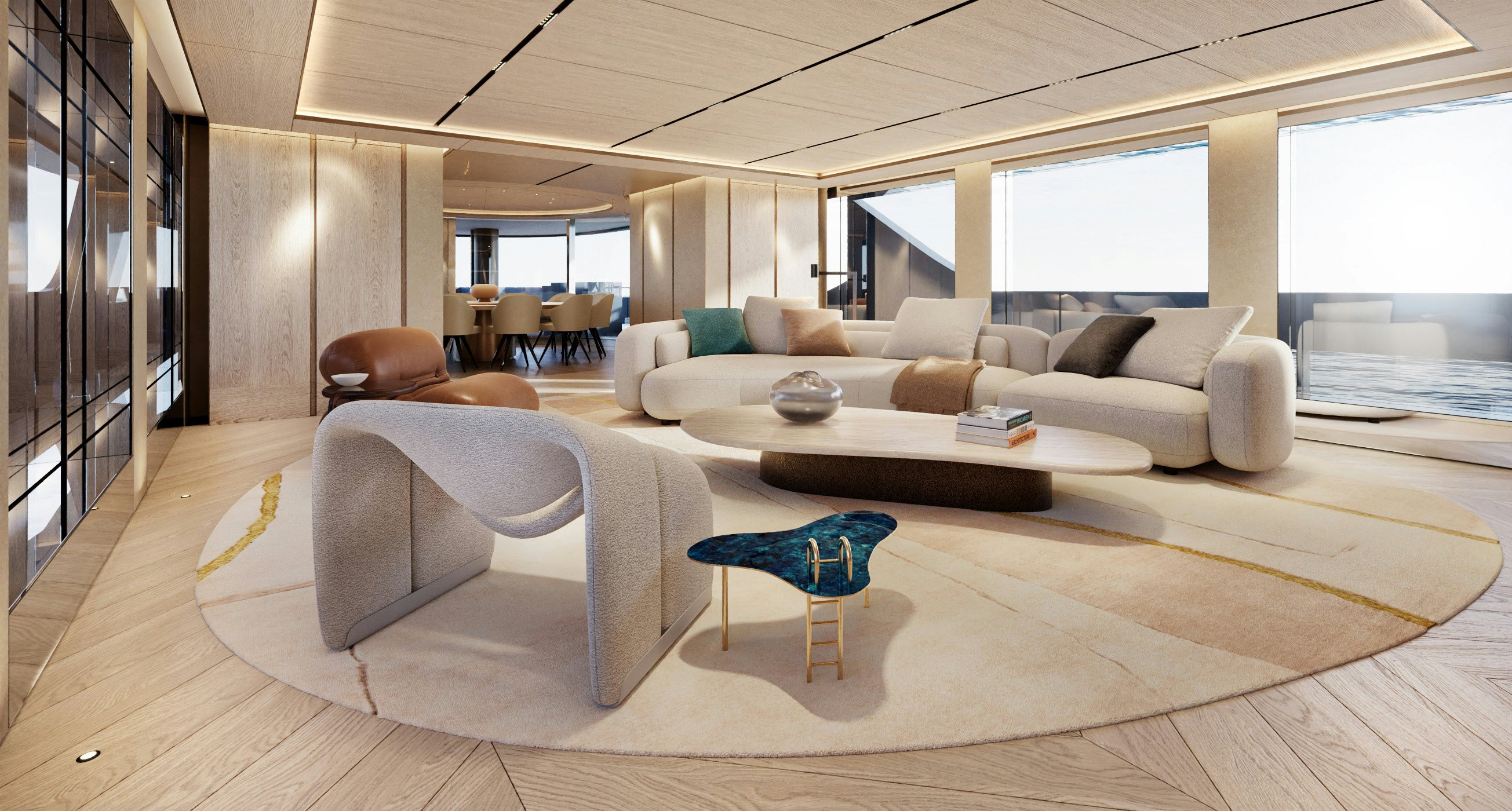 Accommodation is generous and refined. The owner’s suite and private office occupy the forward main deck, enjoying expansive views and privacy. Below, the guest quarters include a VIP cabin and four additional guest staterooms, allowing for 12 guests across six cabins, all serviced by a crew of 11. Natural light, neutral tones, and refined textures continue throughout the accommodation spaces, enhancing the yacht’s home-away-from-home appeal.