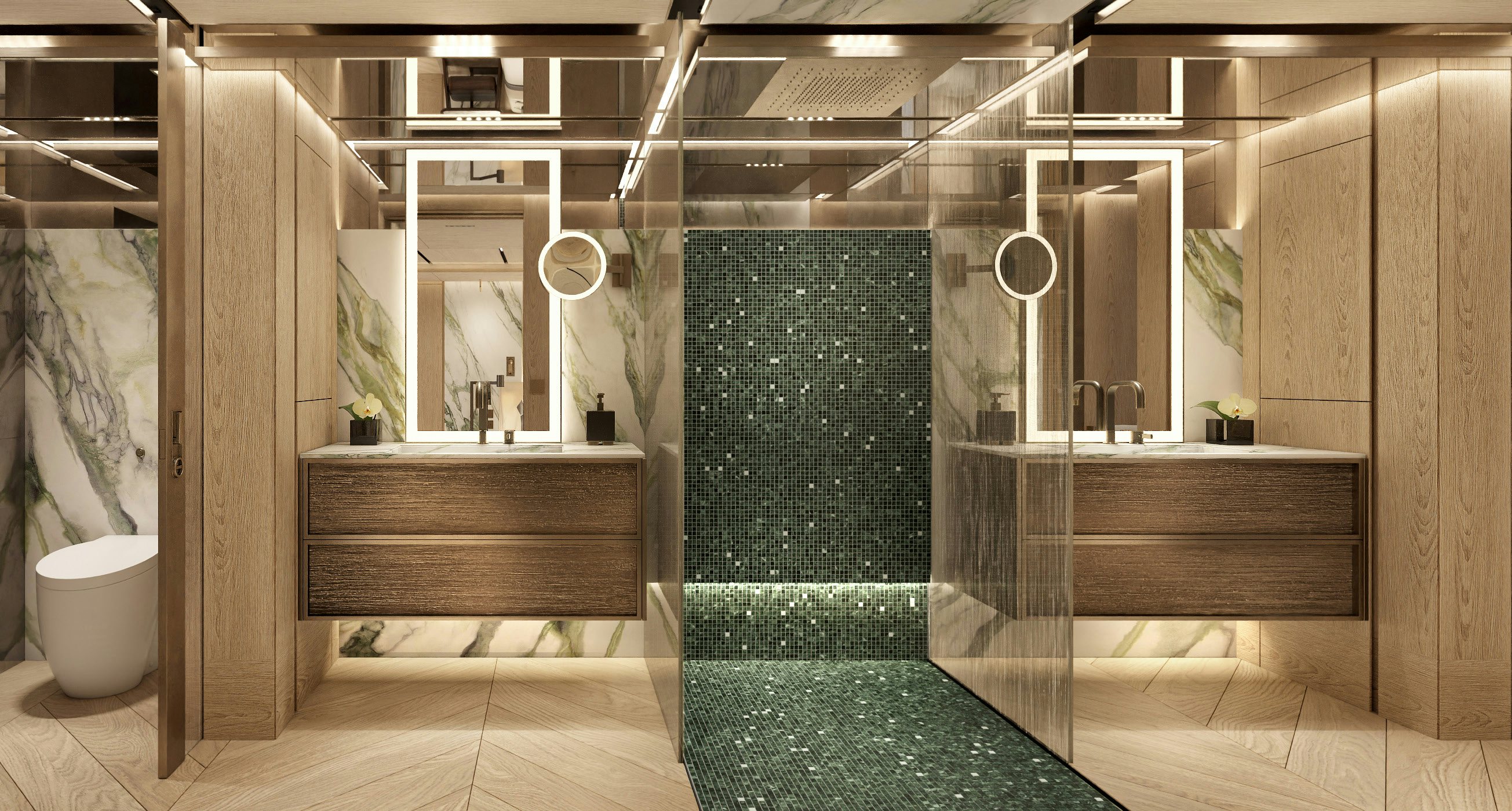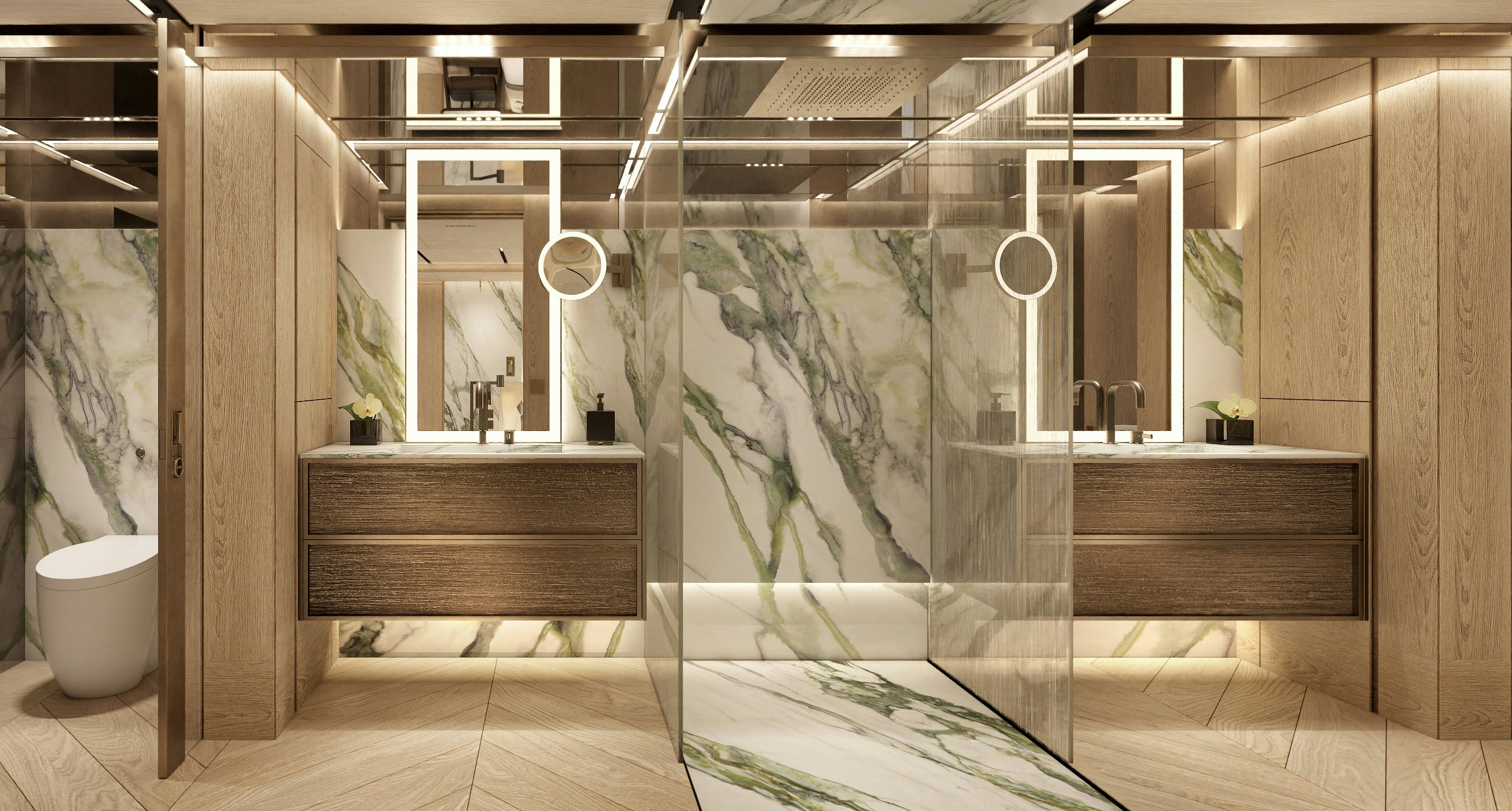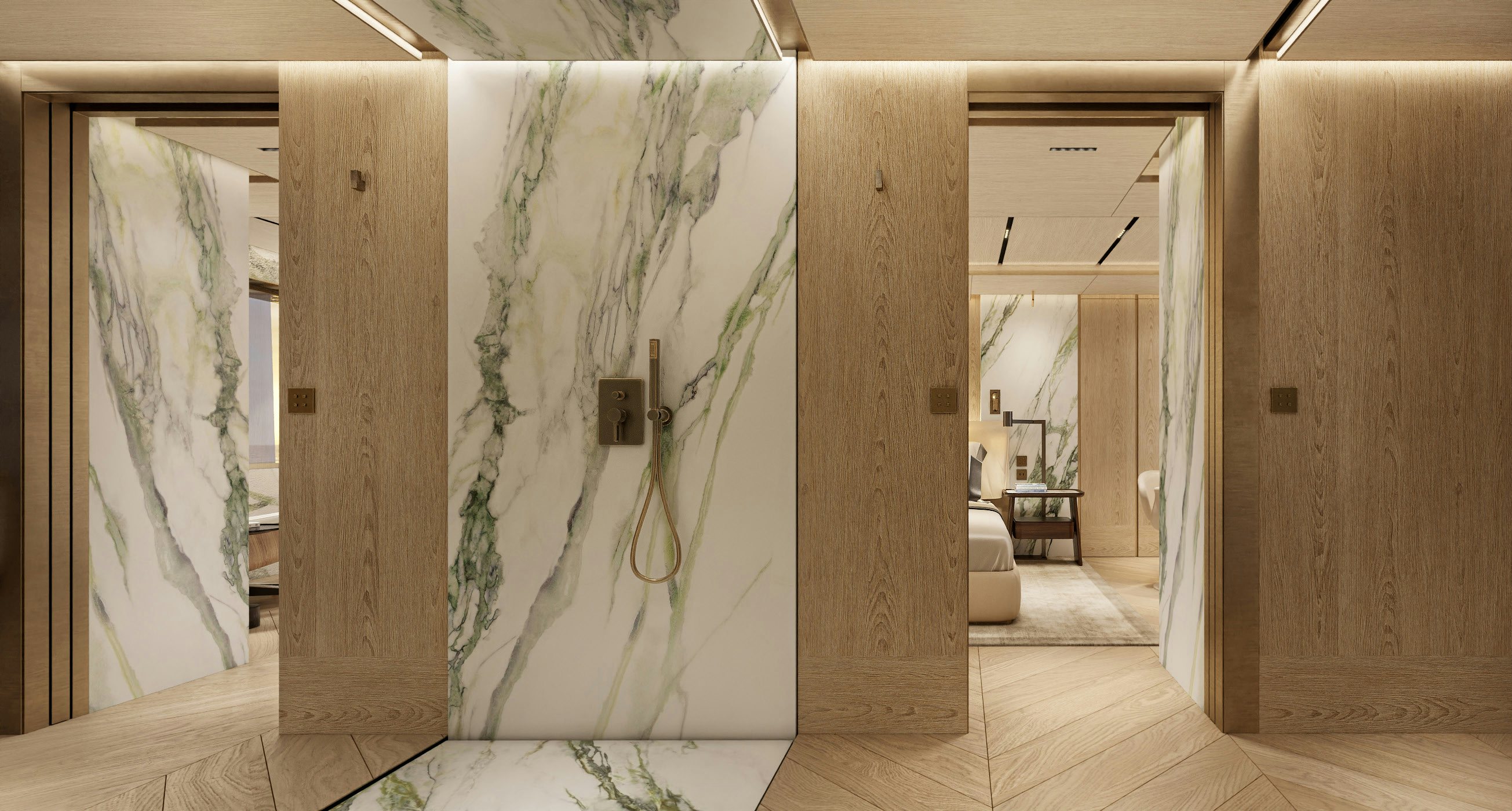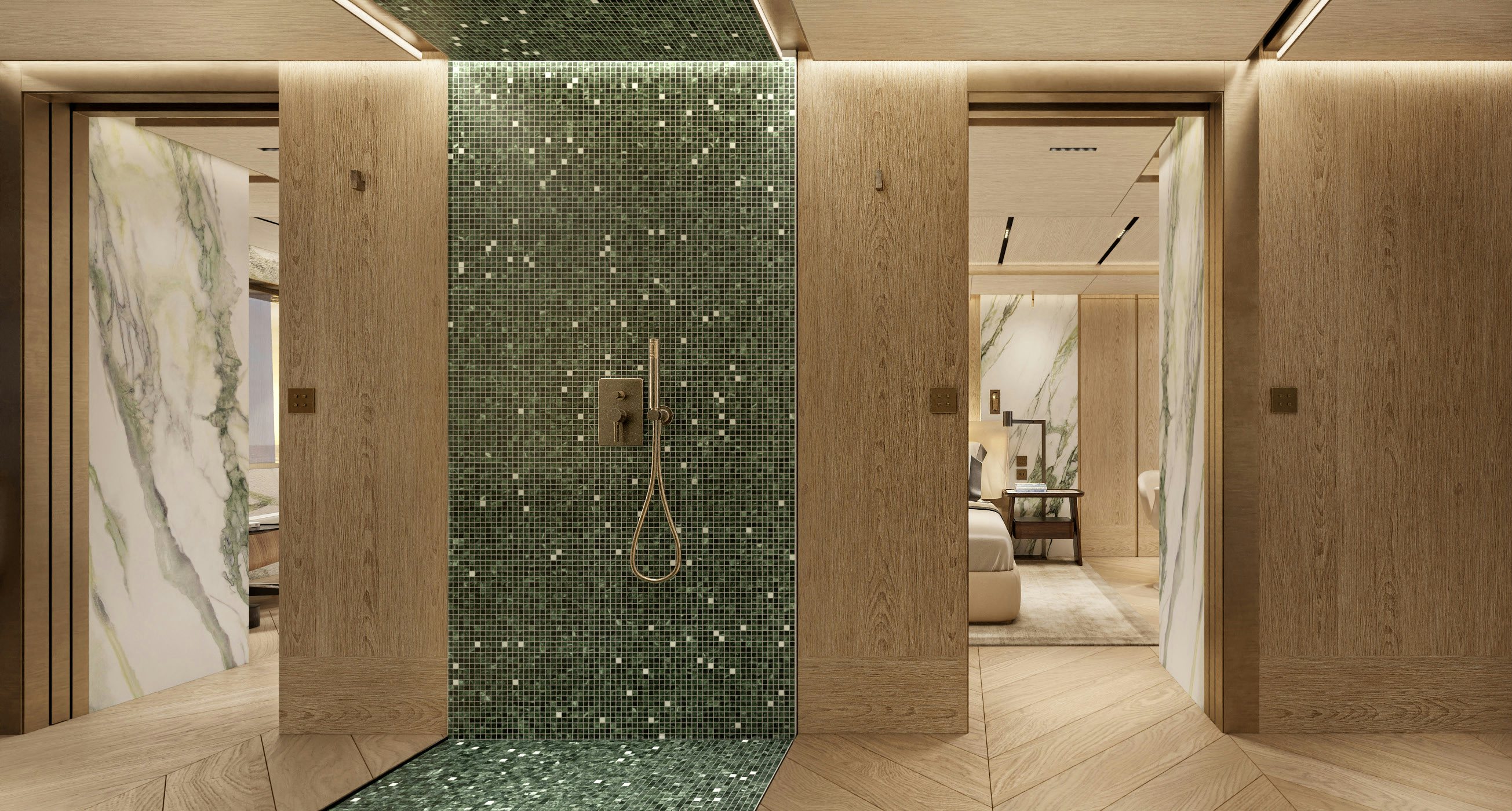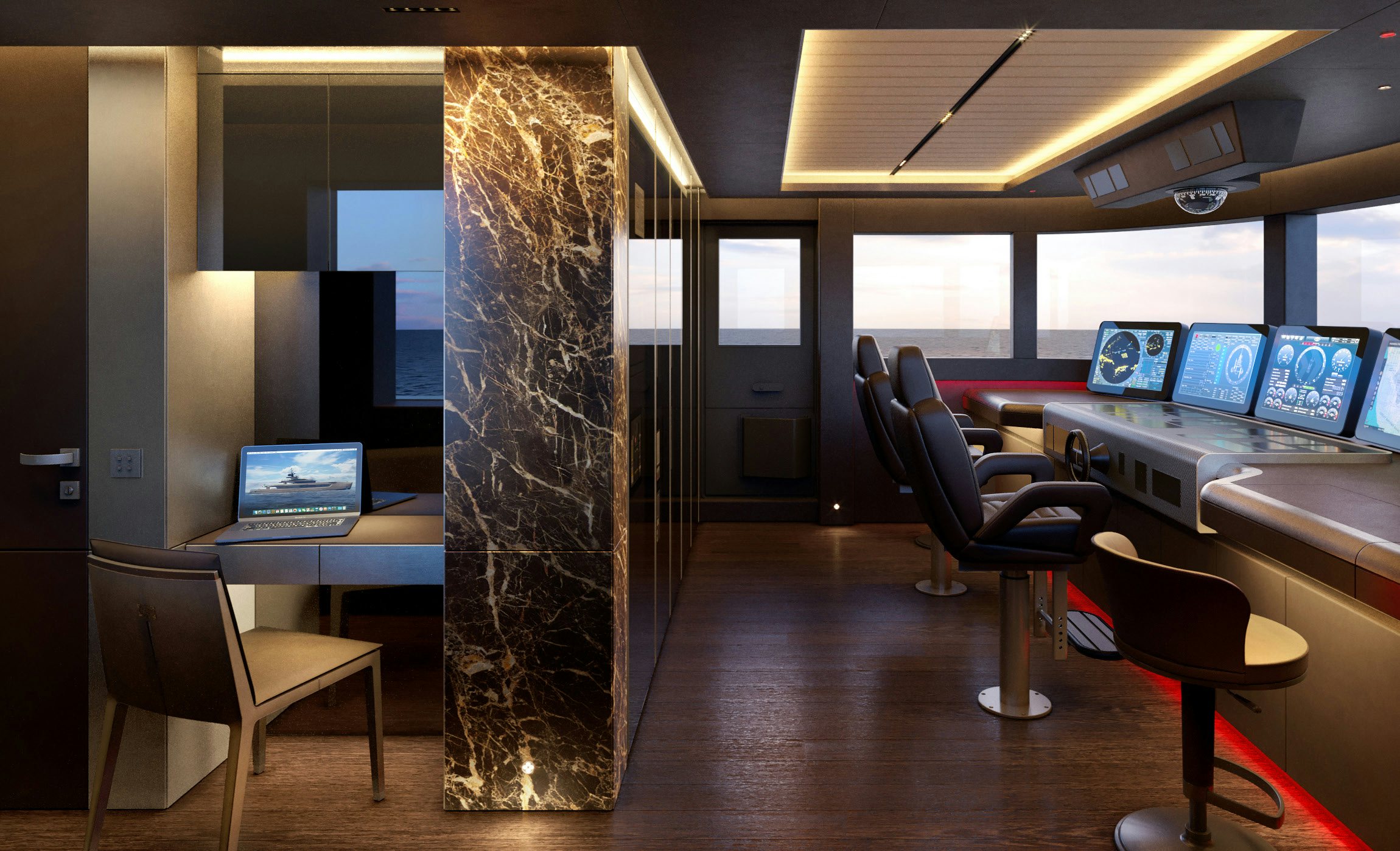 Accommodation is generous and refined. The owner’s suite and private office occupy the forward main deck, enjoying expansive views and privacy. Below, the guest quarters include a VIP cabin and four additional guest staterooms, allowing for 12 guests across six cabins, all serviced by a crew of 11. Natural light, neutral tones, and refined textures continue throughout the accommodation spaces, enhancing the yacht’s home-away-from-home appeal.