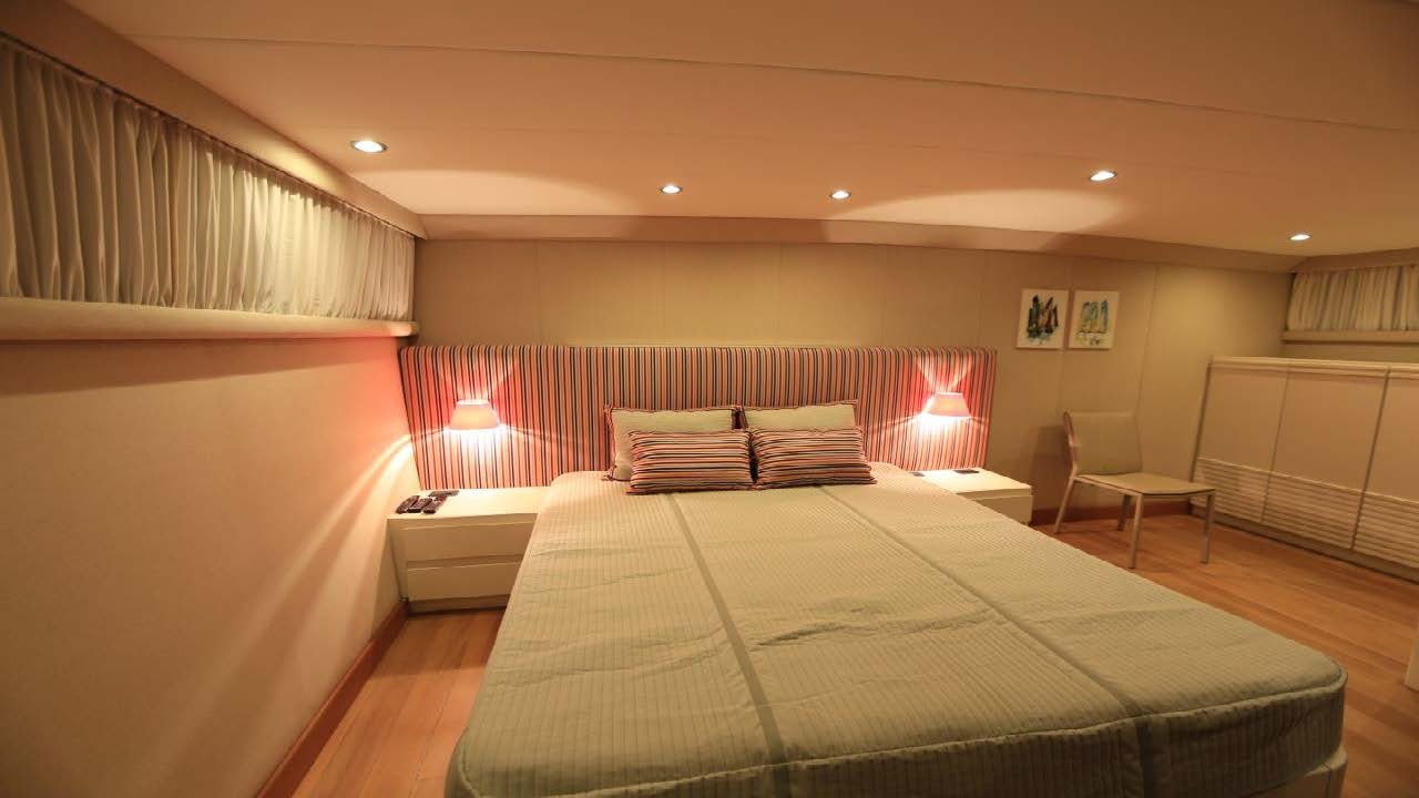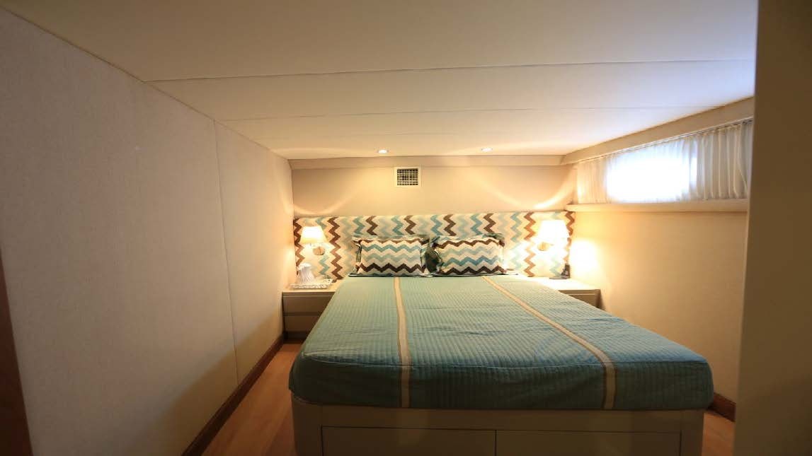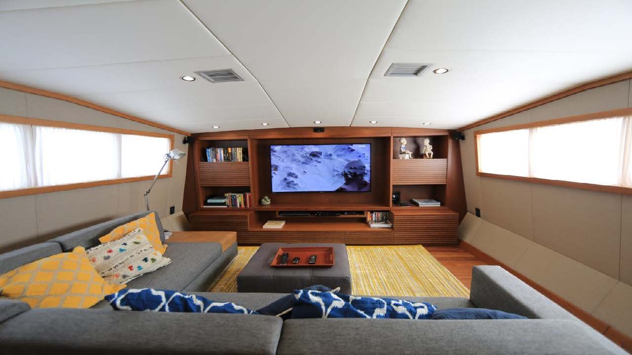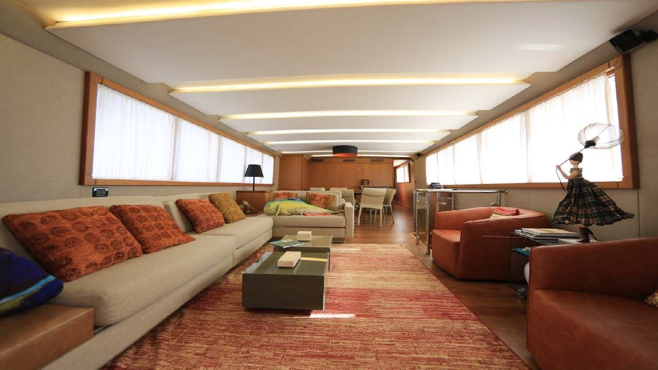 Underneath its elegant facade lies powerful machinery composed of two MAN V8 engines each producing up to 1000 horsepower (745 kW). To ensure smooth sailing even in choppy waters, Zero Speed stabilizers are installed adding stability during navigation or when anchored at bay. A high-capacity fuel tank holding approximately 5284 gallons ensures long-range voyages while its fresh water capacity reaching nearly 3963 gallons guarantees ample supply for all onboard needs including air conditioning system which boasts water chilled feature producing up-to-120000 BTU coupled with twelve fan coils distributed strategically across the vessel ensuring optimal cooling effect throughout.