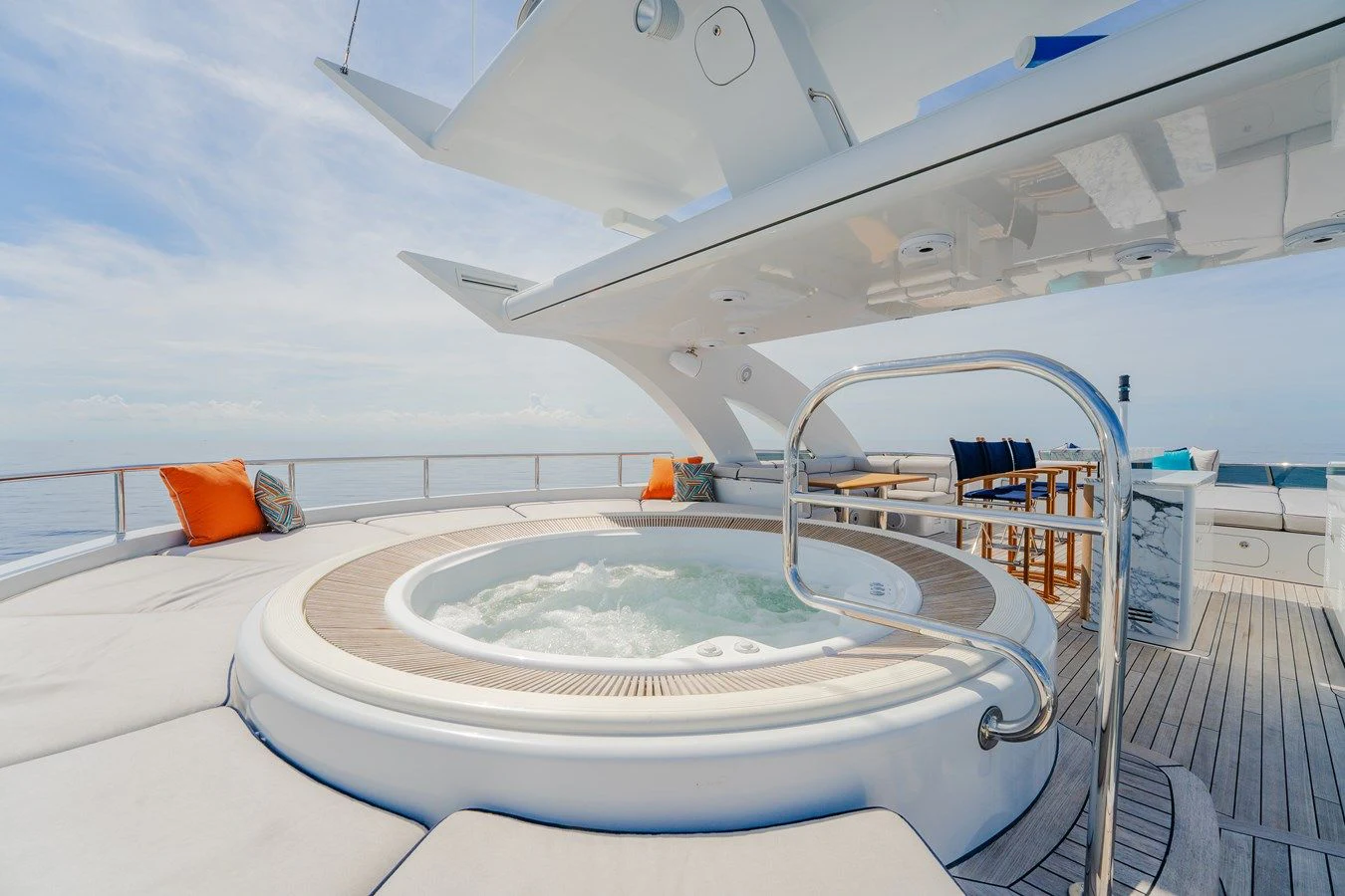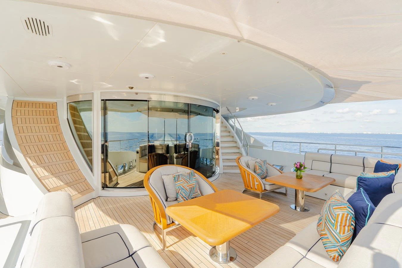 The exterior design of CASTLEFINN is nothing short of breathtaking. Her sleek silhouette evokes an air of elegance while her expansive beam measuring 28 feet (8.53 meters) provides ample space for outdoor relaxation and entertainment. The sundeck is a haven for sun-worshippers with its plush loungers, while alfresco dining areas beckon guests to savor gourmet meals under the stars. Notable exterior features include state-of-the-art stabilizers for smooth sailing and a powerful bow thruster system that enhances maneuverability.