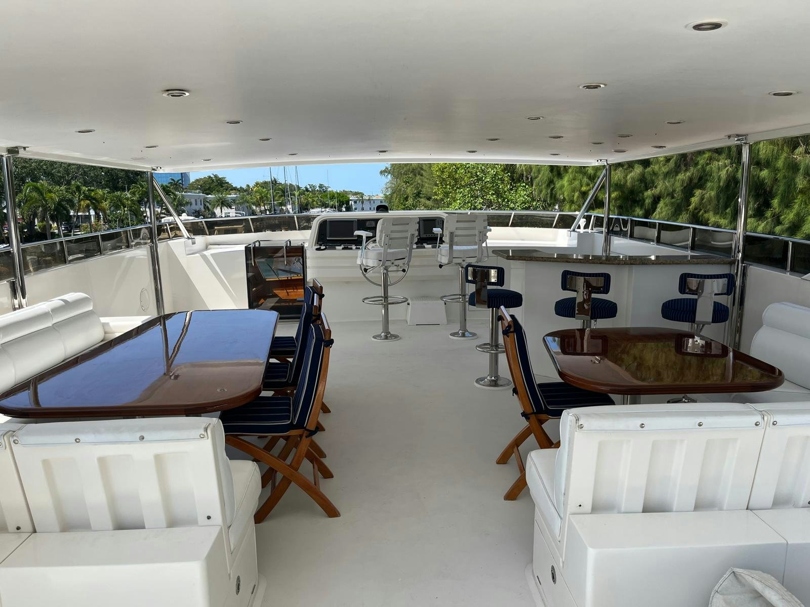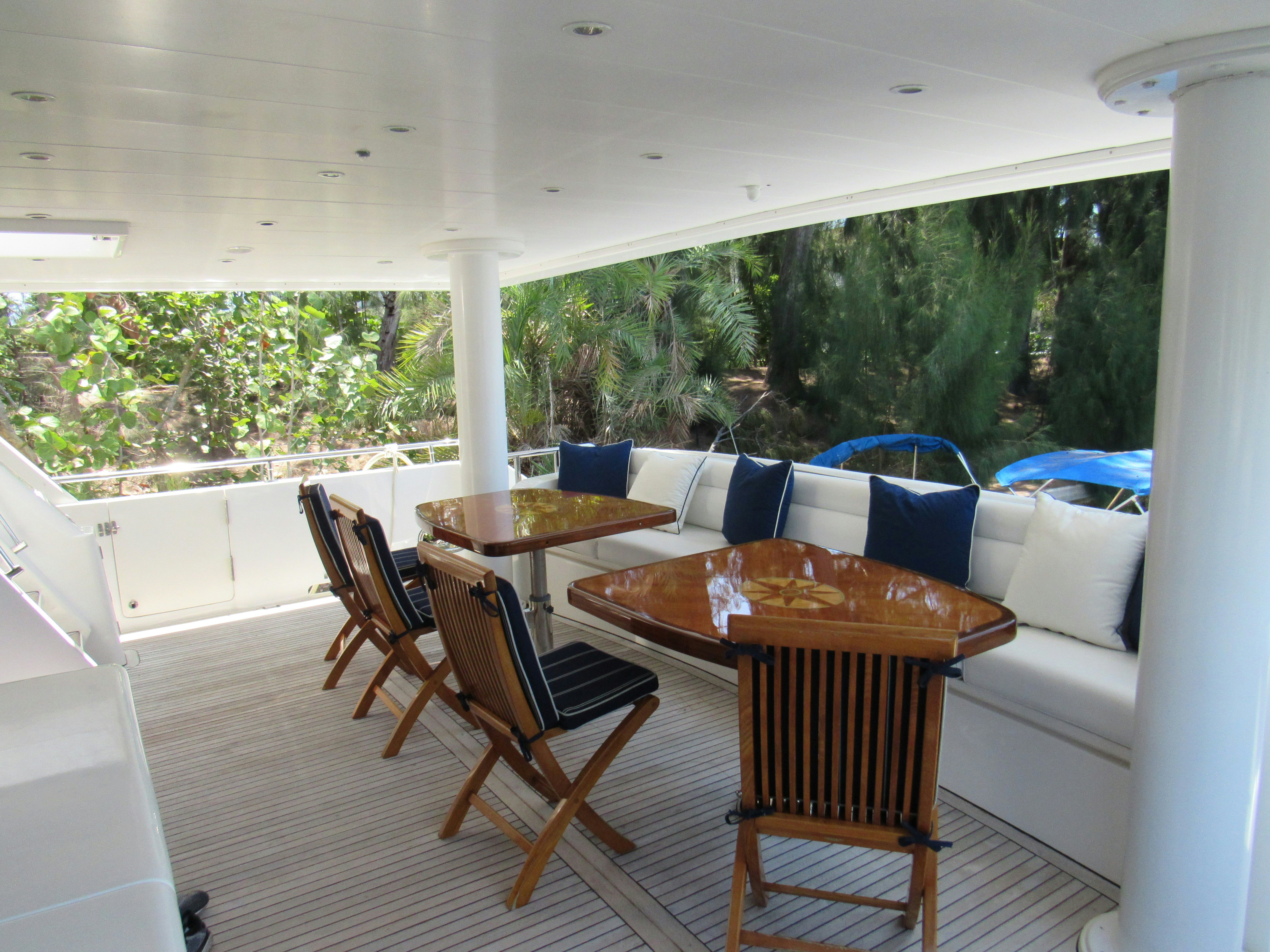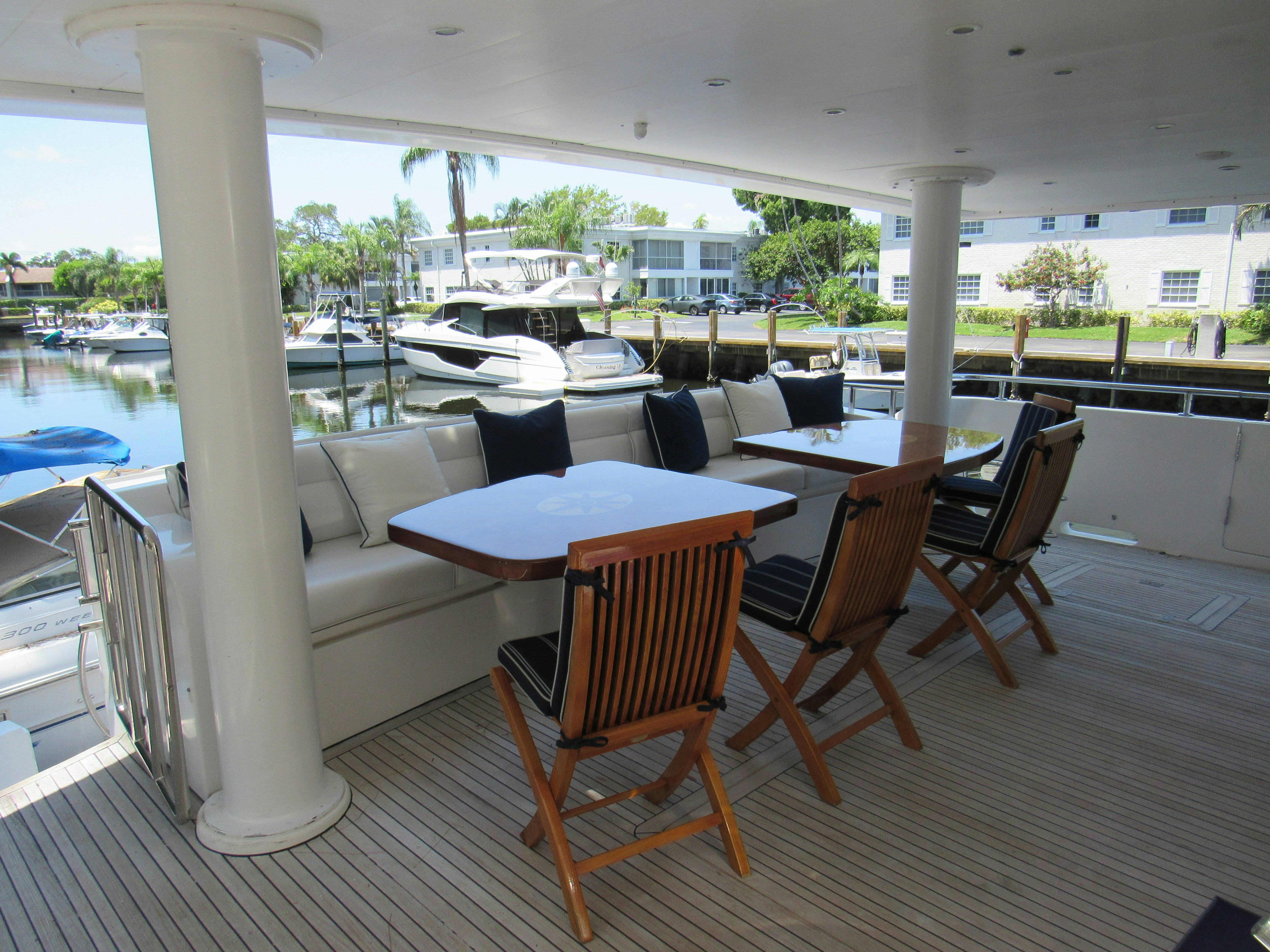 Outdoor living is a highlight aboard SANCTUARY. The aft deck offers an inviting space with seating for eight around twin teak tables inlaid with compass rose designs. The flybridge has been customized for entertaining, with a granite-topped three-seat bar, large teak table with a portside settee, a smaller lunch table to starboard, and a grilling station aft with gas grill and serving counter—ideal for hosting up to twelve for dinner. Forward, the foredeck features a comfortable sunpad for lounging. The large cockpit provides easy access to the water, perfect for active days aboard, and the boat deck with crane can accommodate a 16' tender.