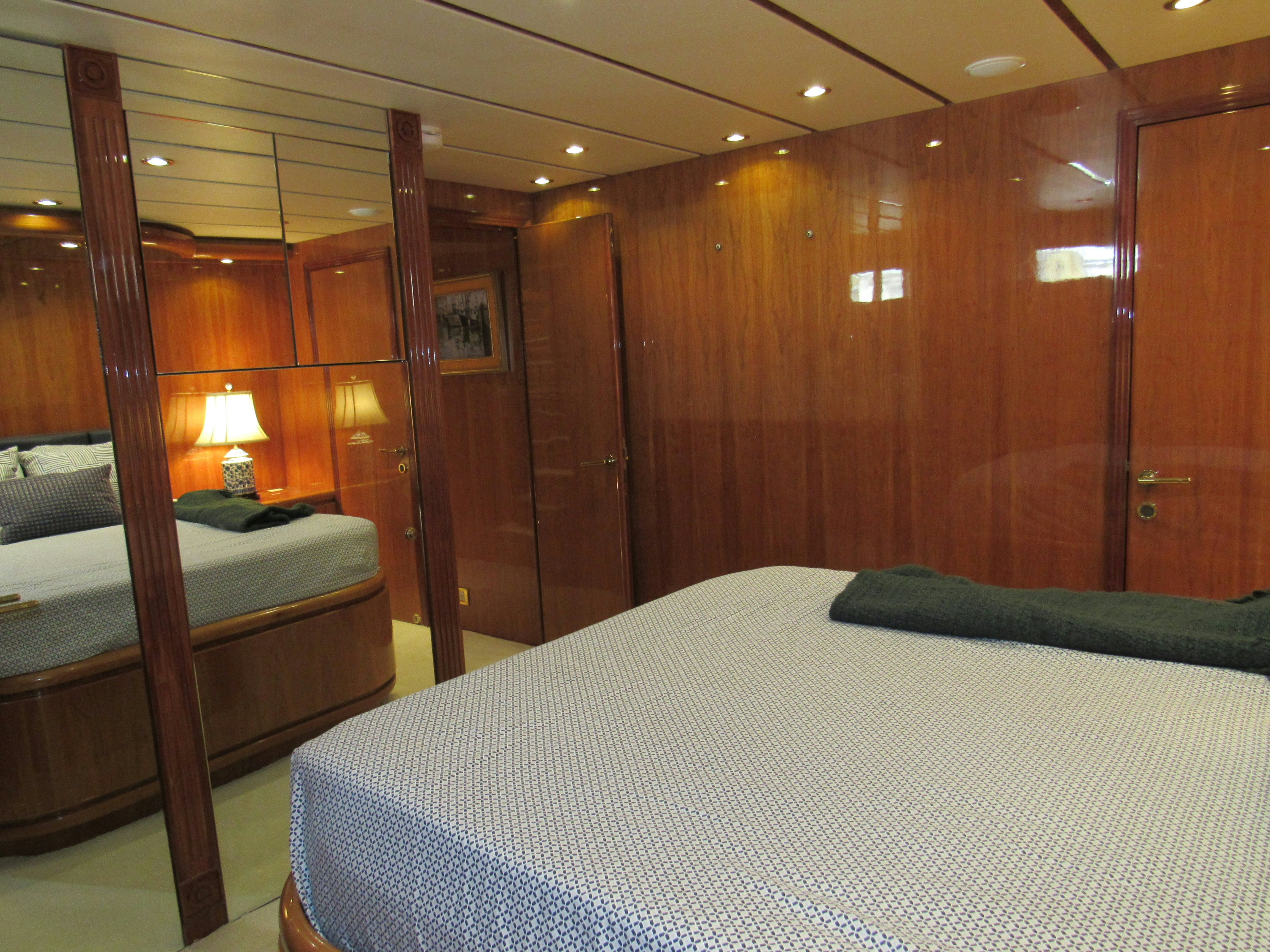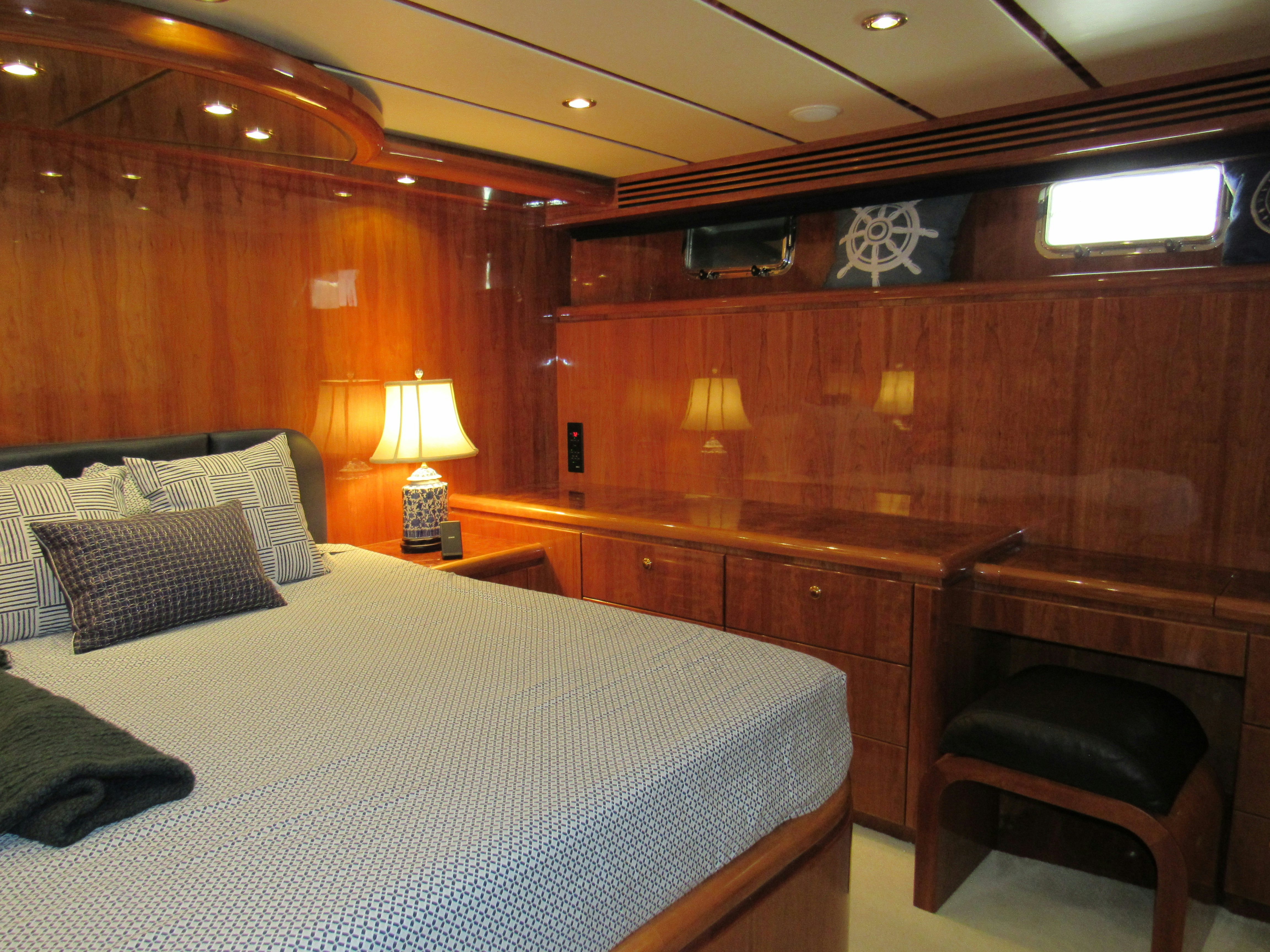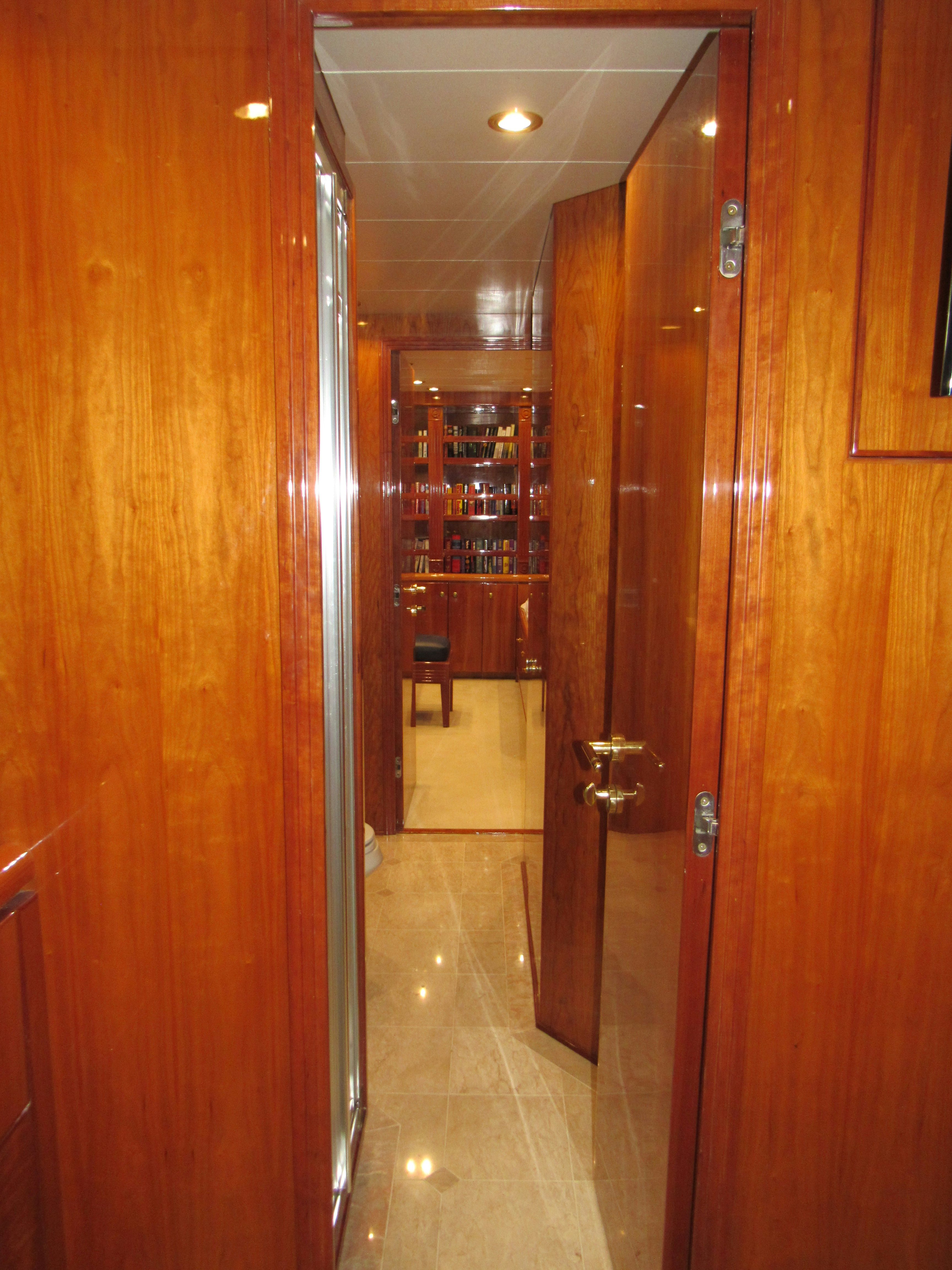 SANCTUARY sleeps eight guests in four well-appointed cabins. The full-beam owner’s stateroom is located amidships and features a king-size berth, walk-in cedar closet, marble bathroom with dual sinks, Jacuzzi tub, a small leather settee to starboard, and a built-in bureau with vanity table to port. The VIP cabin offers a queen berth, generous storage, and a private head. The twin guest cabin includes twin berths and an ensuite, while the fourth guest stateroom functions as a library/office with bookshelves, a desk, single berth, and a pullman. This ensuite also serves as a dayhead accessible to the owner’s suite.