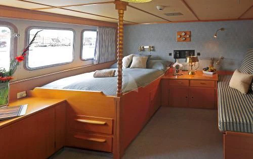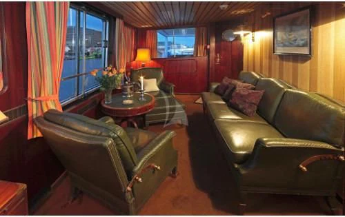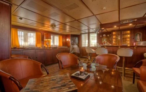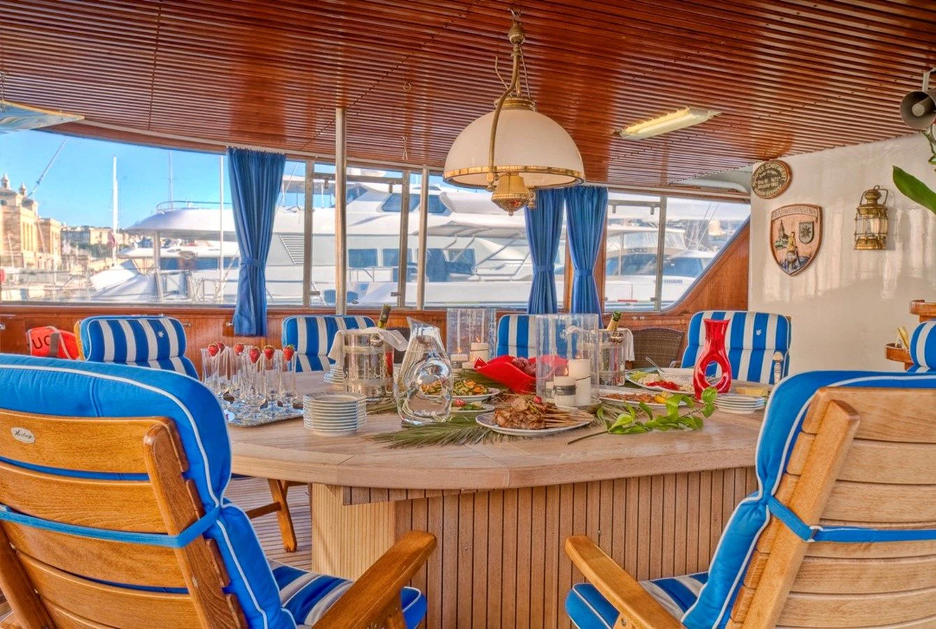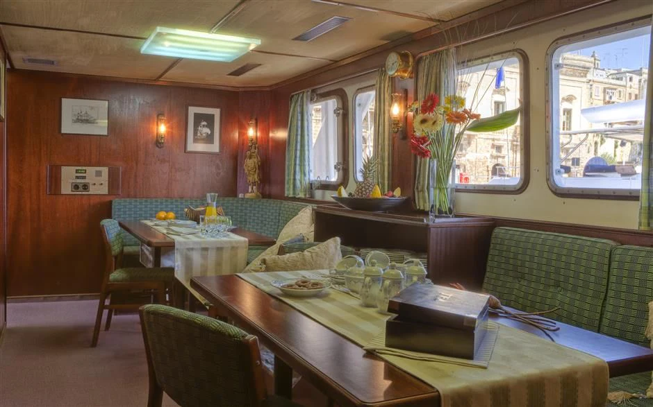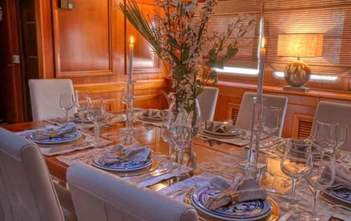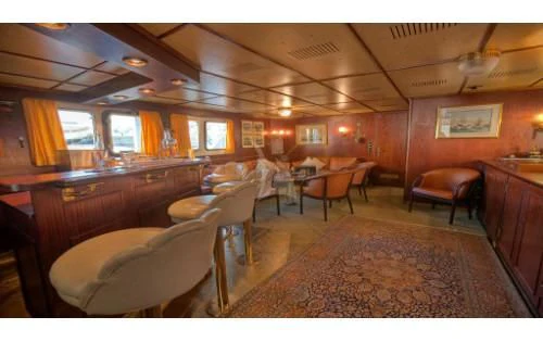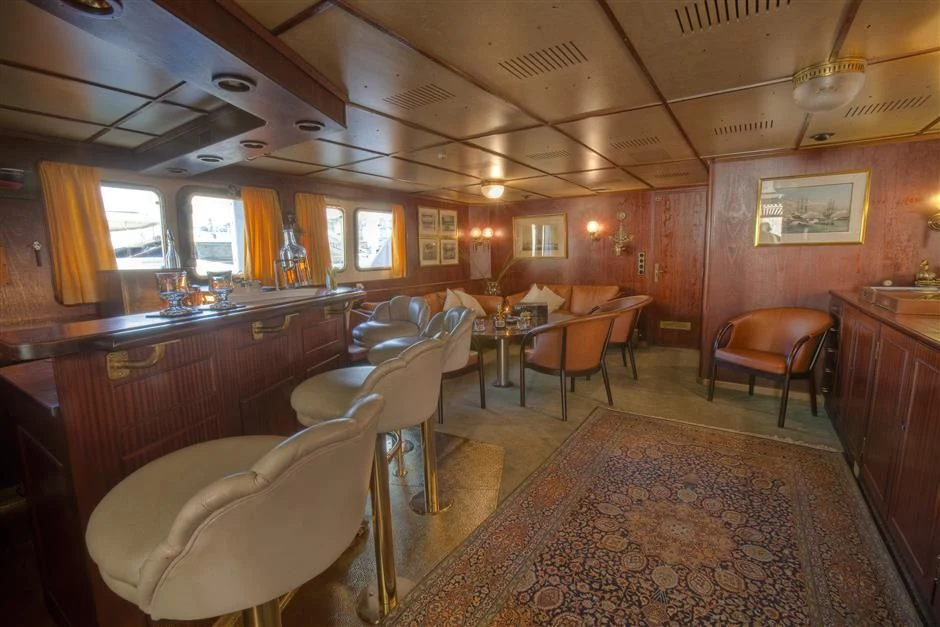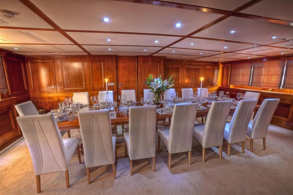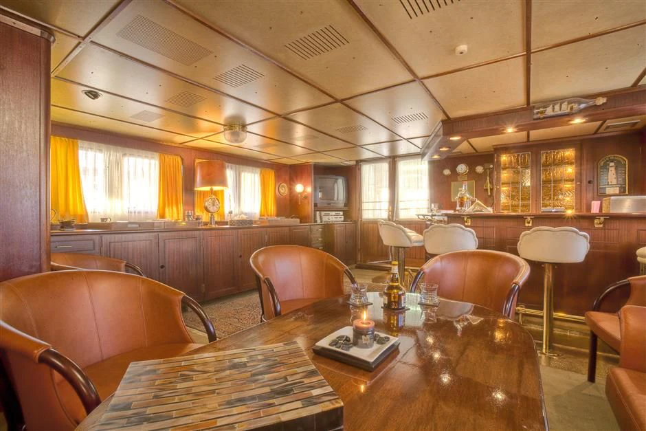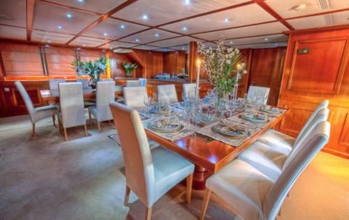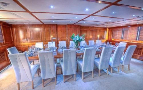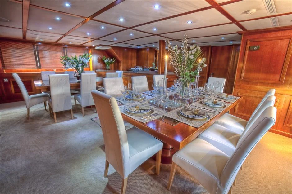 The interior exudes a timeless and classic style, with a spacious saloon on the main deck featuring an English-style bar and a dining room equipped with two large tables accommodating up to 18 guests.