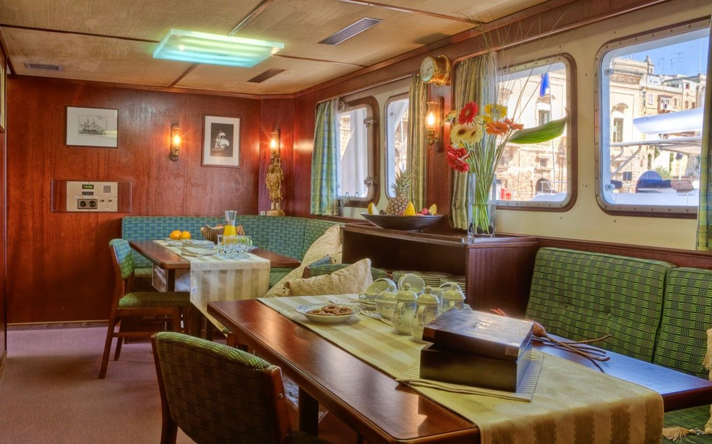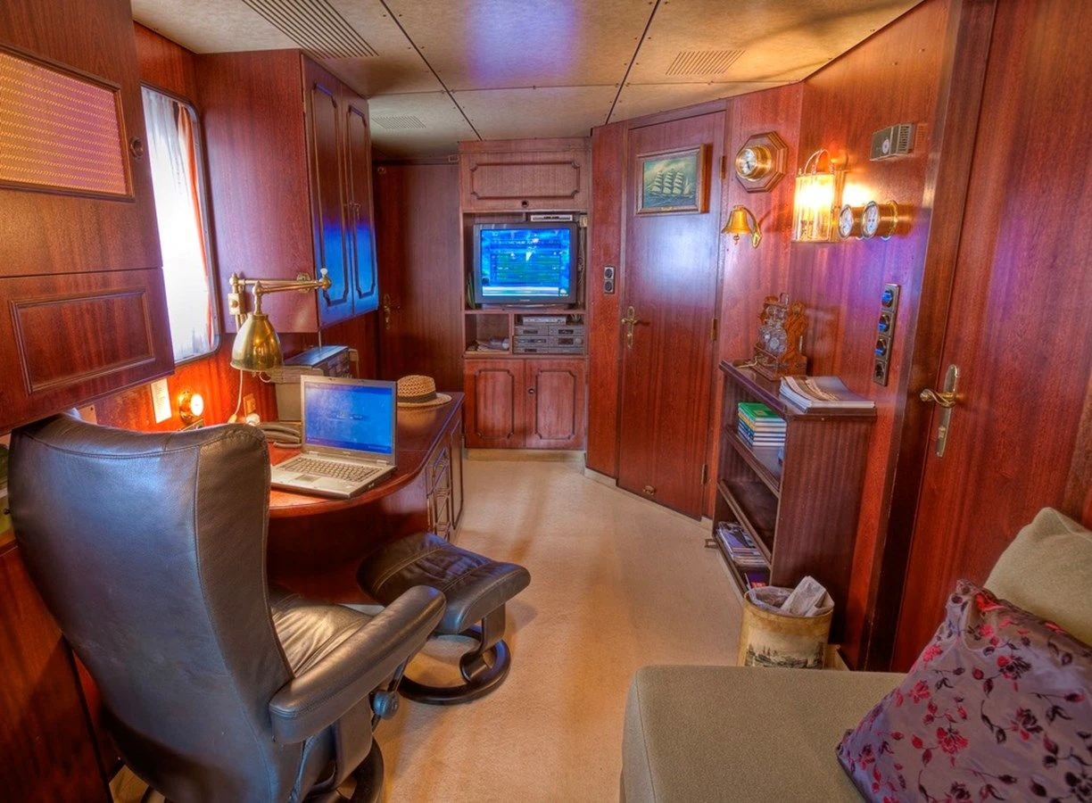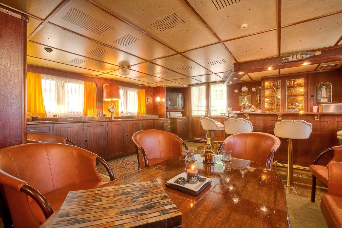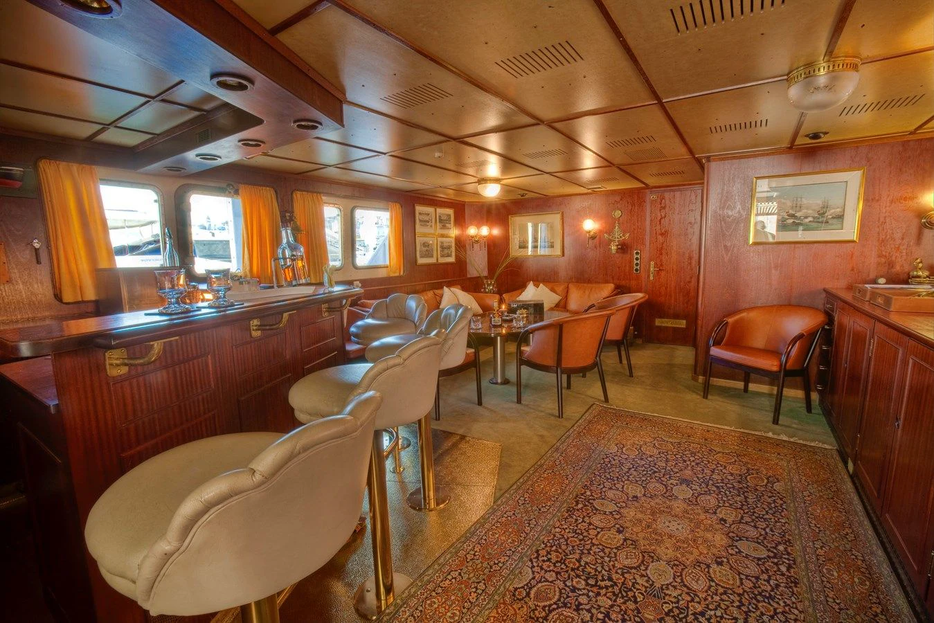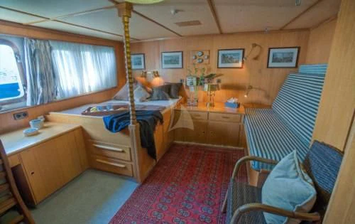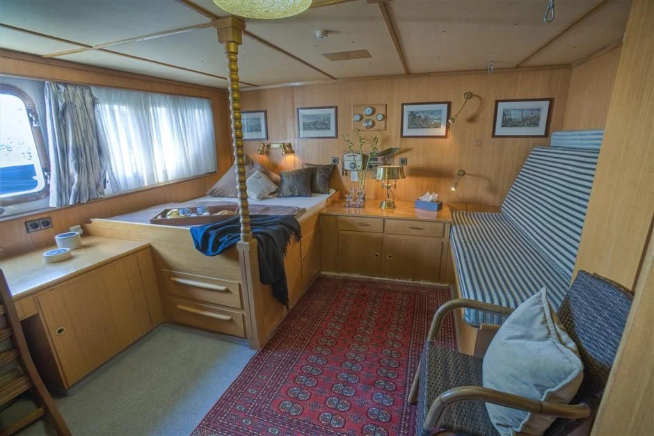 The interior exudes a timeless and classic style, with a spacious saloon on the main deck featuring an English-style bar and a dining room equipped with two large tables accommodating up to 18 guests.