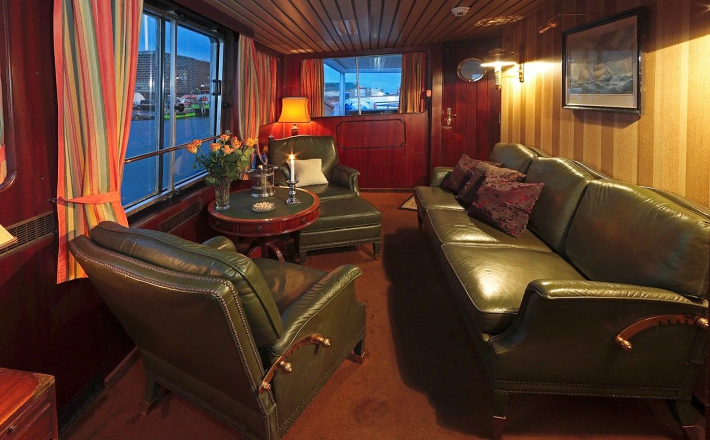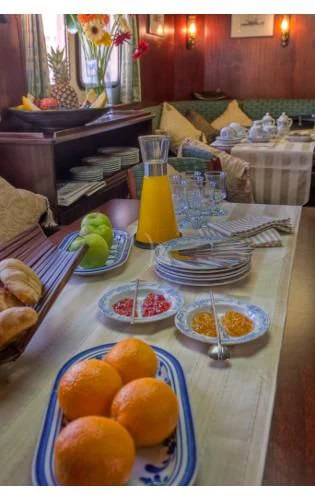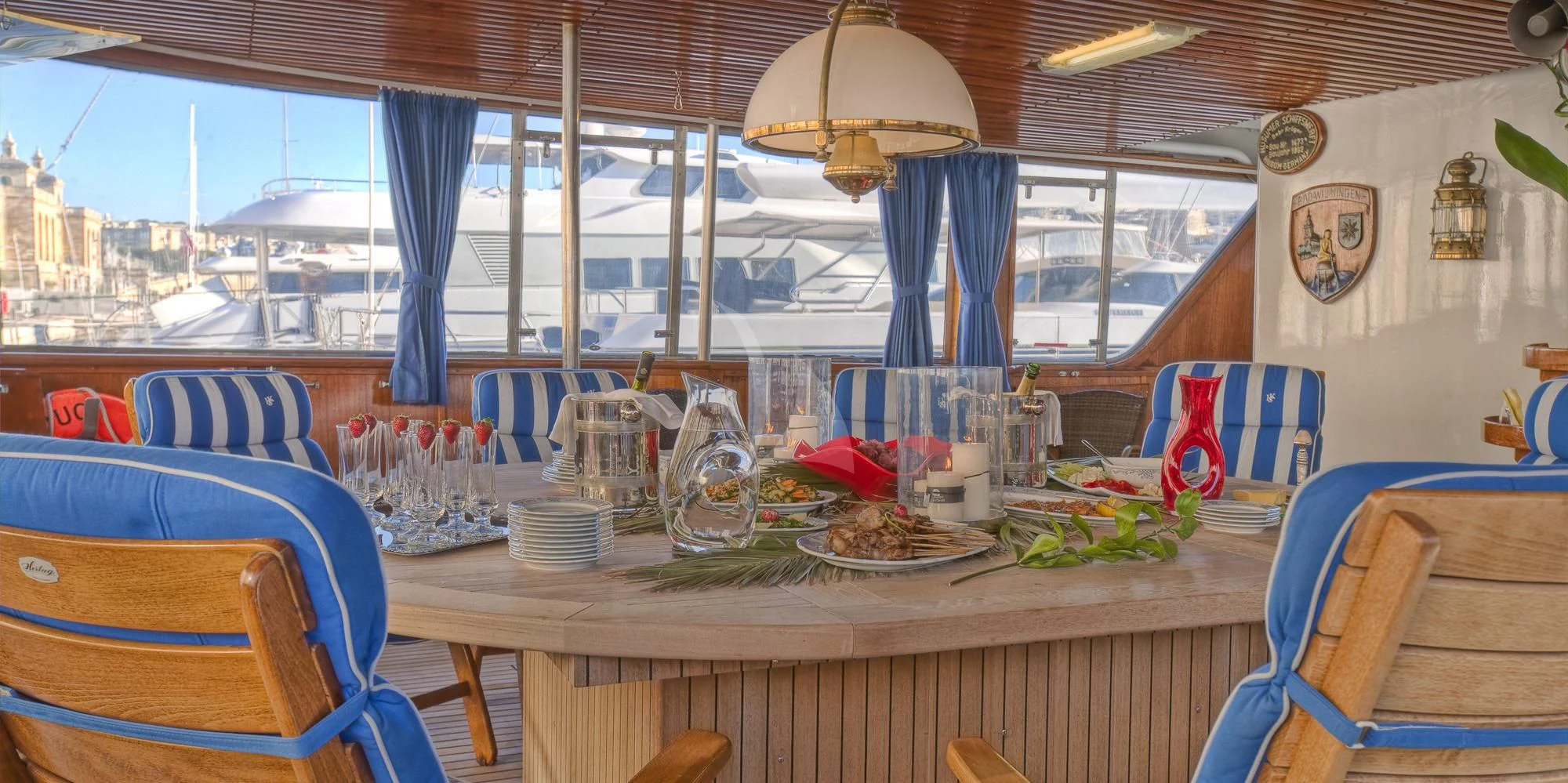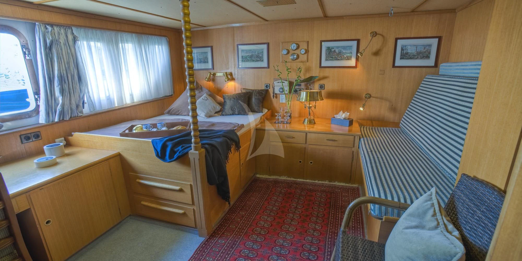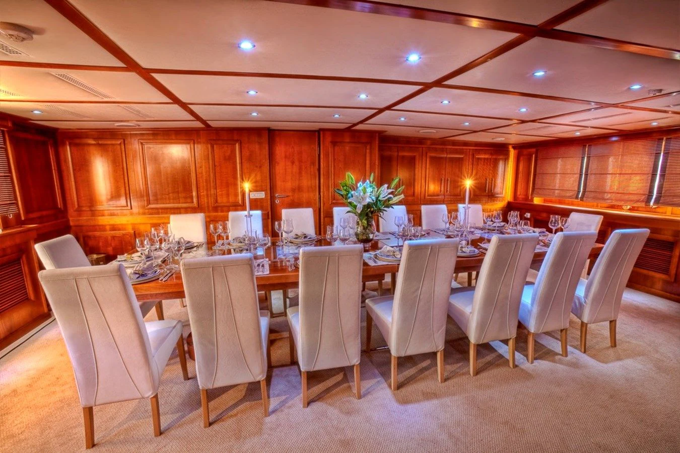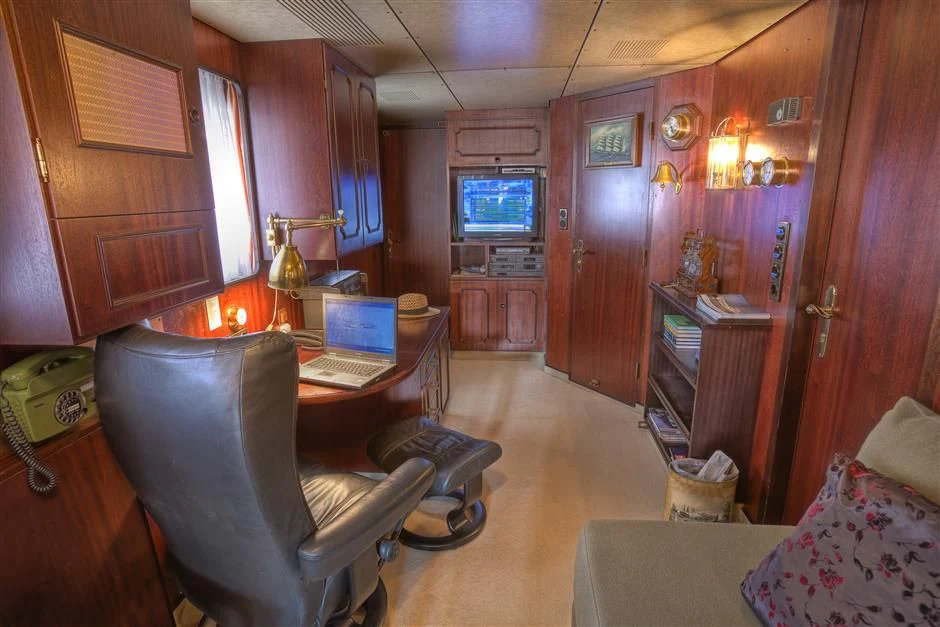 The interior exudes a timeless and classic style, with a spacious saloon on the main deck featuring an English-style bar and a dining room equipped with two large tables accommodating up to 18 guests.