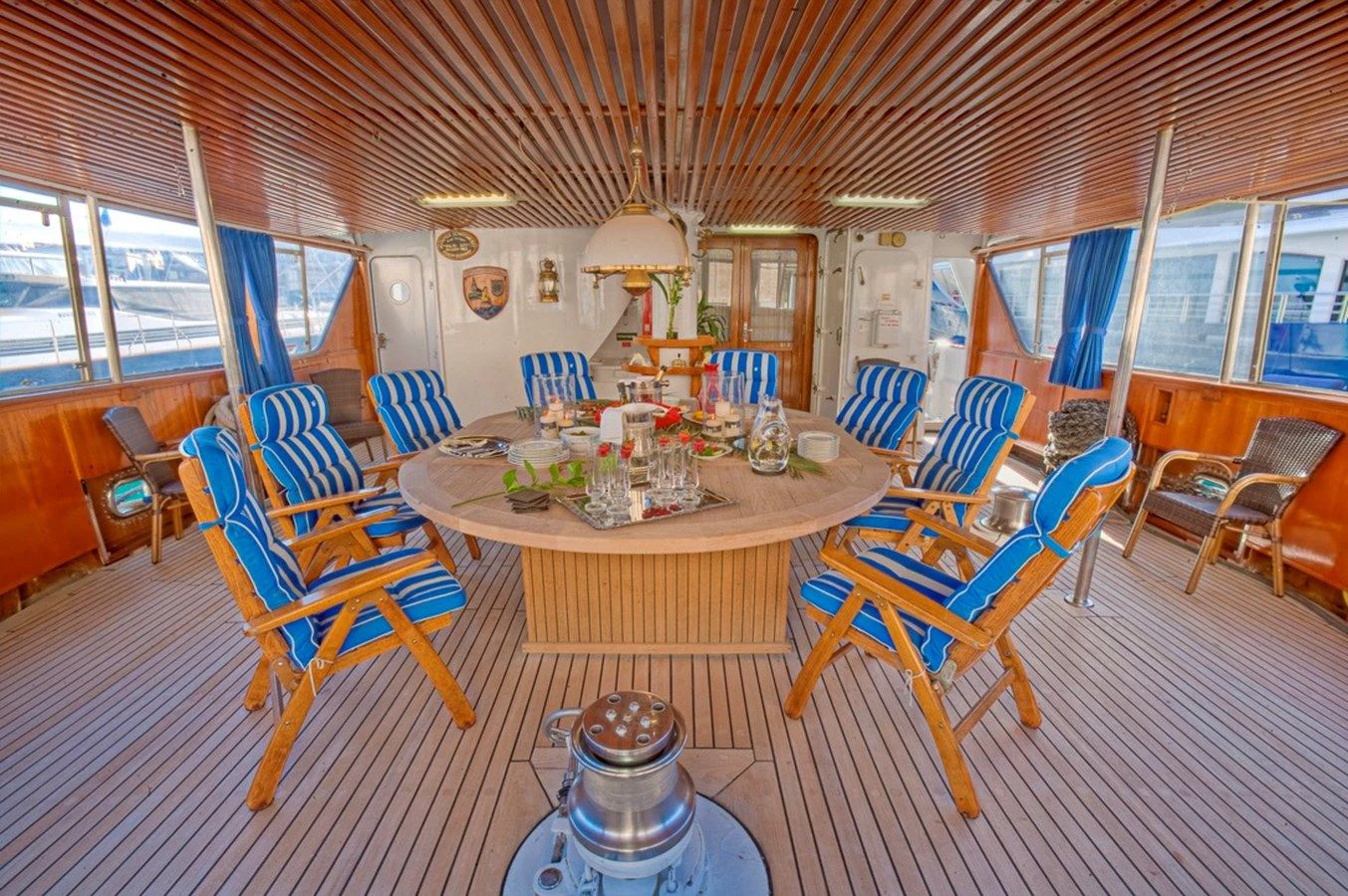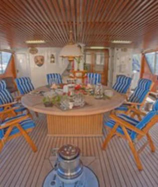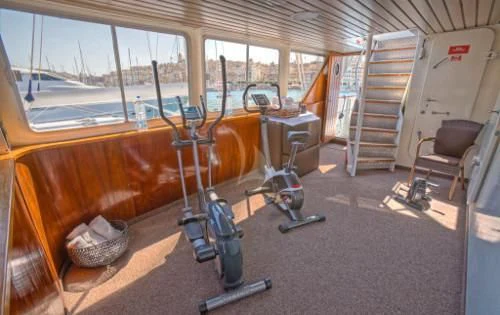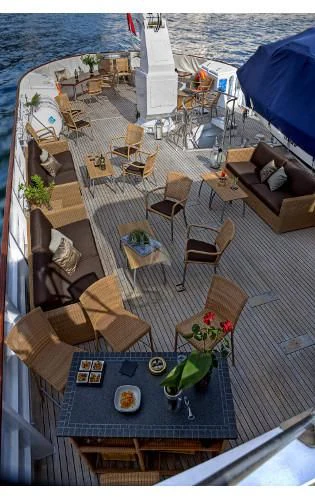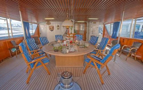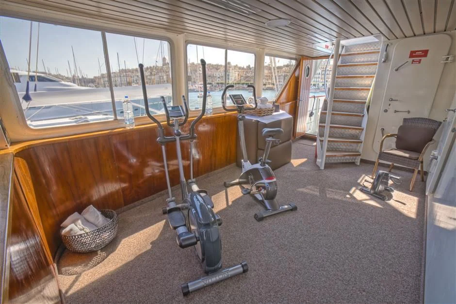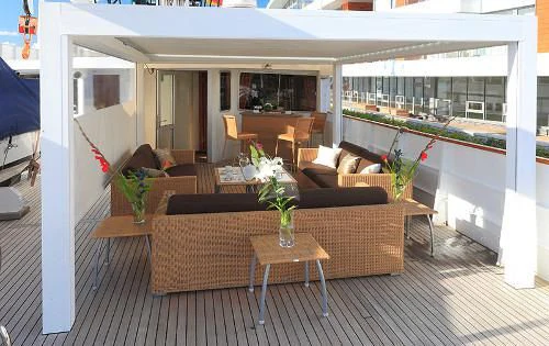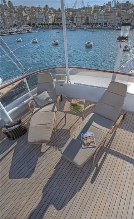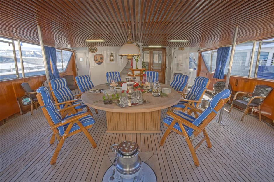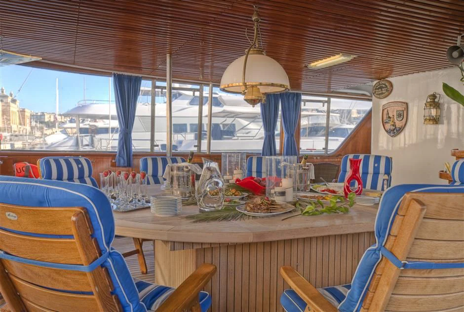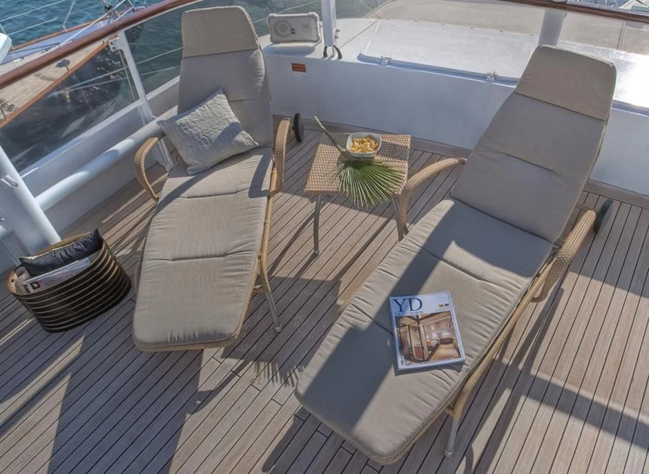 Outside, ample space awaits for entertainment and relaxation. The upper bridge deck features a covered gym area and an open seating area, while further aft offers storage for the main tender and a hydraulic crane. On the main deck aft, a private and enclosed seating area with a large circular teak table provides a perfect setting for intimate gatherings, accommodating up to 10 guests.