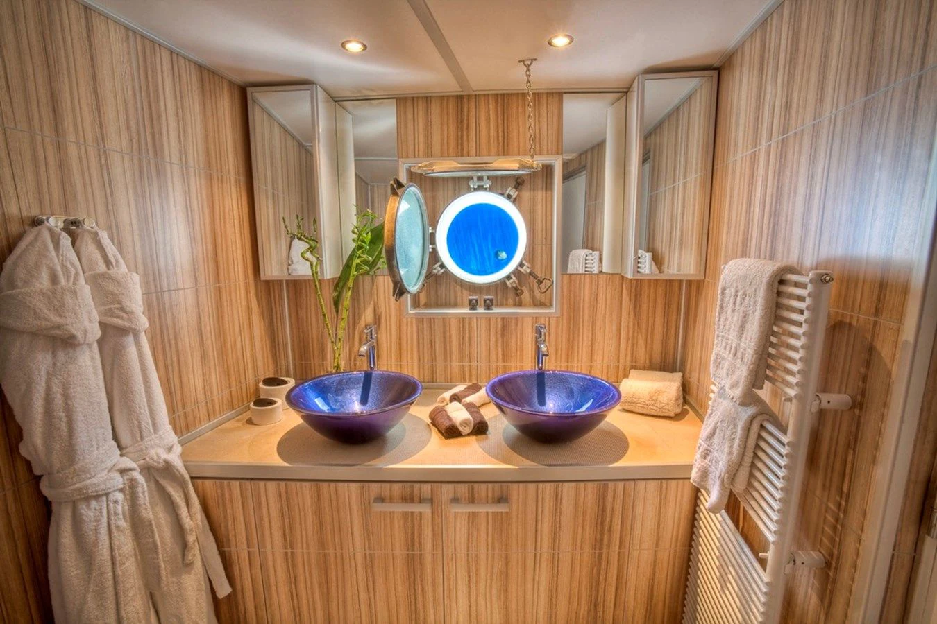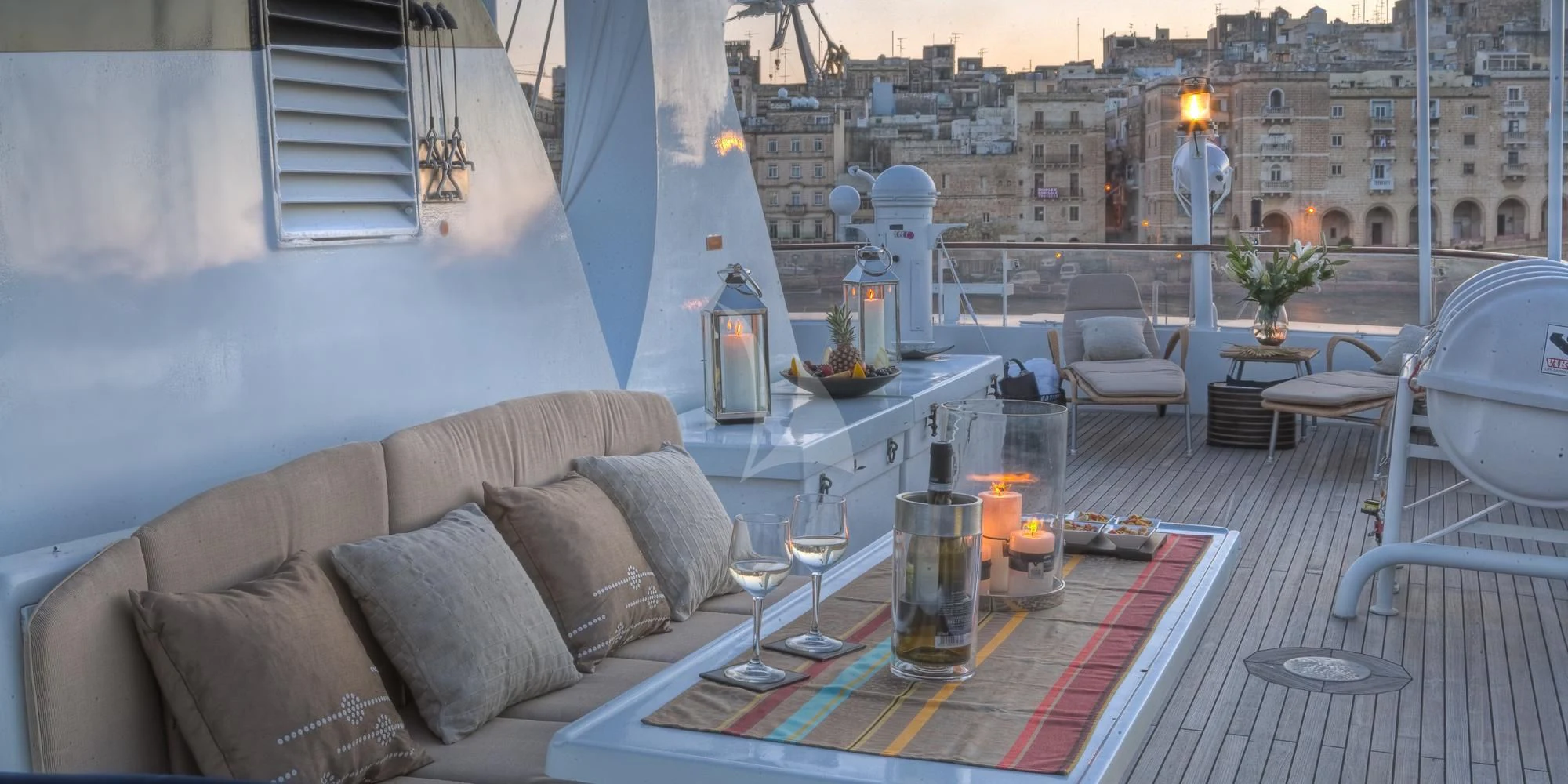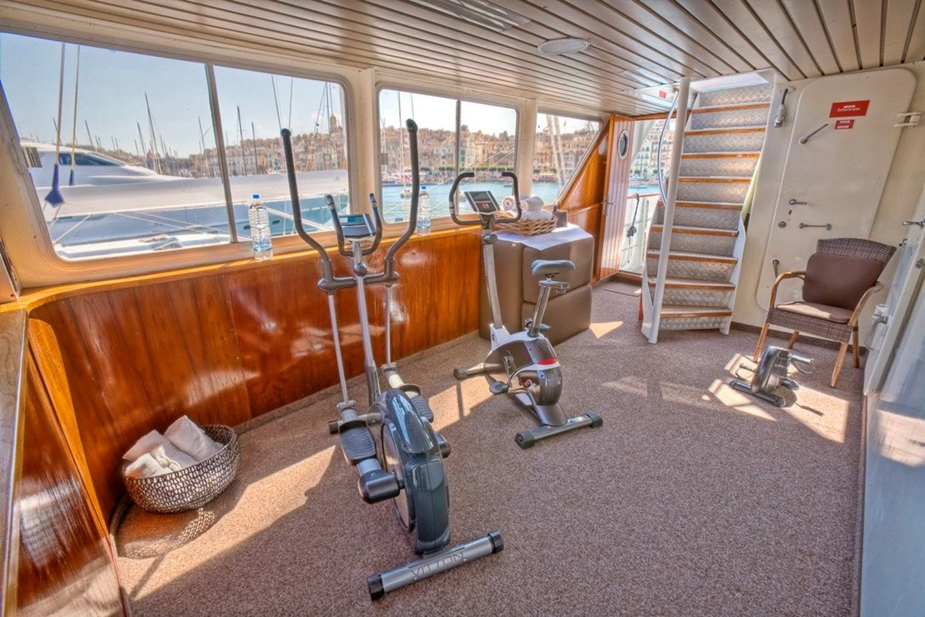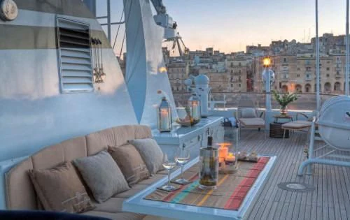 Outside, ample space awaits for entertainment and relaxation. The upper bridge deck features a covered gym area and an open seating area, while further aft offers storage for the main tender and a hydraulic crane. On the main deck aft, a private and enclosed seating area with a large circular teak table provides a perfect setting for intimate gatherings, accommodating up to 10 guests.