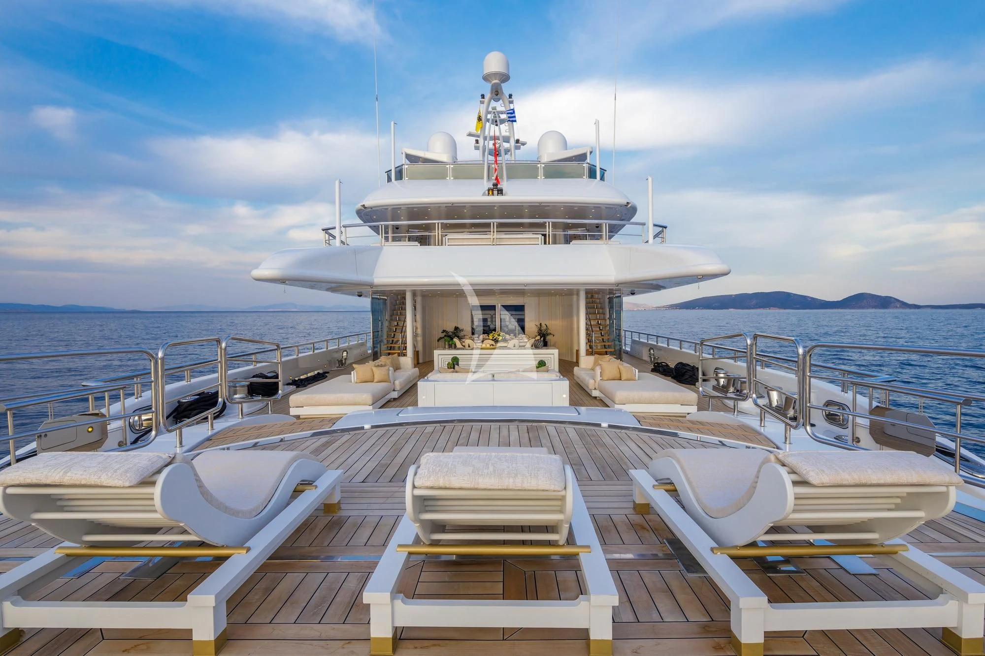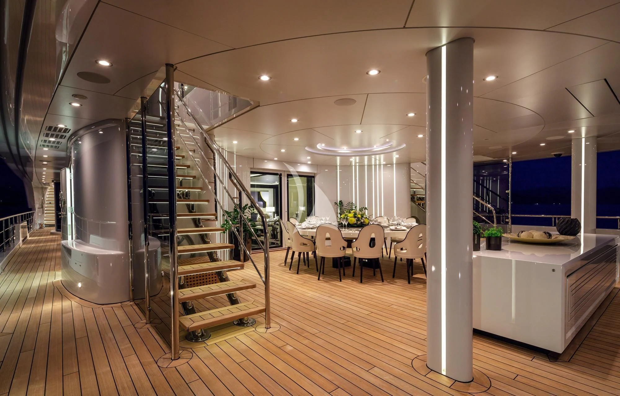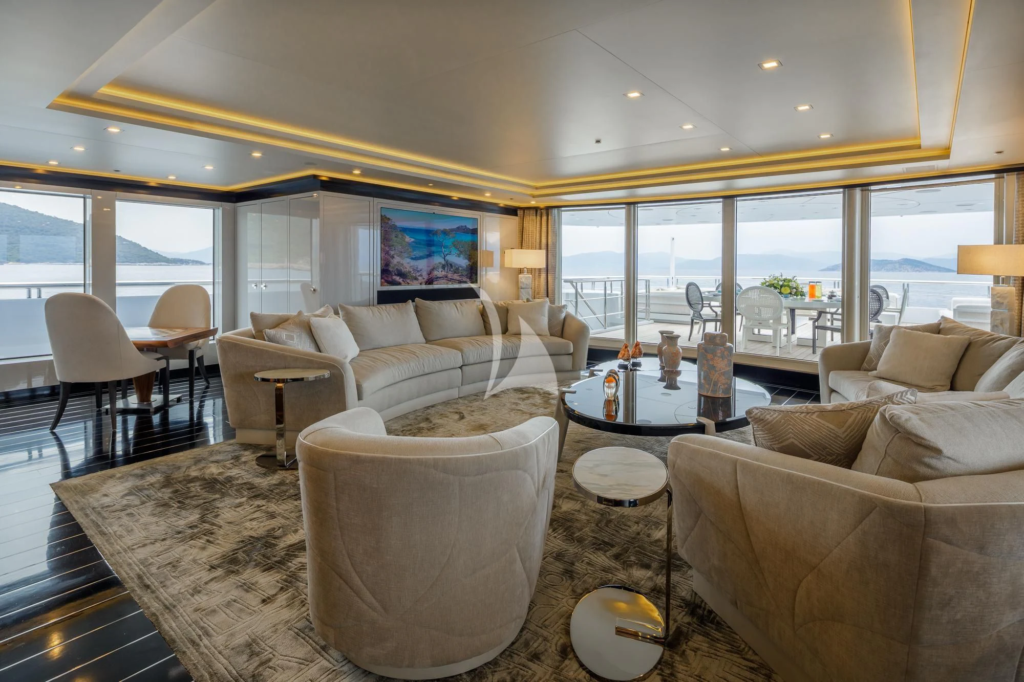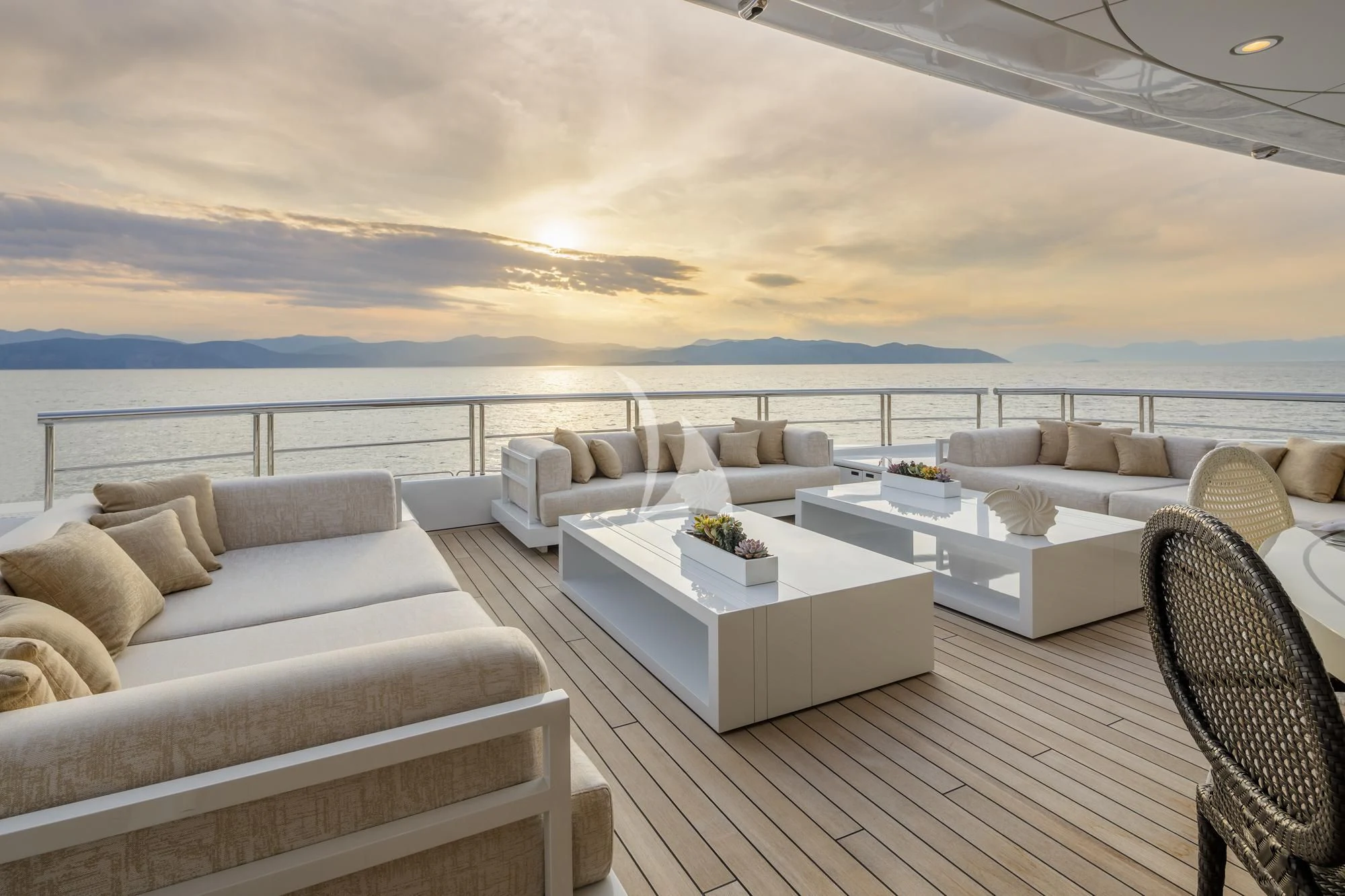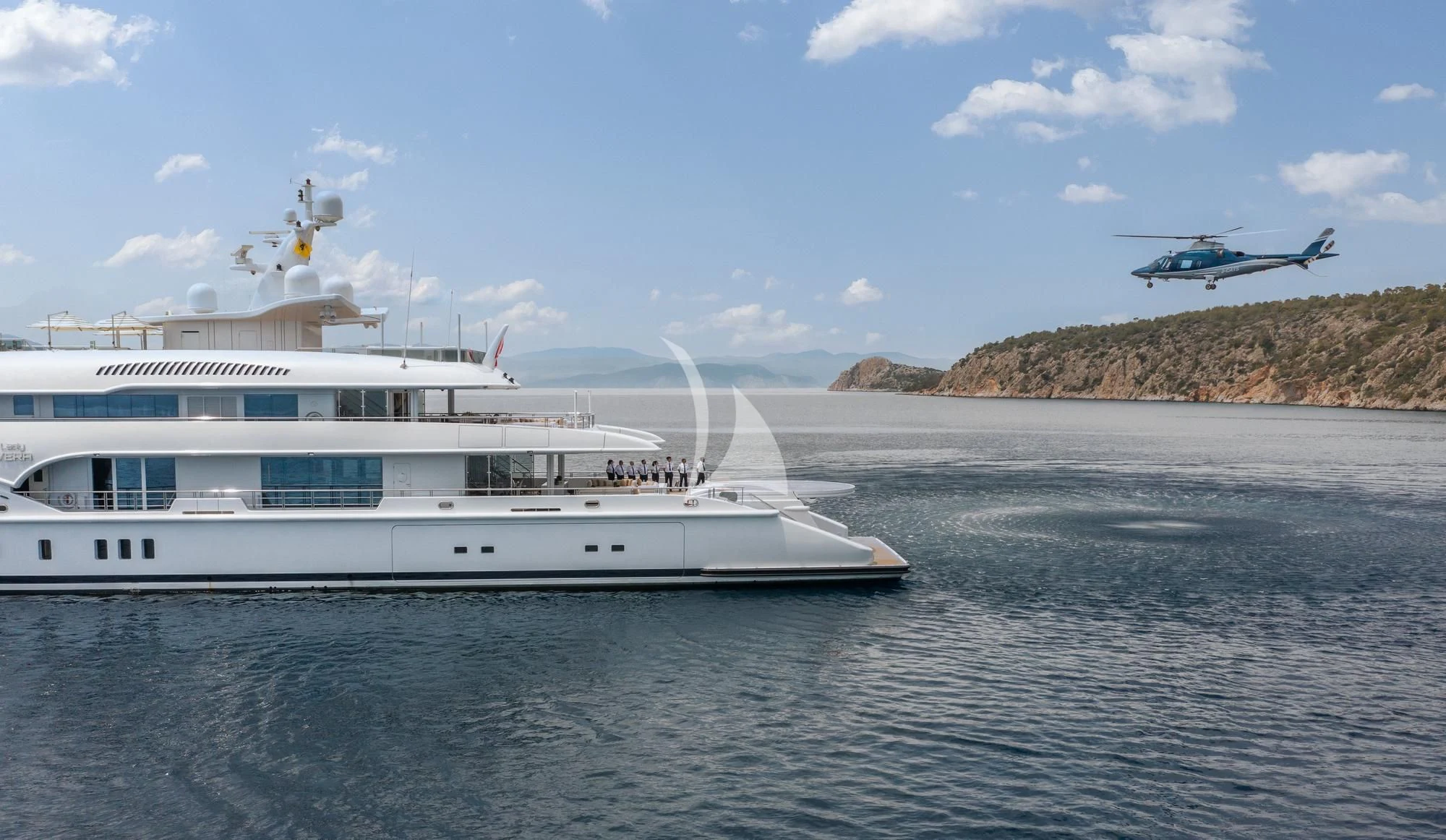 The exterior design of LADY VERA is as captivating as it is elegant. Her steel hull cuts through the waves with grace and precision, while her expansive beam of 39 feet (12.6 meters) provides ample space for onboard amenities and leisure areas. The sundeck invites guests to bask under the sun or enjoy alfresco dining with stunning panoramic views. The yacht's standout feature is undoubtedly its helipad, allowing for seamless access from air to sea, demonstrating that no aspect of luxury has been overlooked.