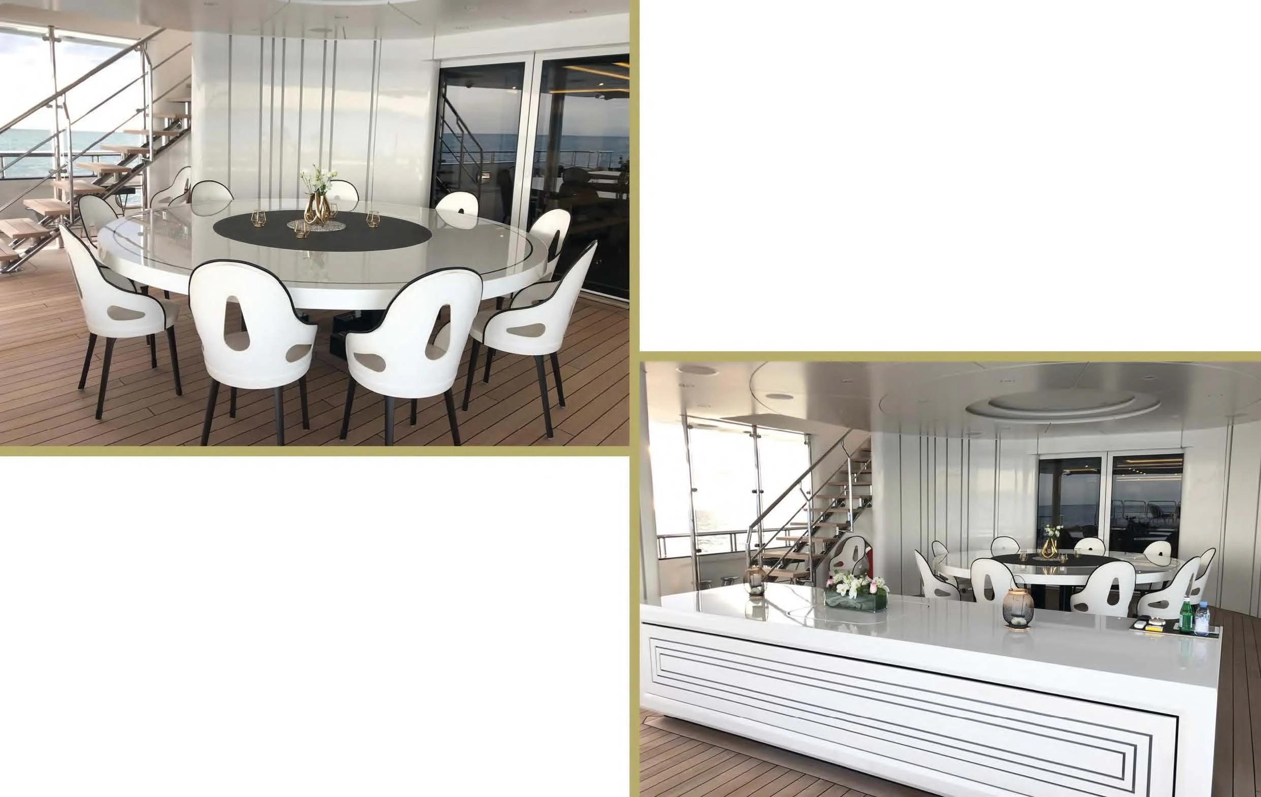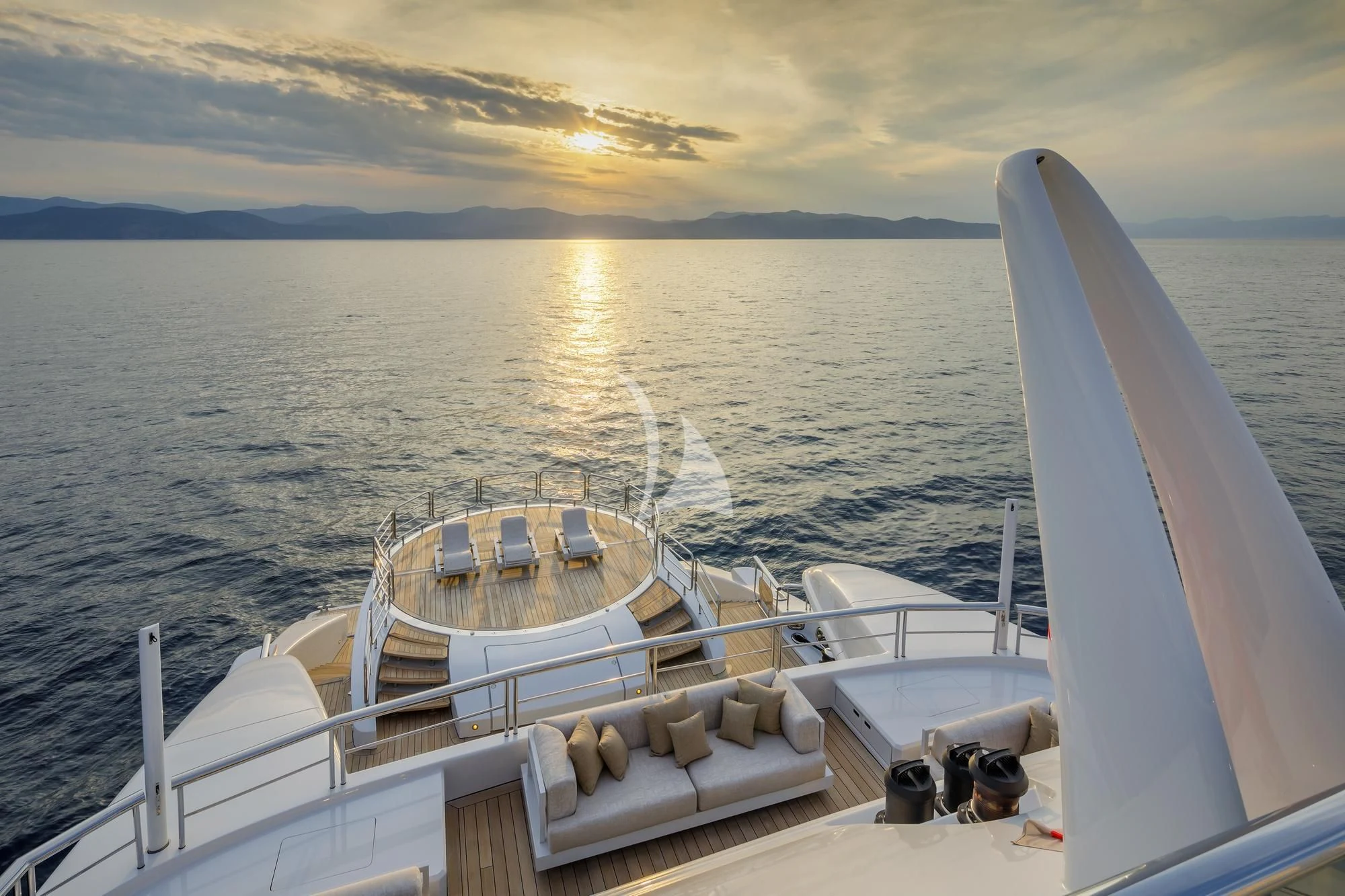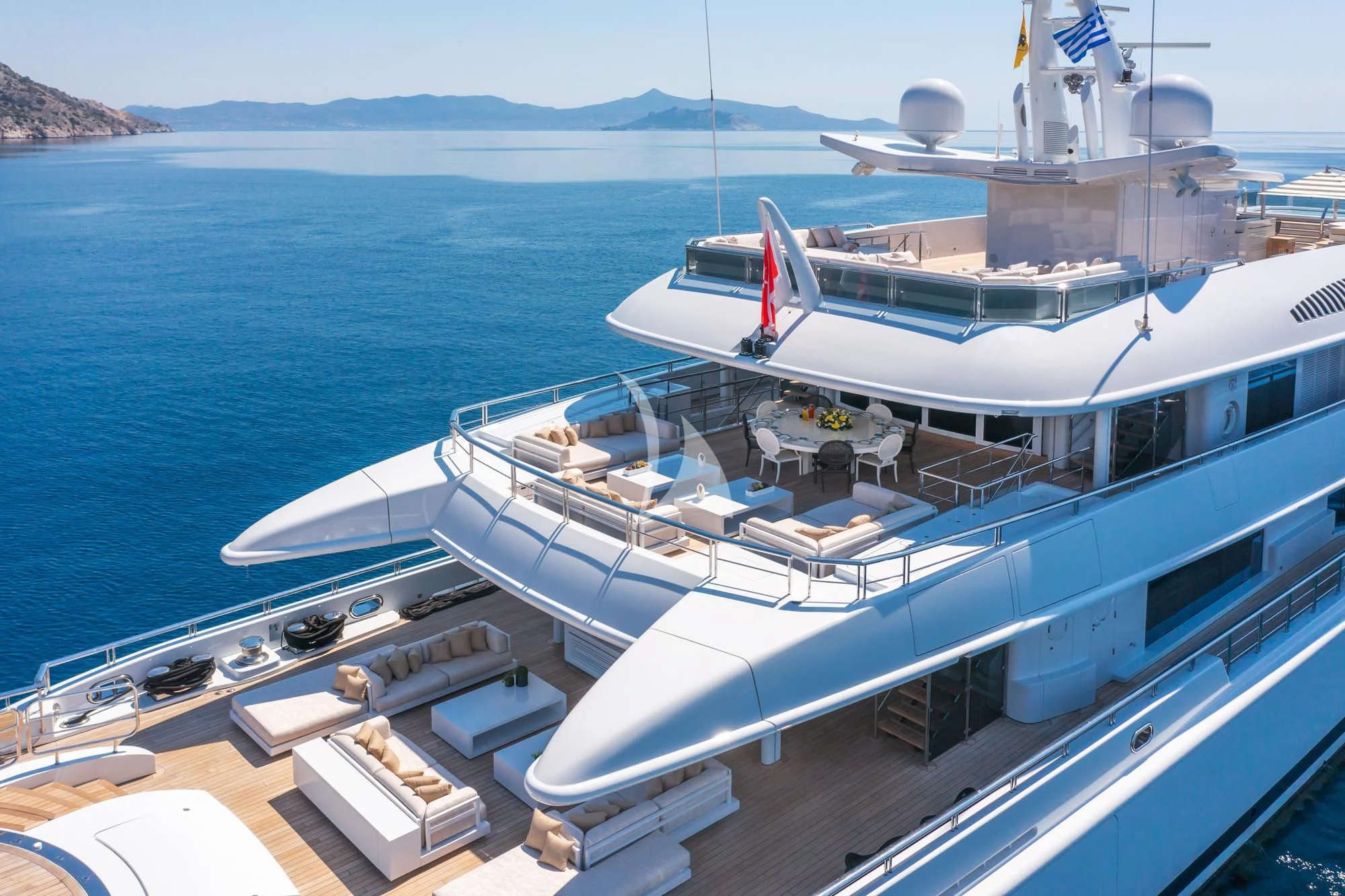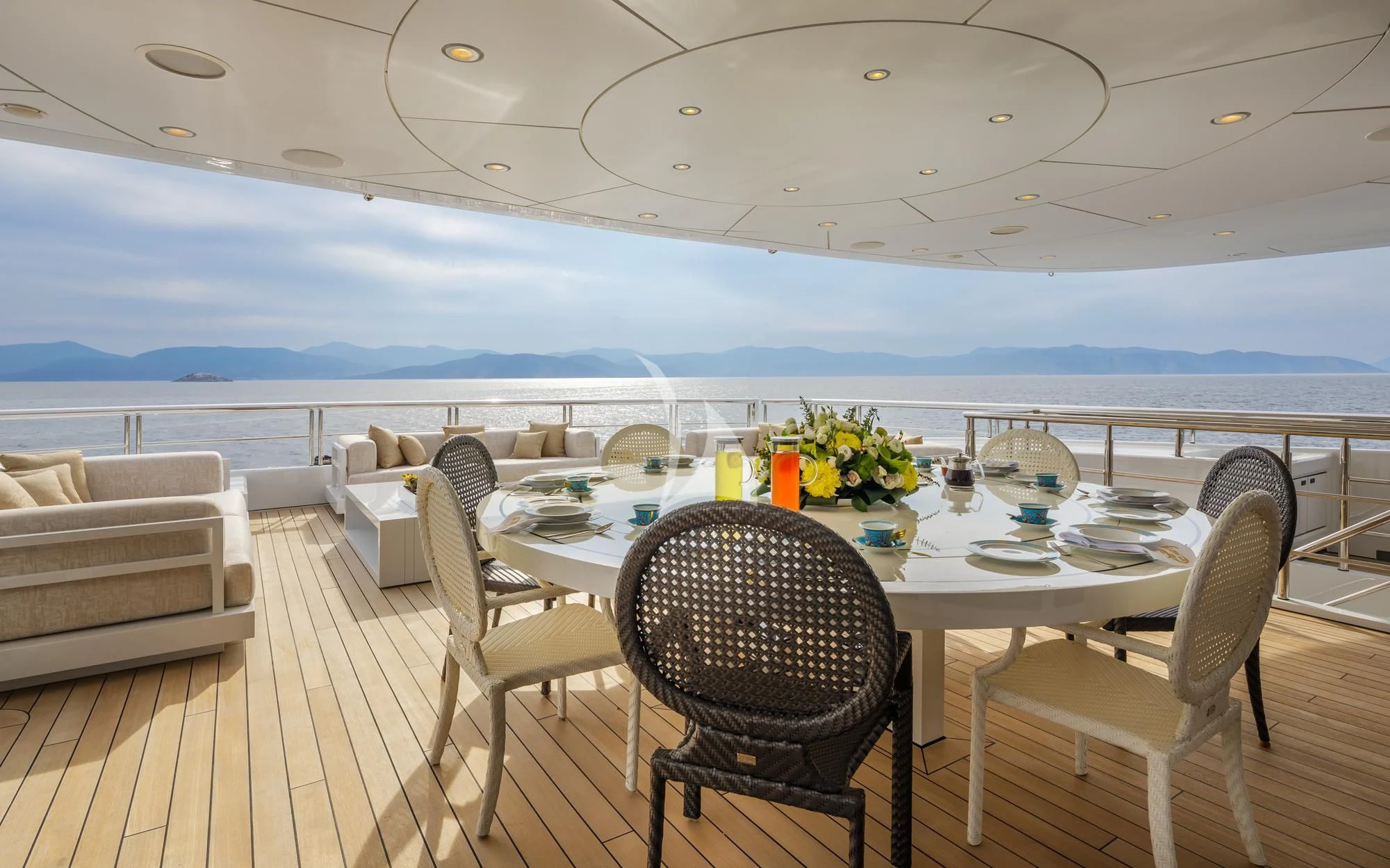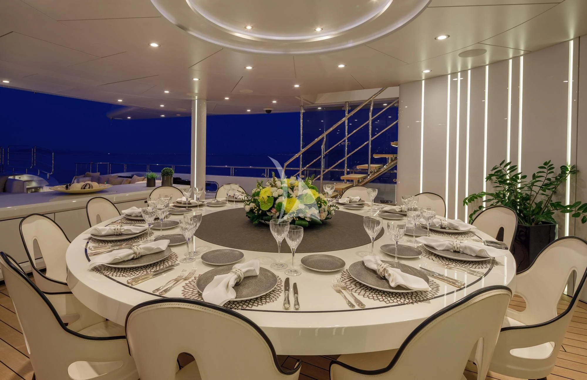 The exterior design of LADY VERA is as captivating as it is elegant. Her steel hull cuts through the waves with grace and precision, while her expansive beam of 39 feet (12.6 meters) provides ample space for onboard amenities and leisure areas. The sundeck invites guests to bask under the sun or enjoy alfresco dining with stunning panoramic views. The yacht's standout feature is undoubtedly its helipad, allowing for seamless access from air to sea, demonstrating that no aspect of luxury has been overlooked.