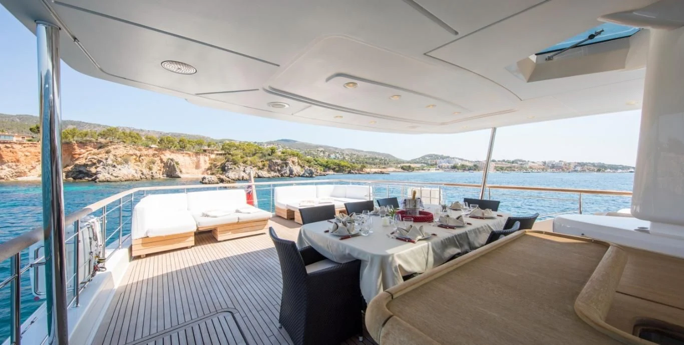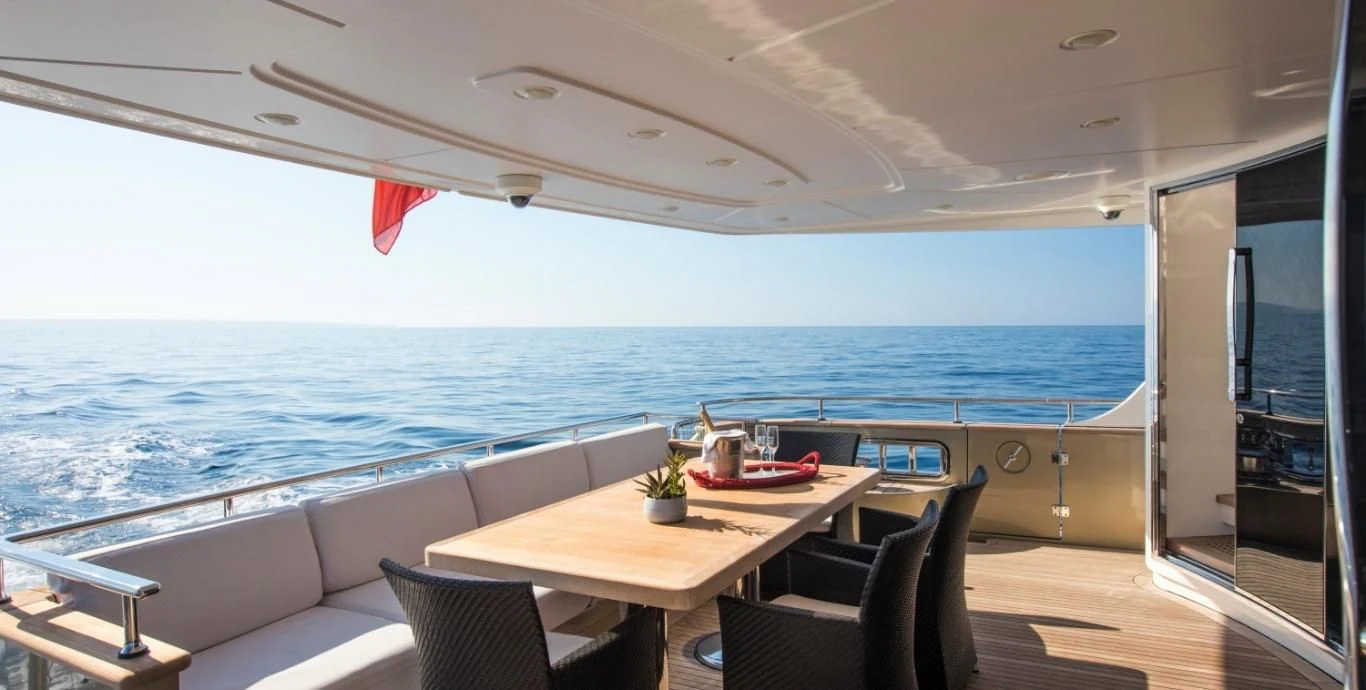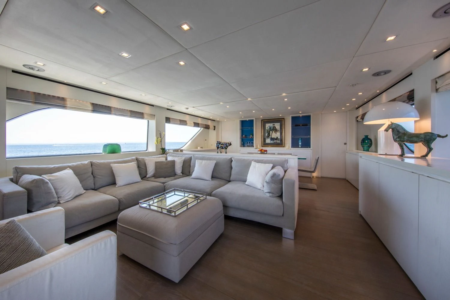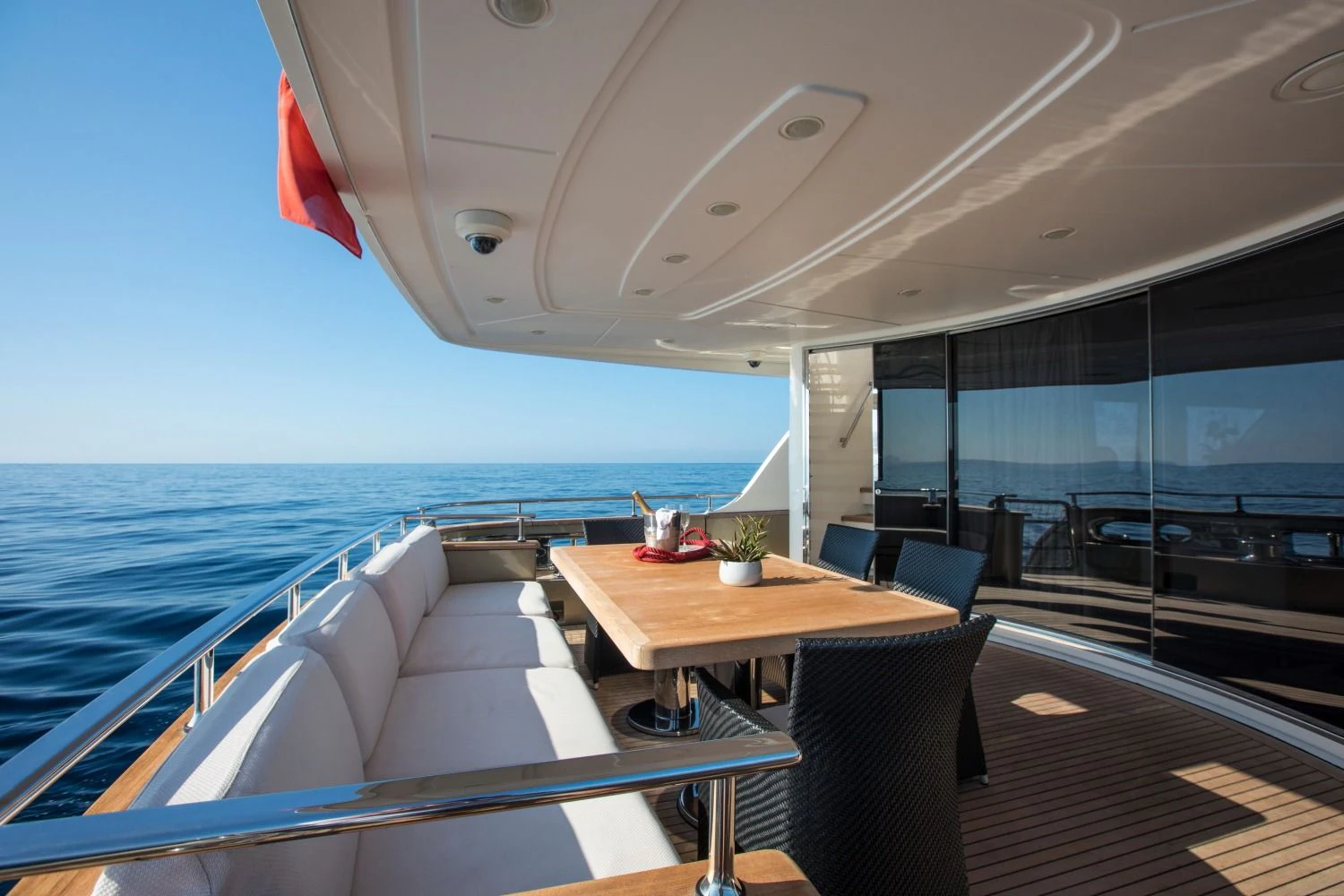 Motor yacht SASPA features a large flybridge with a lovely lounge space aft, where days can be enjoyed lazing and enjoying sea breezes and sunshine. The yacht’s flybridge and main deck aft are both ideal for relishing endless views while dining alfresco.