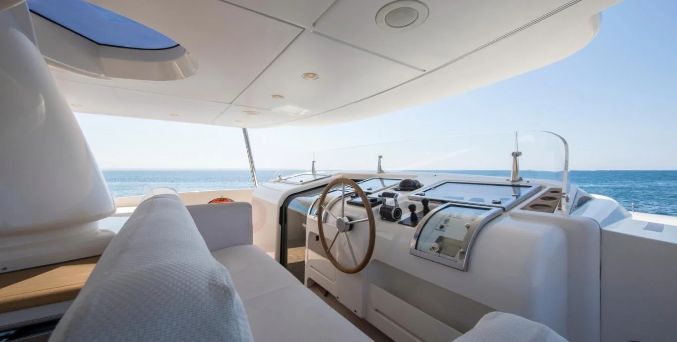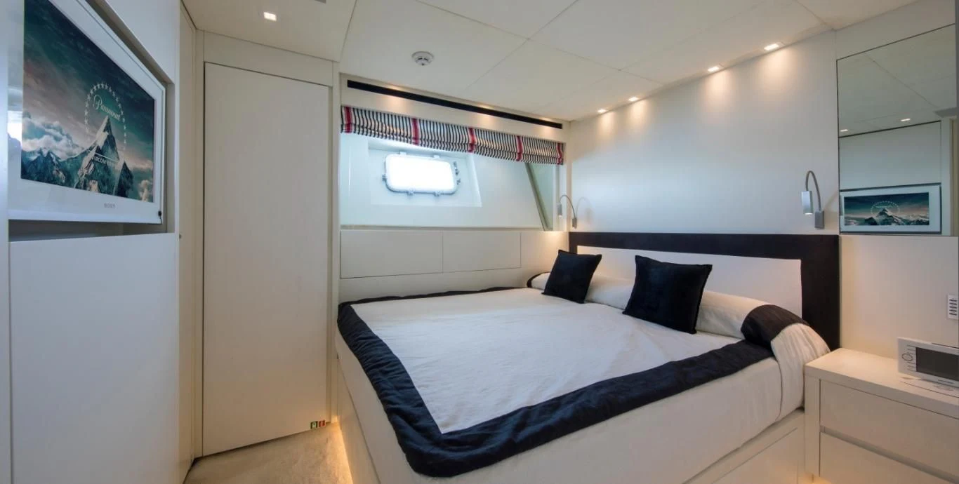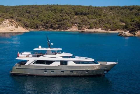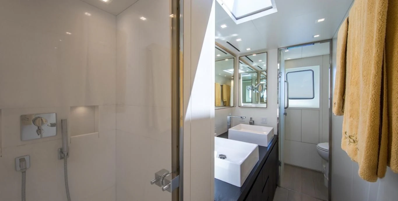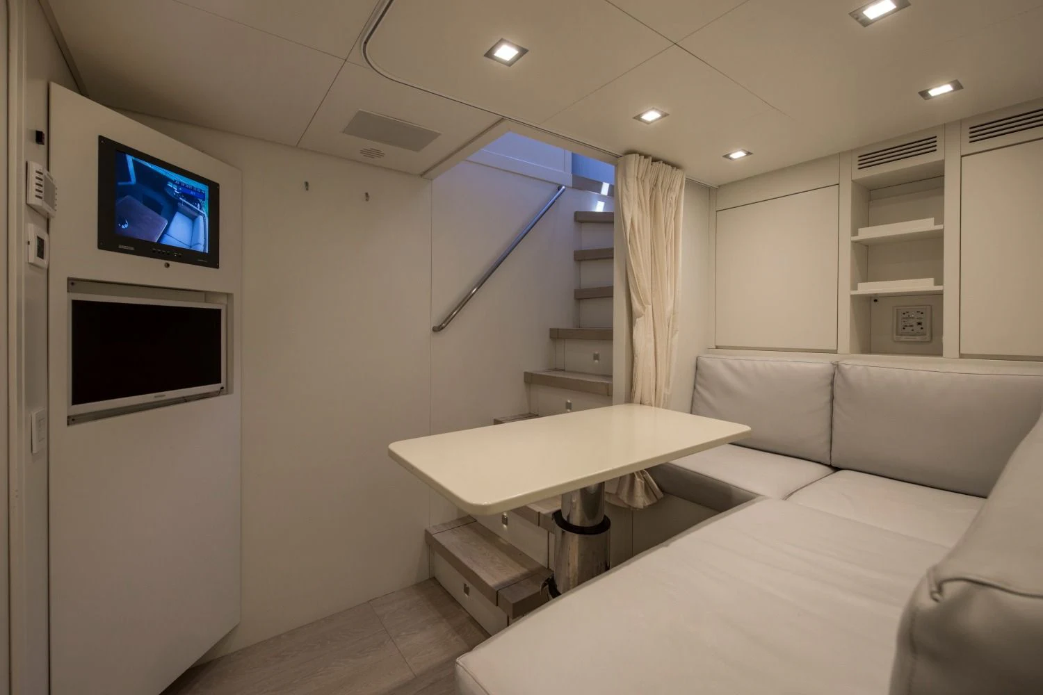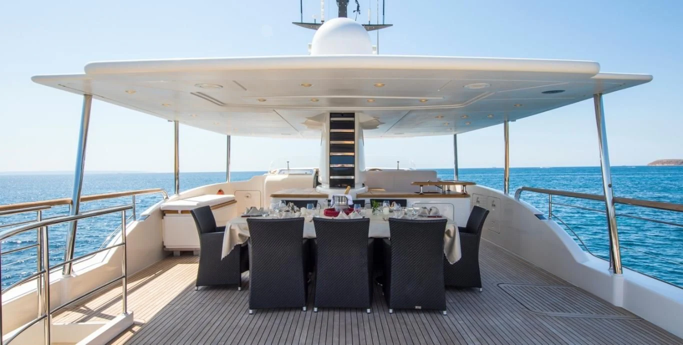 Motor yacht SASPA features a large flybridge with a lovely lounge space aft, where days can be enjoyed lazing and enjoying sea breezes and sunshine. The yacht’s flybridge and main deck aft are both ideal for relishing endless views while dining alfresco.