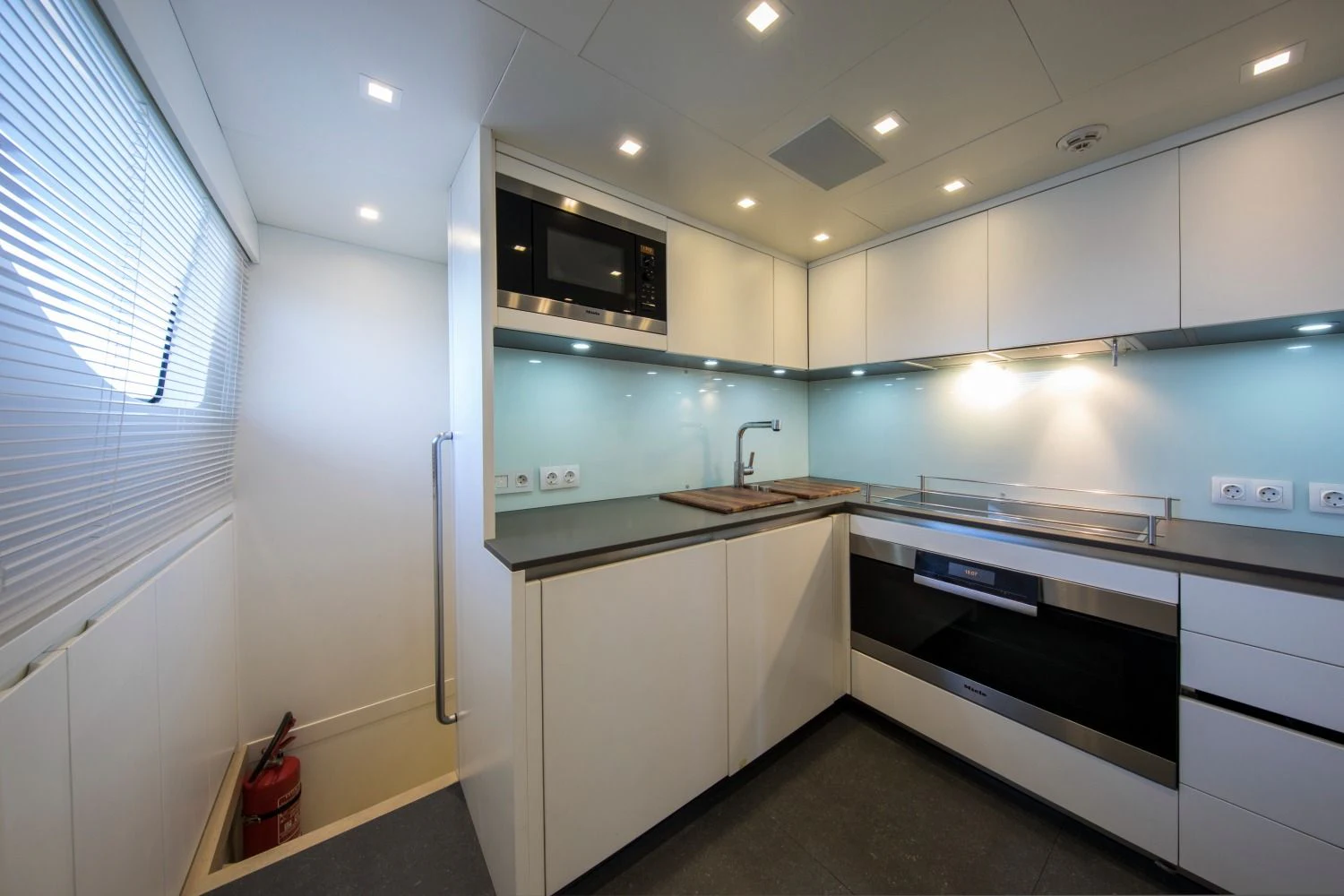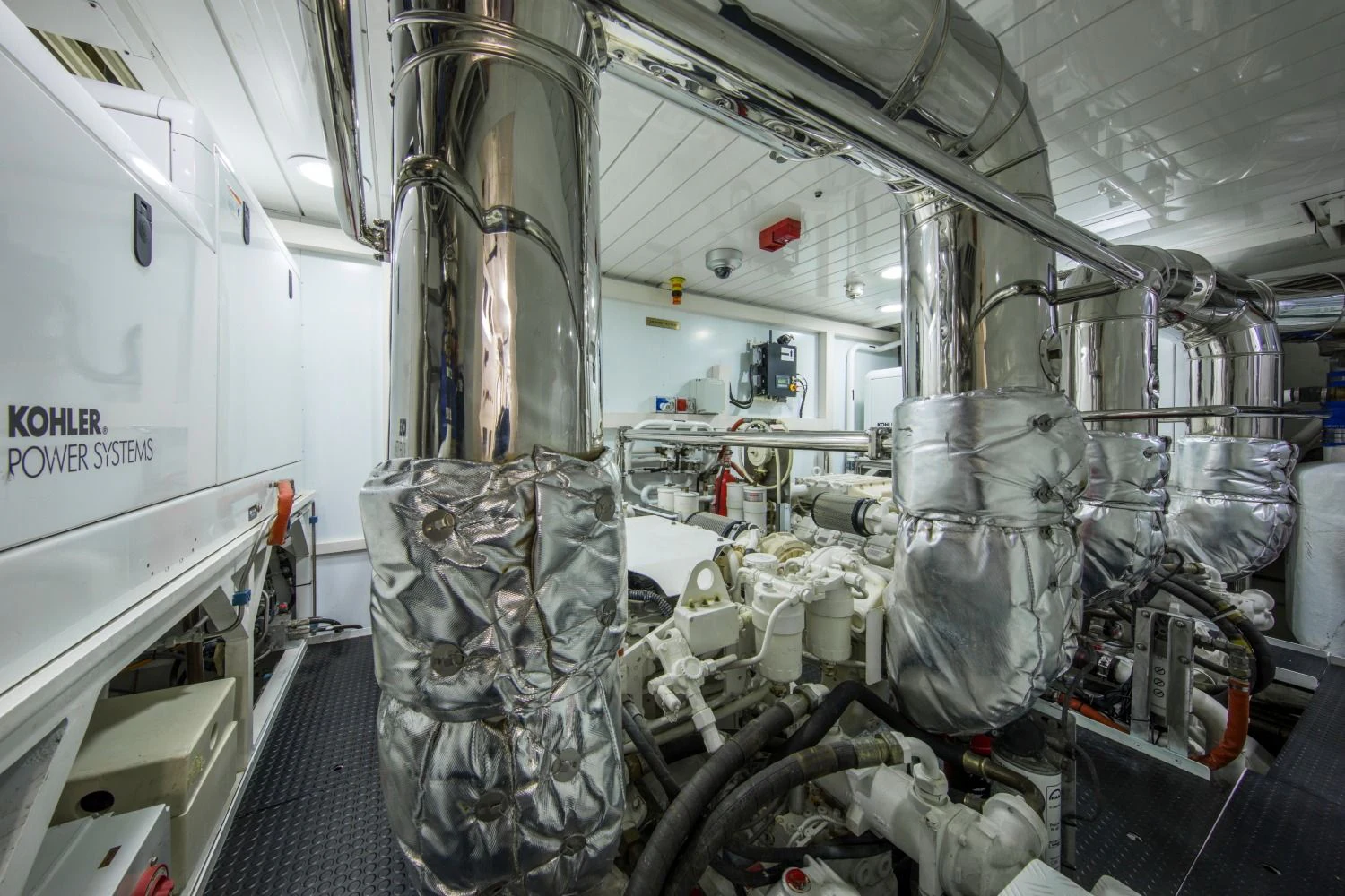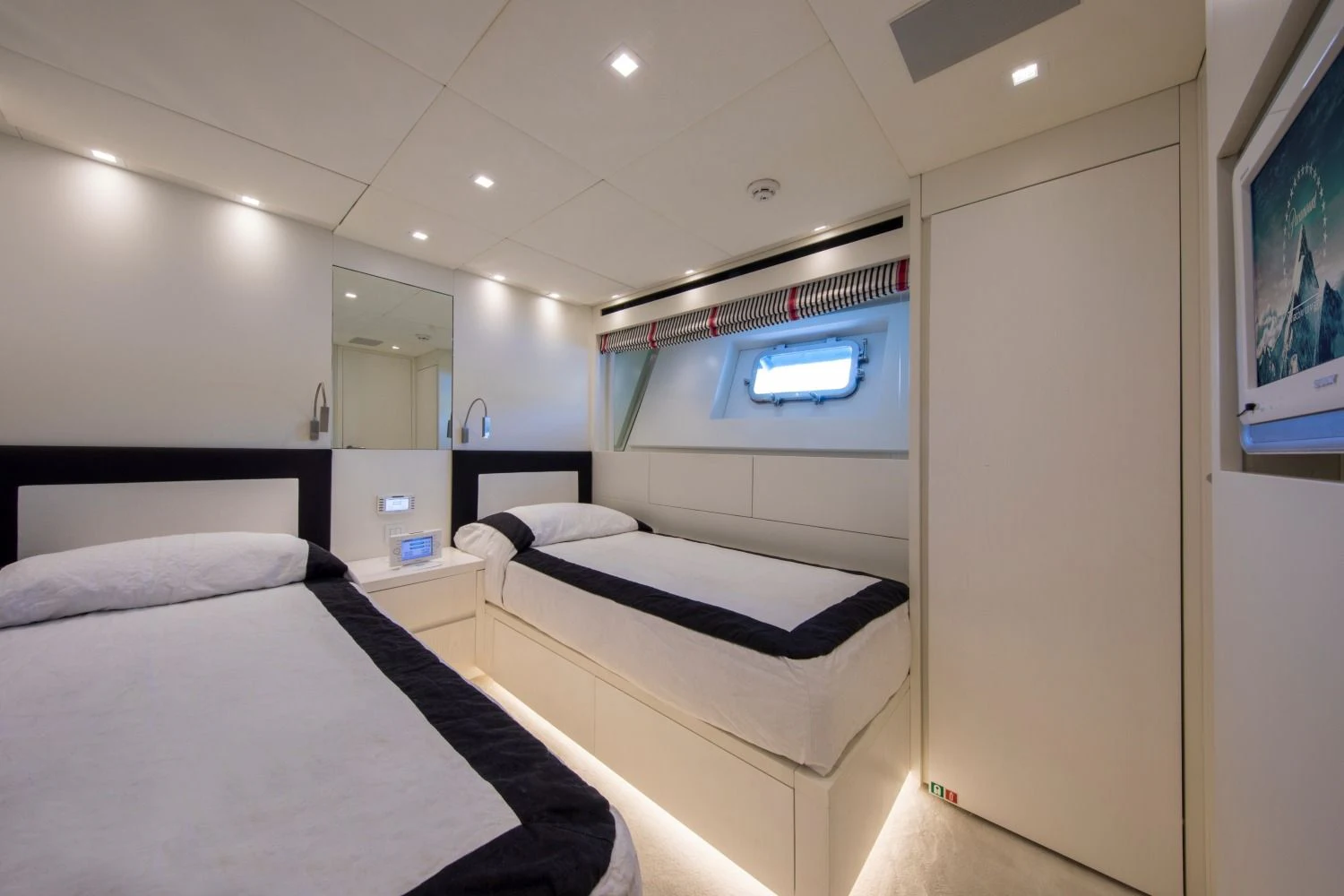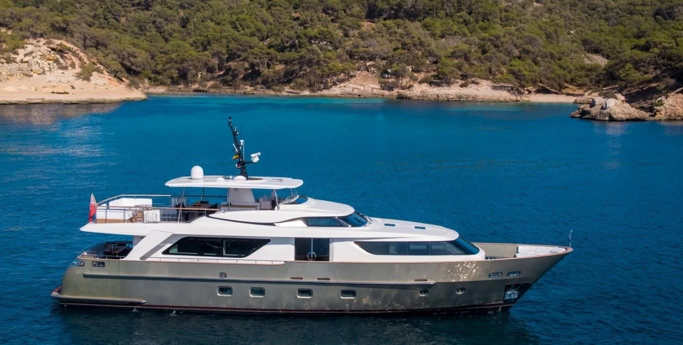 Motor yacht SASPA features a large flybridge with a lovely lounge space aft, where days can be enjoyed lazing and enjoying sea breezes and sunshine. The yacht’s flybridge and main deck aft are both ideal for relishing endless views while dining alfresco.