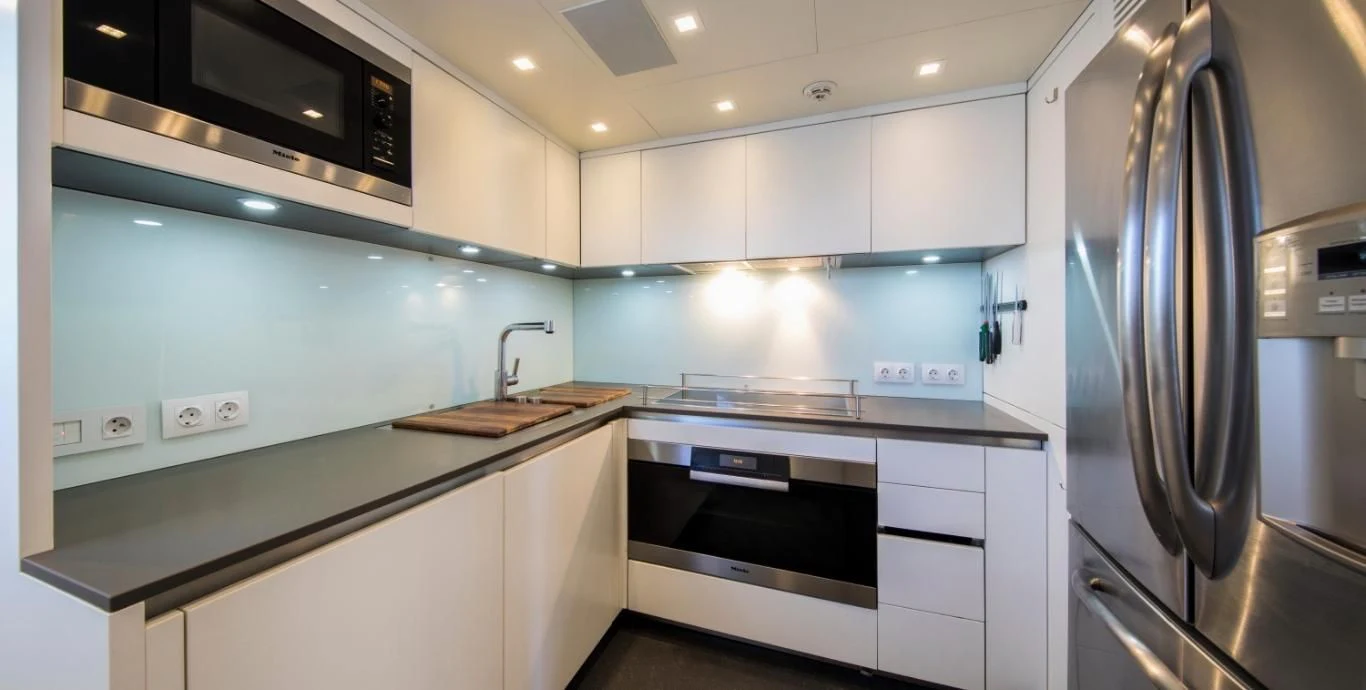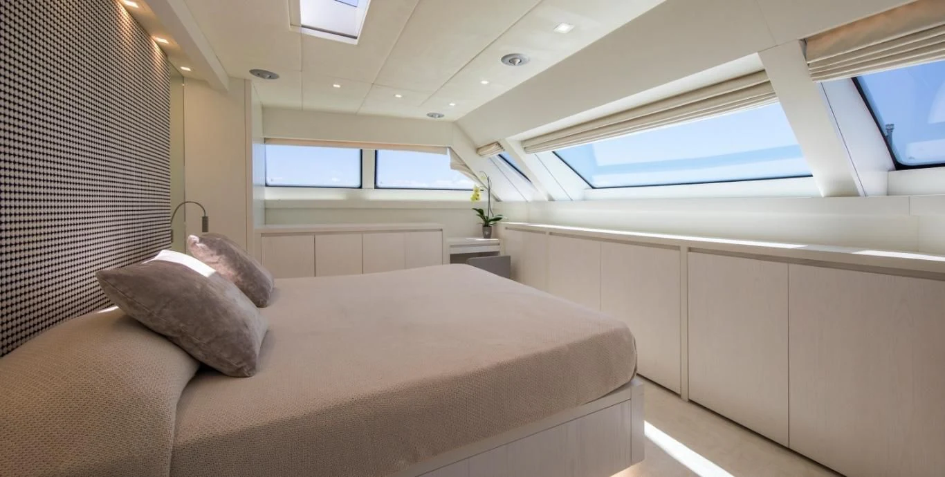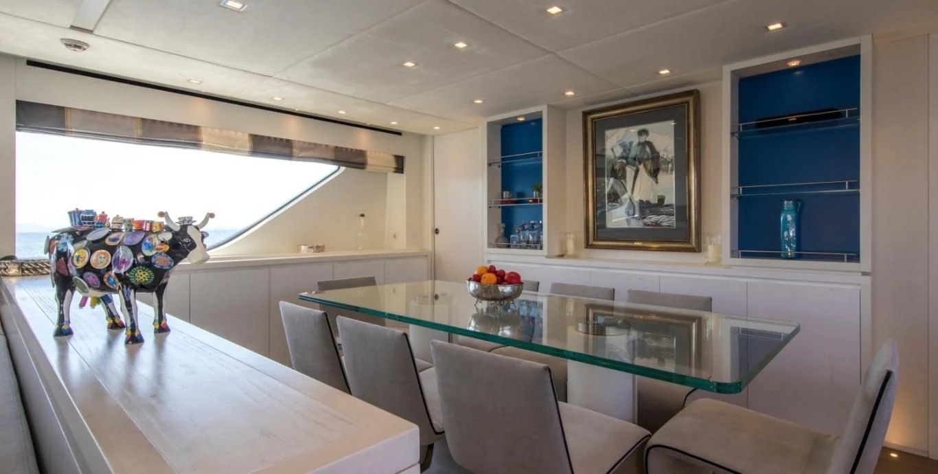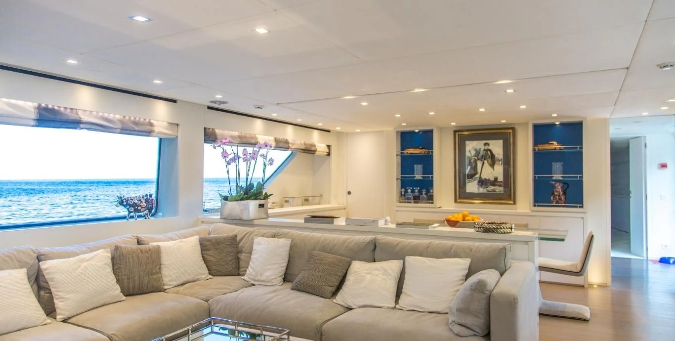 Designed by Tiziana Vercelessi, the yacht’s contemporary interior has a minimalist design, which plays splashes of color on white. Throughout SASPA are large windows, which fill the space with natural light. The salon offers a separate dining area from the plush L-shaped sofa, which makes it easy to entertain friends and family.