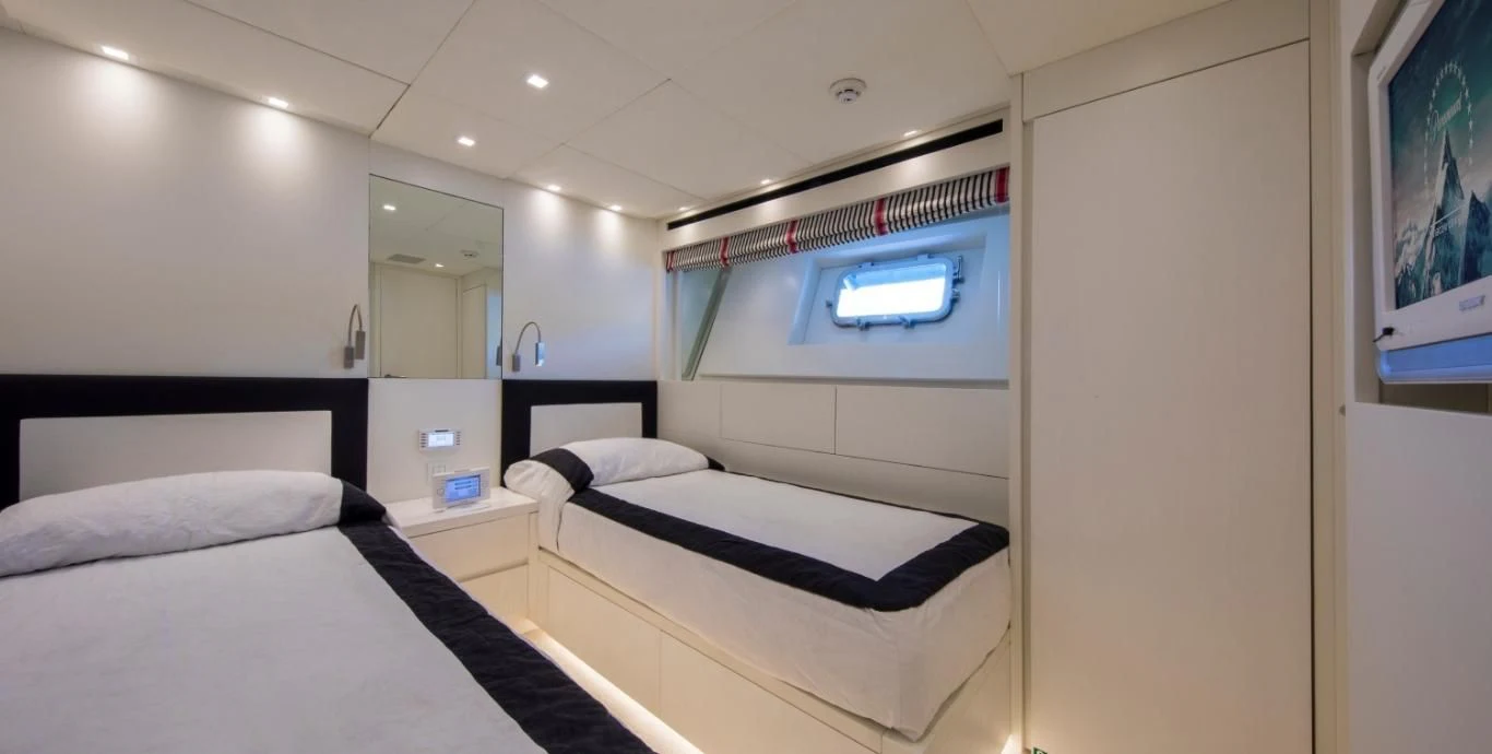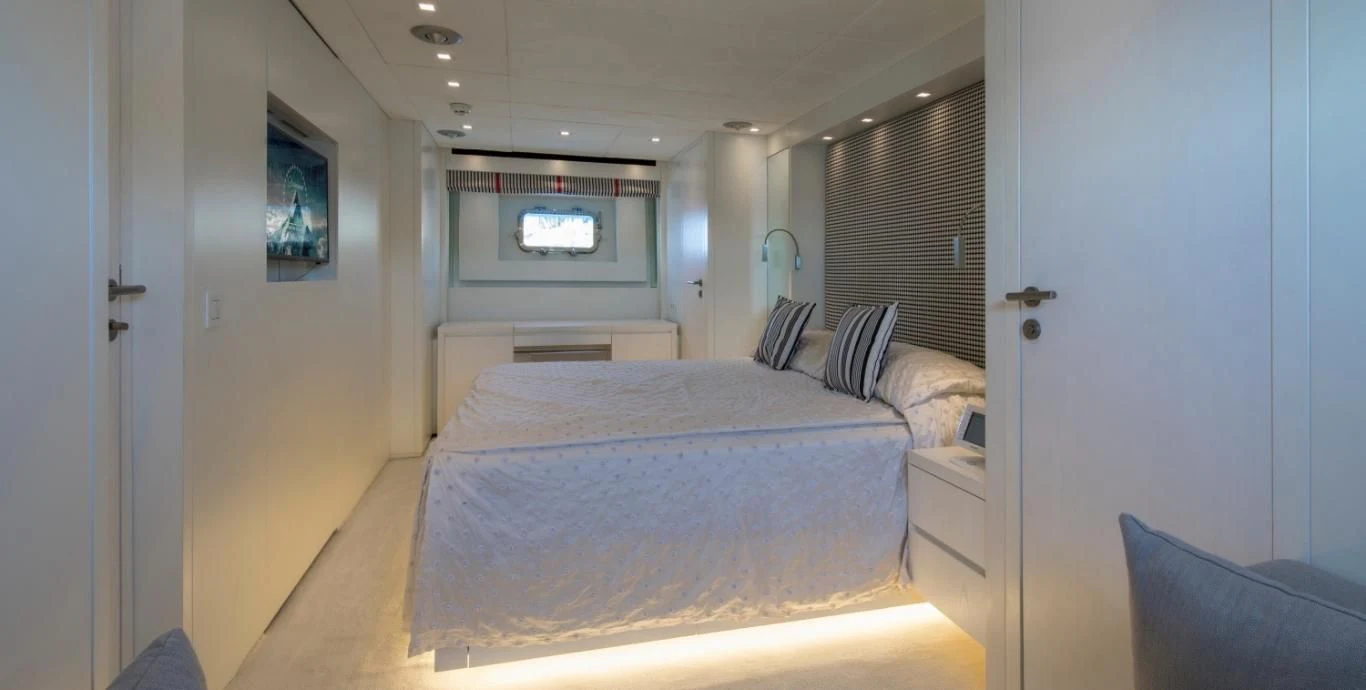 SASPA showcases four beautifully appointed staterooms, accommodating eight guests. Her main deck master offers impressive views from expansive windows that surround. The room is complete with a king-size bed, a dressing room and an en-suite bath with a shower. The luxury yacht’s additional staterooms include a full-beam VIP with a king-size bed, a double-bed stateroom and a twin-bed stateroom — each has an en-suite bath with a shower.